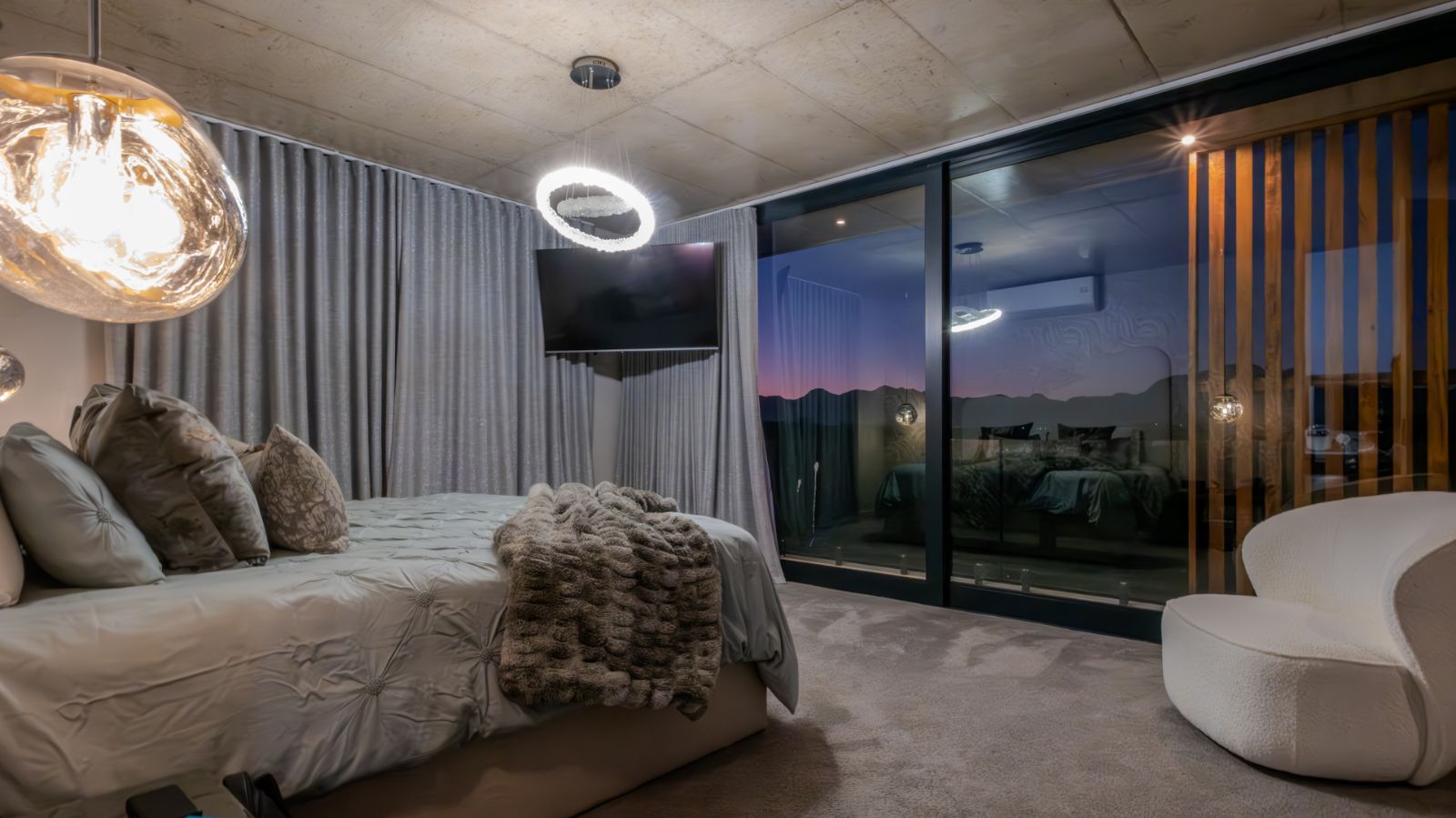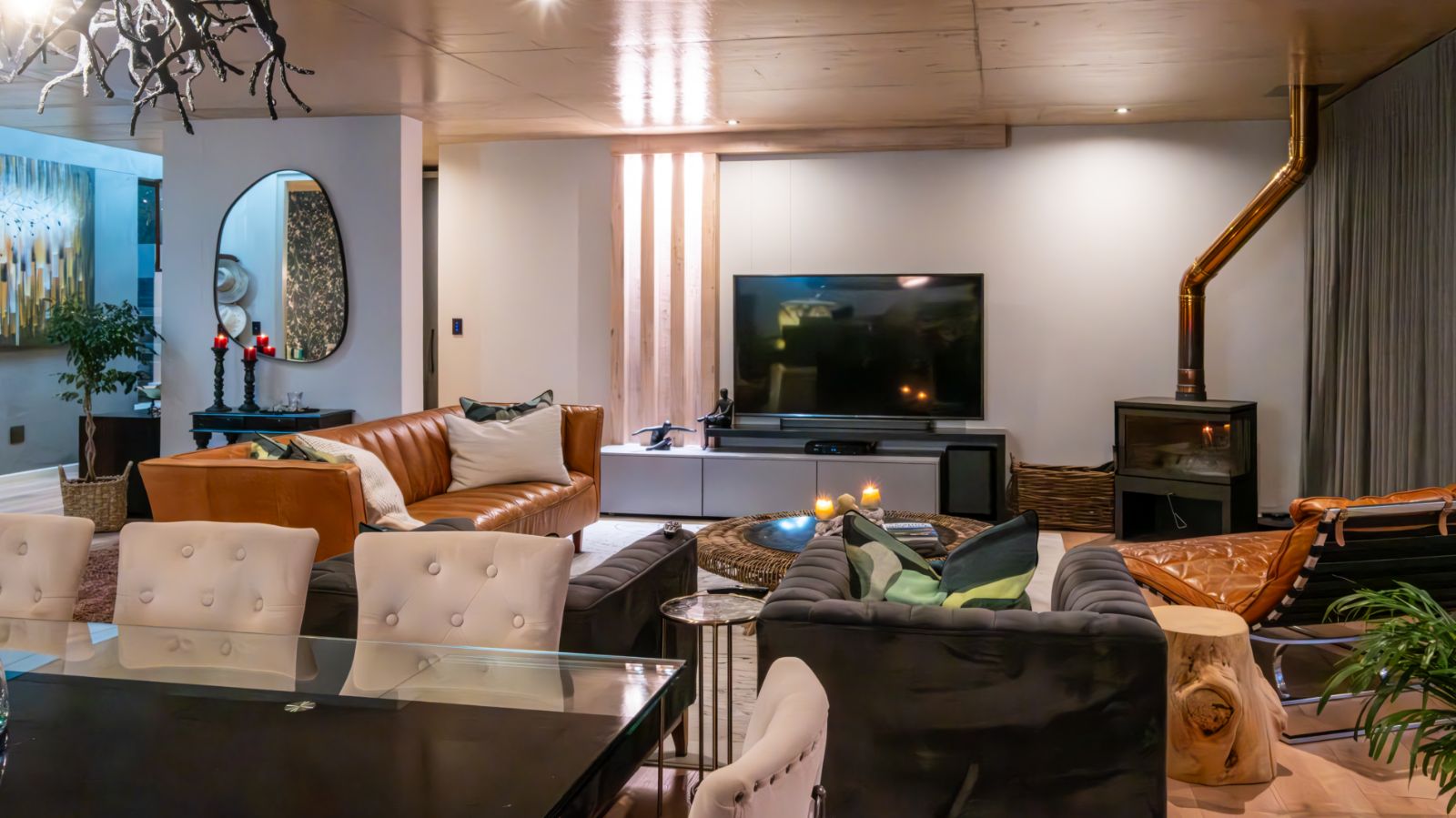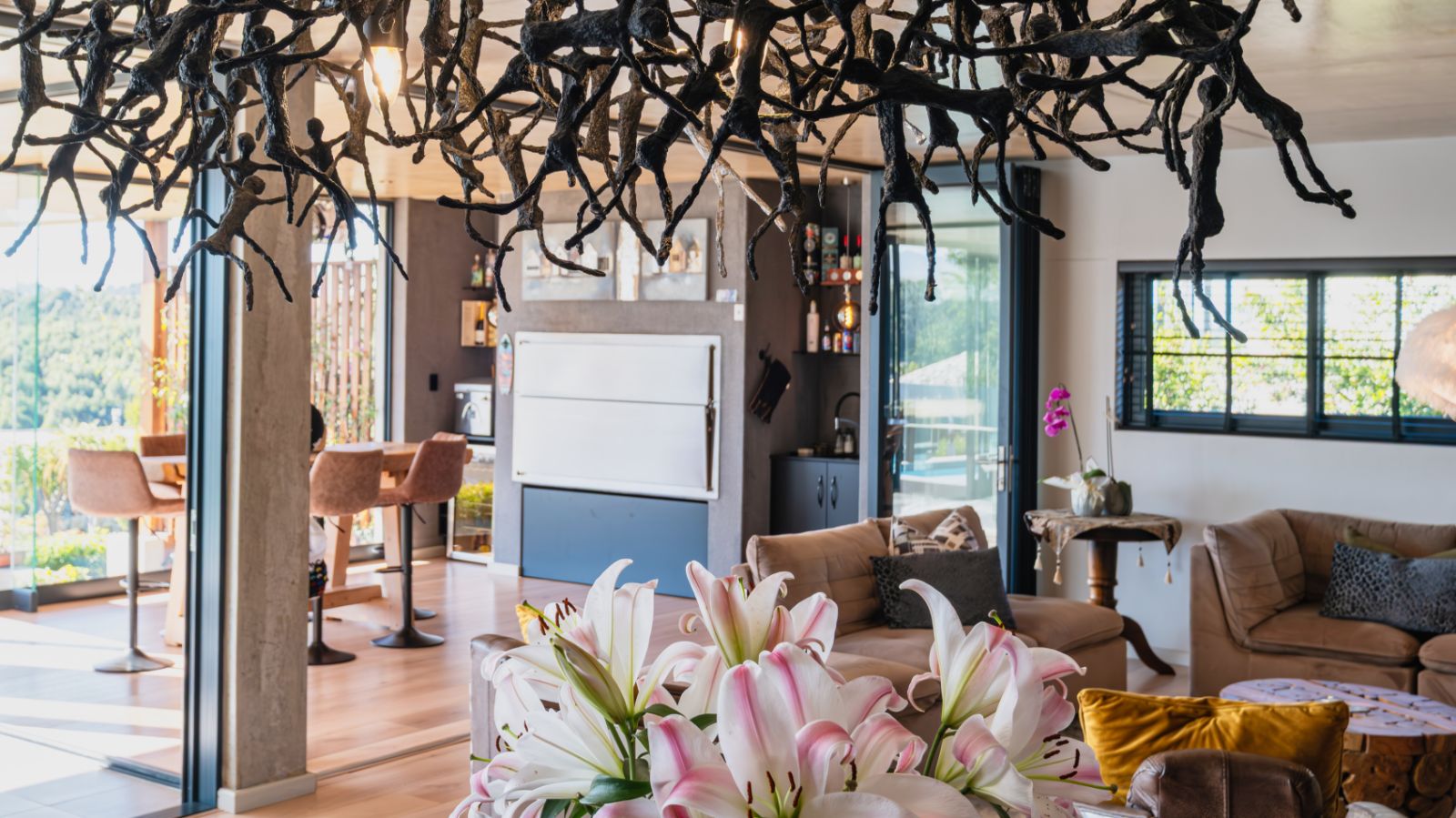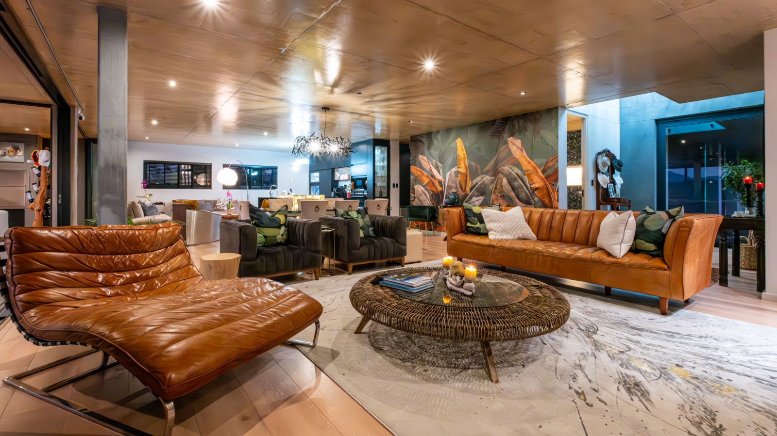 The entertainment journey continues through a spacious lounge that leads to a sophisticated braai room, complete with built-in braai and floor-to-ceiling glass windows framing a tranquil zen garden. To the left, a luxurious entertainment wing includes a lounge area and pool table space, with large stackable glass doors opening onto the sun-drenched pool deck. Outside, a contemporary boma fire pit and modern swimming pool create the perfect setting for evening relaxation — all north-facing to take in breathtaking mountain vistas.