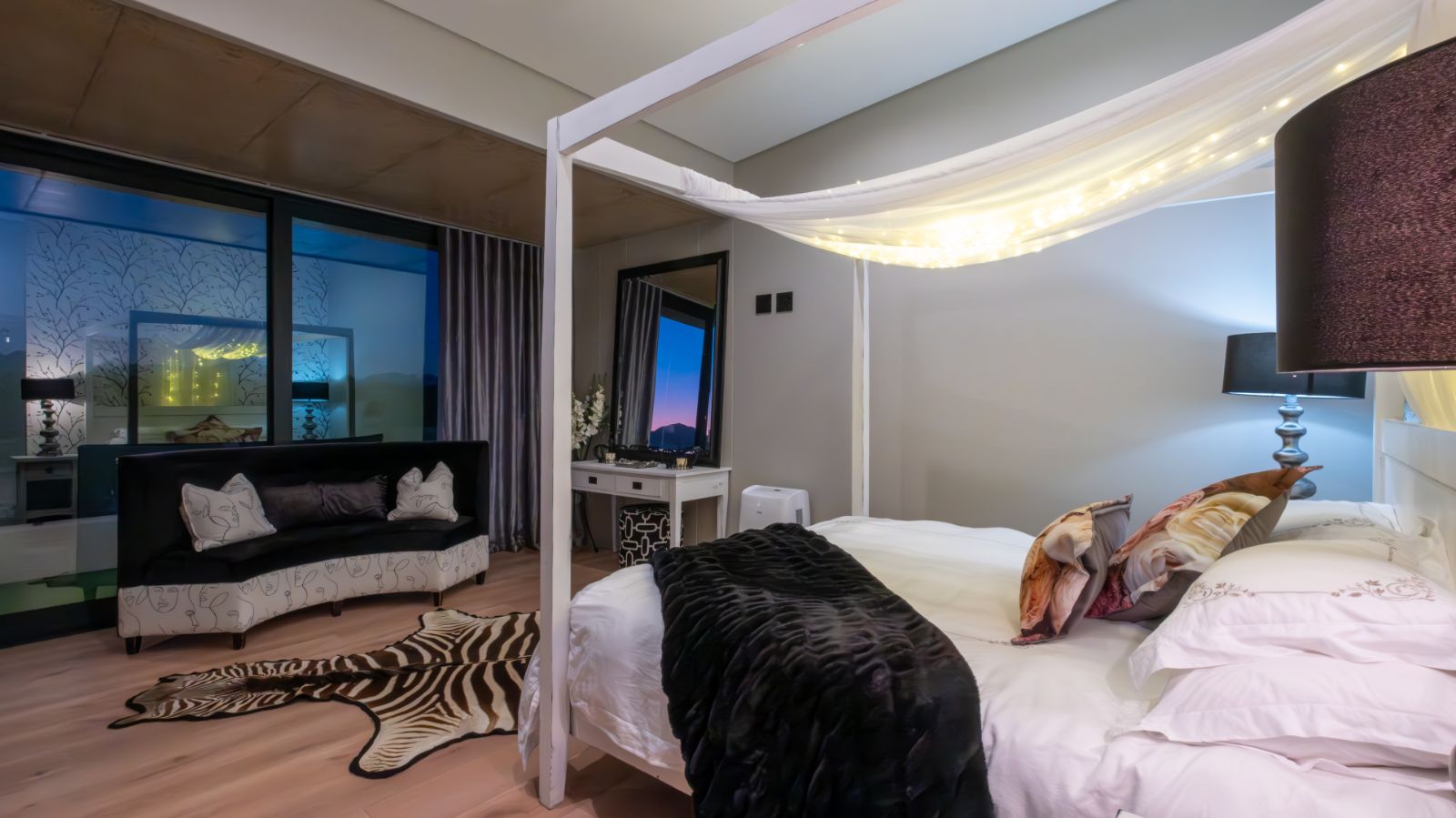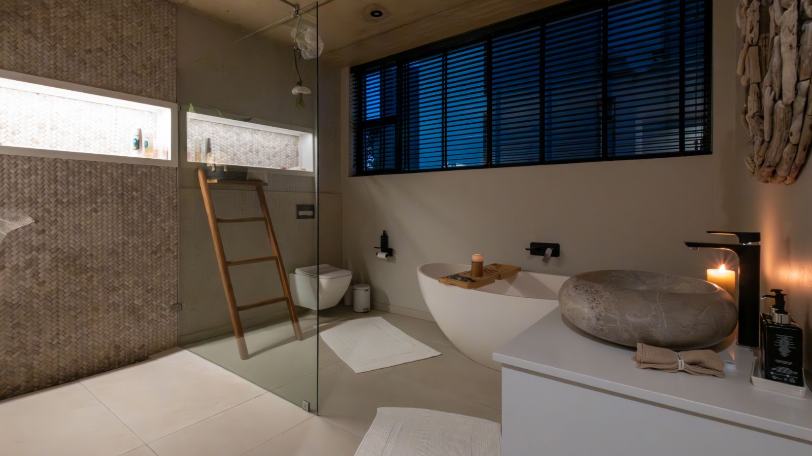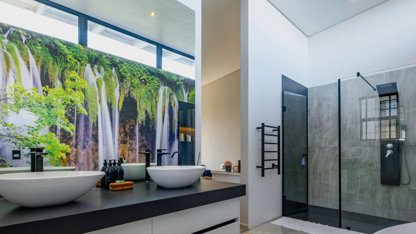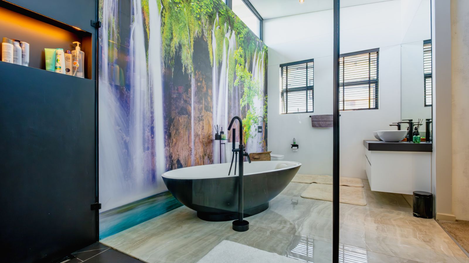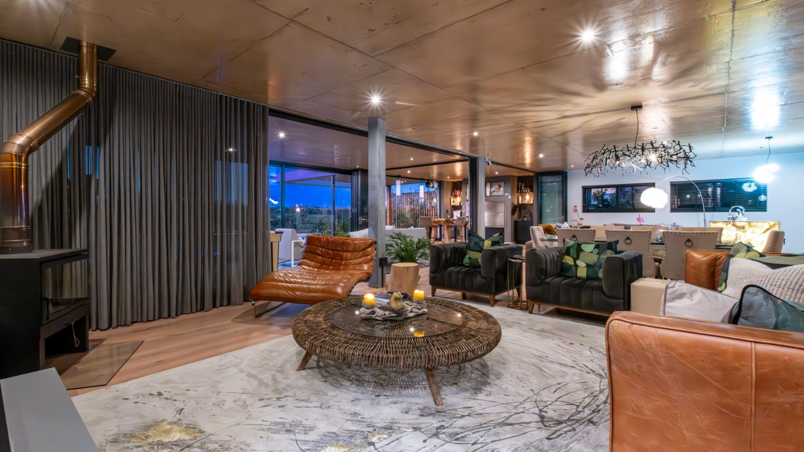 The entertainment journey continues through a spacious lounge that leads to a sophisticated braai room, complete with built-in braai and floor-to-ceiling glass windows framing a tranquil zen garden. To the left, a luxurious entertainment wing includes a lounge area and pool table space, with large stackable glass doors opening onto the sun-drenched pool deck. Outside, a contemporary boma fire pit and modern swimming pool create the perfect setting for evening relaxation — all north-facing to take in breathtaking mountain vistas.
