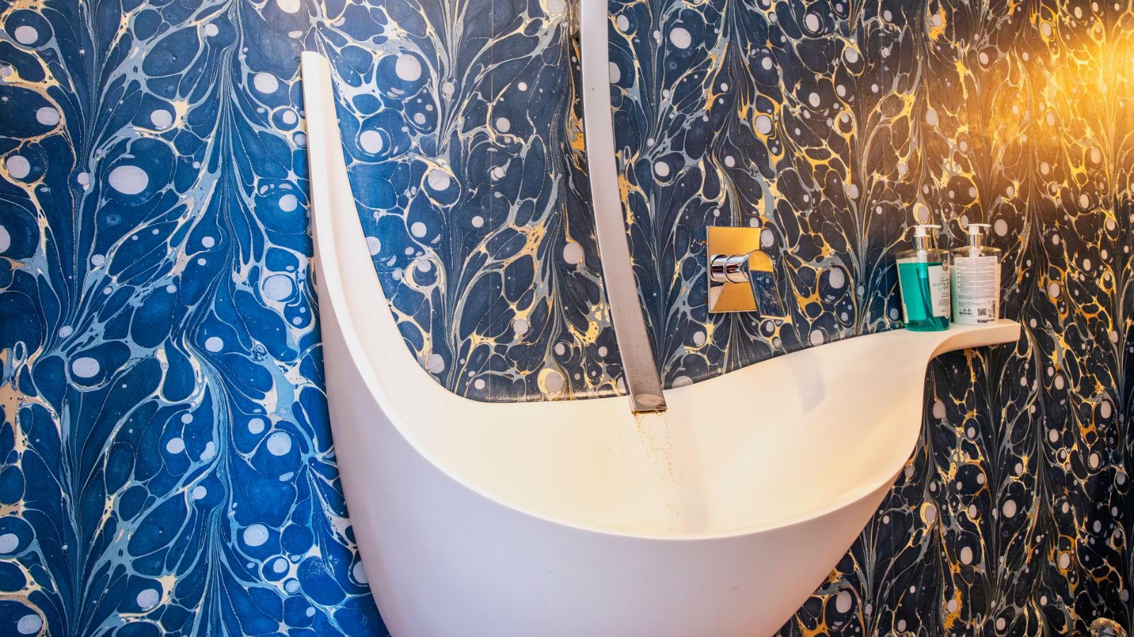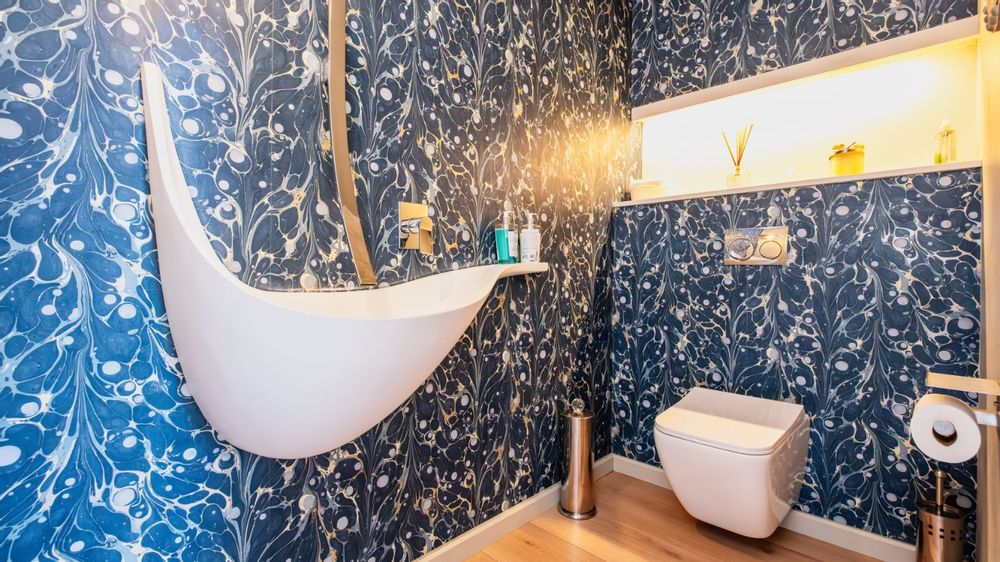 To the right, a stylish guest cloakroom features a polished designer basin. Moving forward, the living area unfolds with three distinct, yet seamlessly connected zones: a cozy TV lounge with a fireplace, a central dining space ideal for entertaining, and an ultra-modern kitchen fitted with high-end appliances and sleek finishes. The adjacent scullery provides additional workspace and direct access to the triple garage.