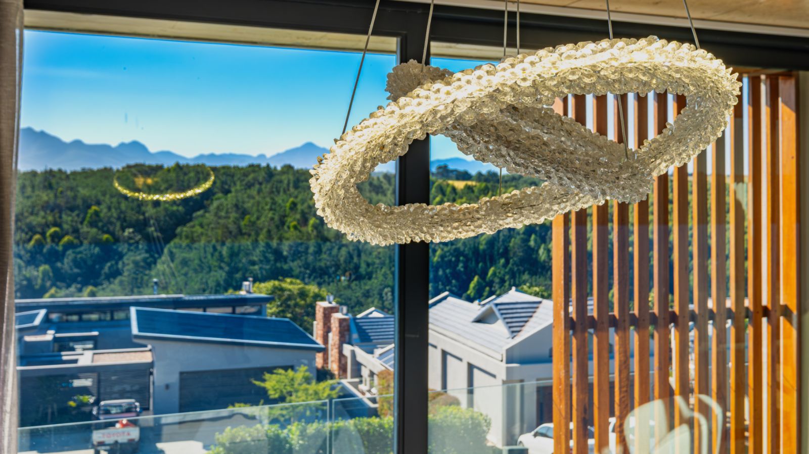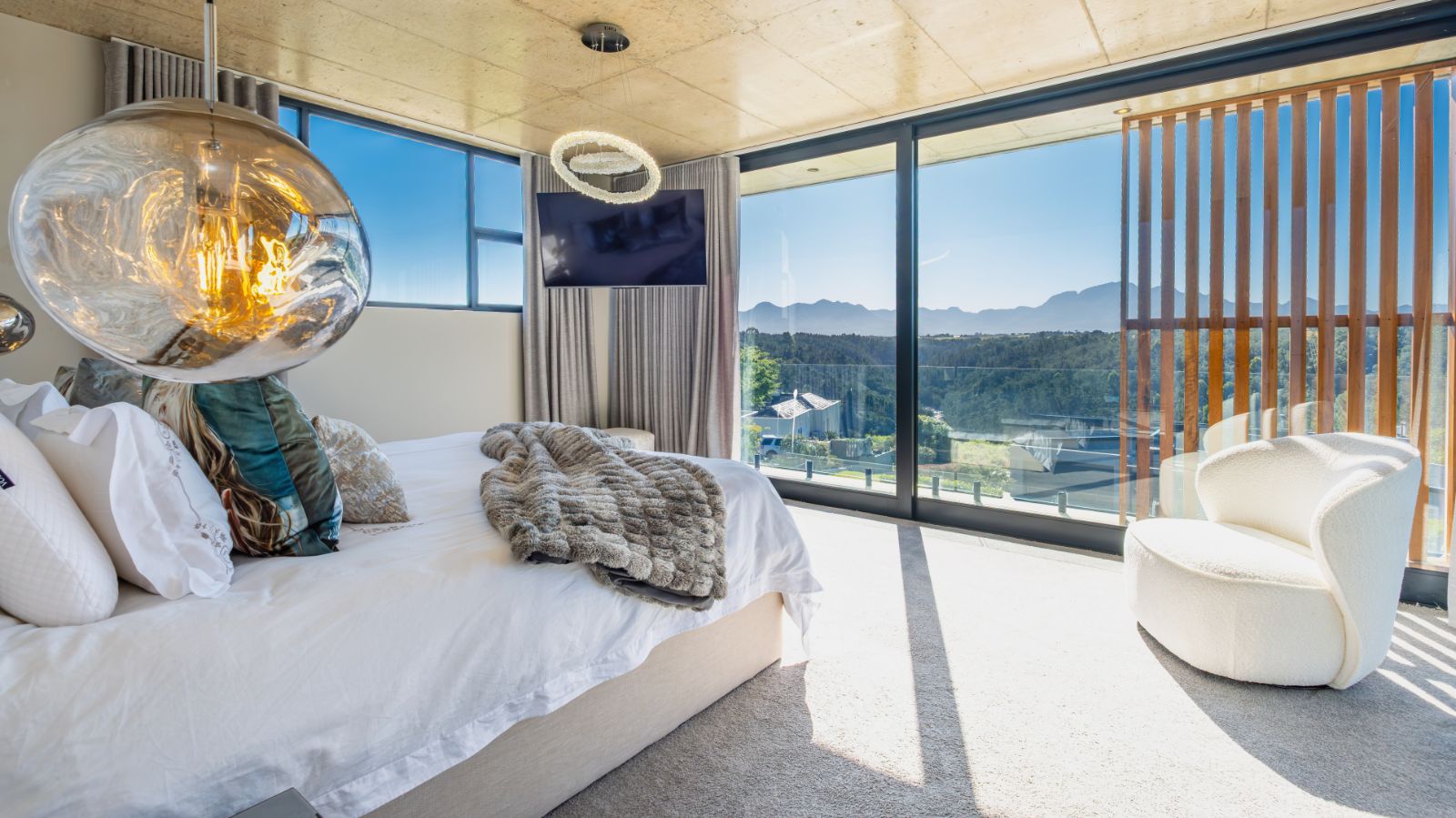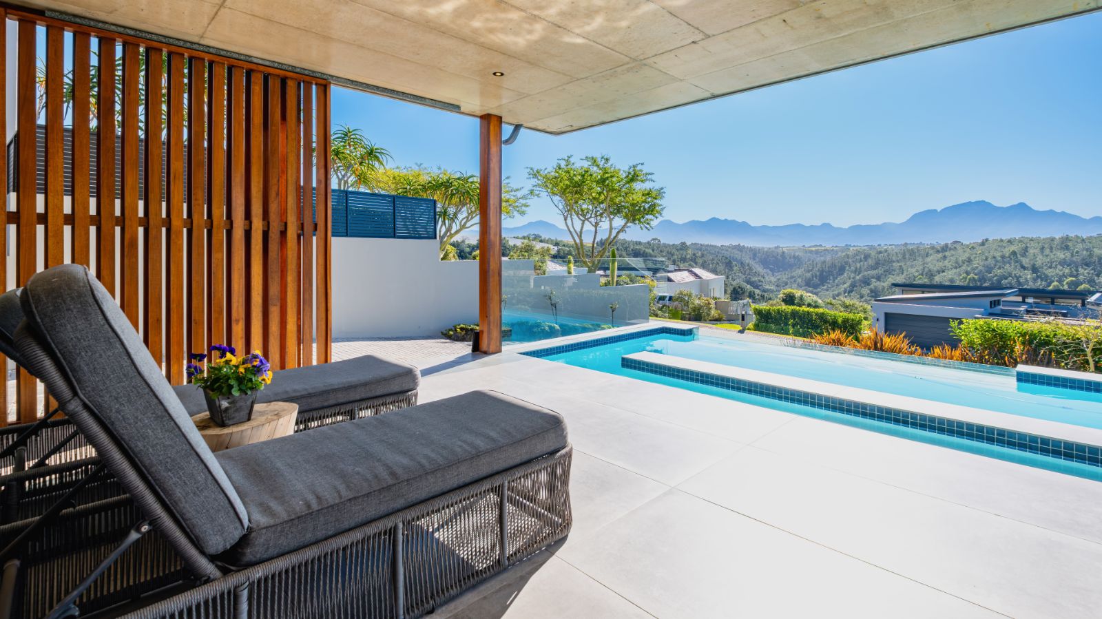 Upstairs, the home invites you into a plush theatre-style pajama lounge. To the left, the master bedroom is a private retreat with panoramic views of the Outeniqua range and Gwaing River, a large walk-in dressing room, and a luxurious en-suite bathroom. To the right, the third bedroom offers its own en-suite bathroom and shares access to a mountain-view balcony.