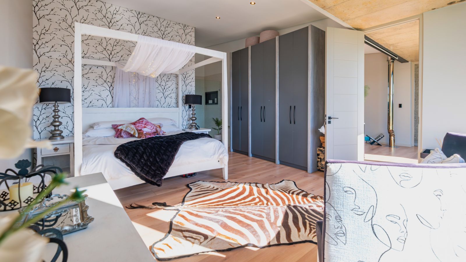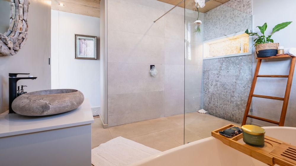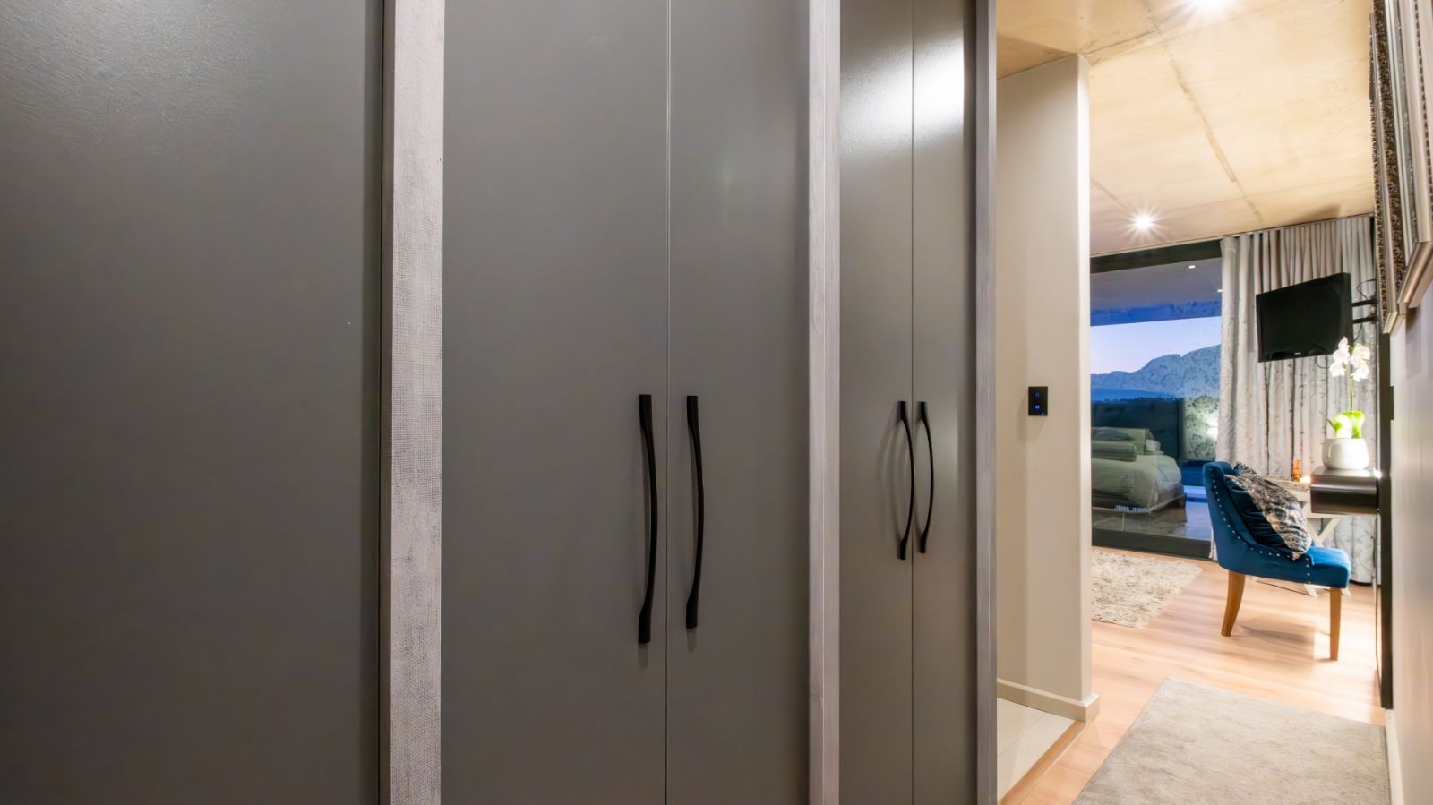 Upstairs, the home invites you into a plush theatre-style pajama lounge. To the left, the master bedroom is a private retreat with panoramic views of the Outeniqua range and Gwaing River, a large walk-in dressing room, and a luxurious en-suite bathroom. To the right, the third bedroom offers its own en-suite bathroom and shares access to a mountain-view balcony.