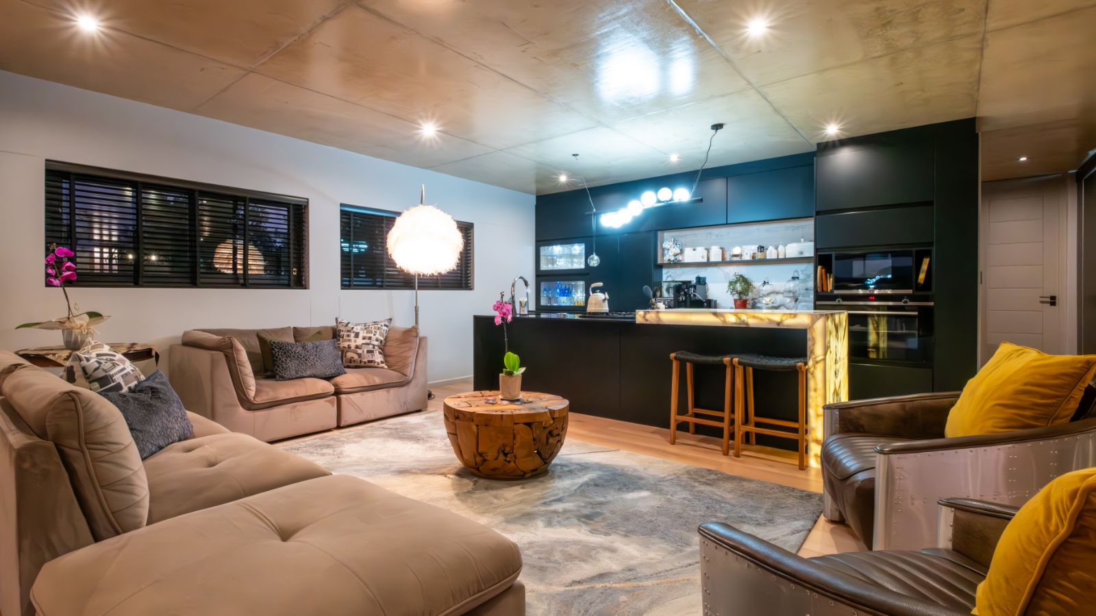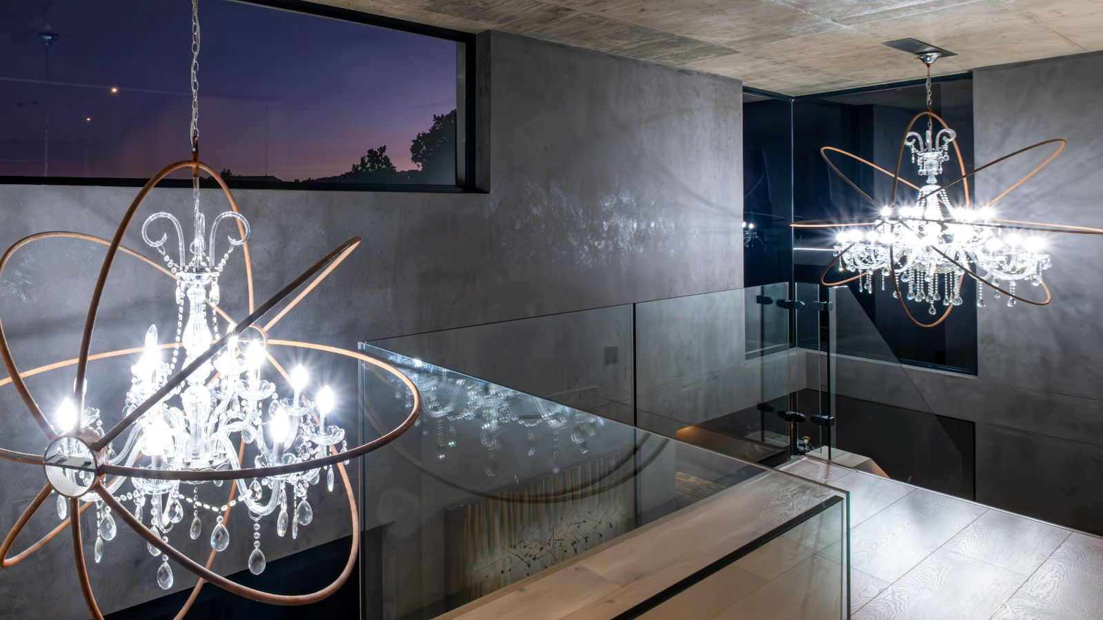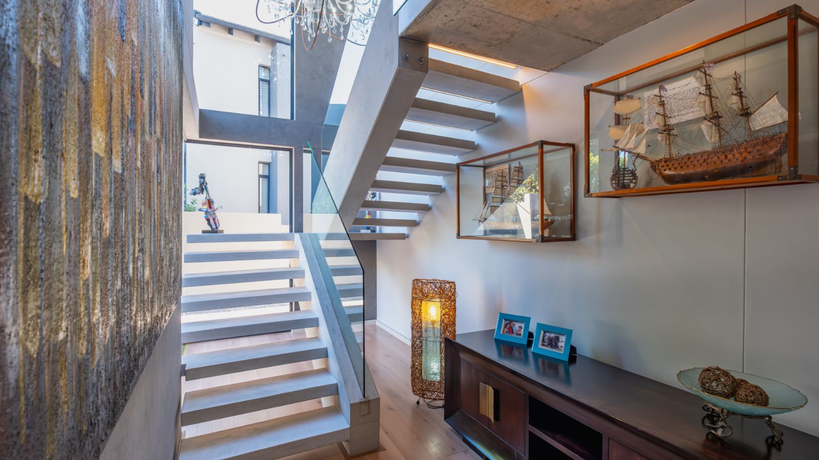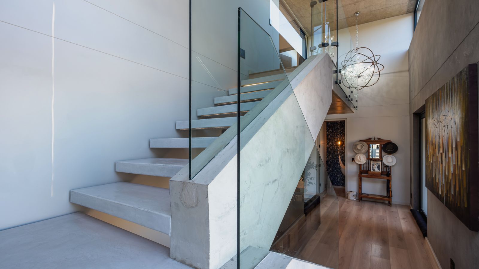 Step into a breathtaking open-plan living space where modern aesthetics meet effortless sophistication. The entrance welcomes you with a floating precast concrete staircase and two statement chandelier lights that set the tone for what lies ahead.