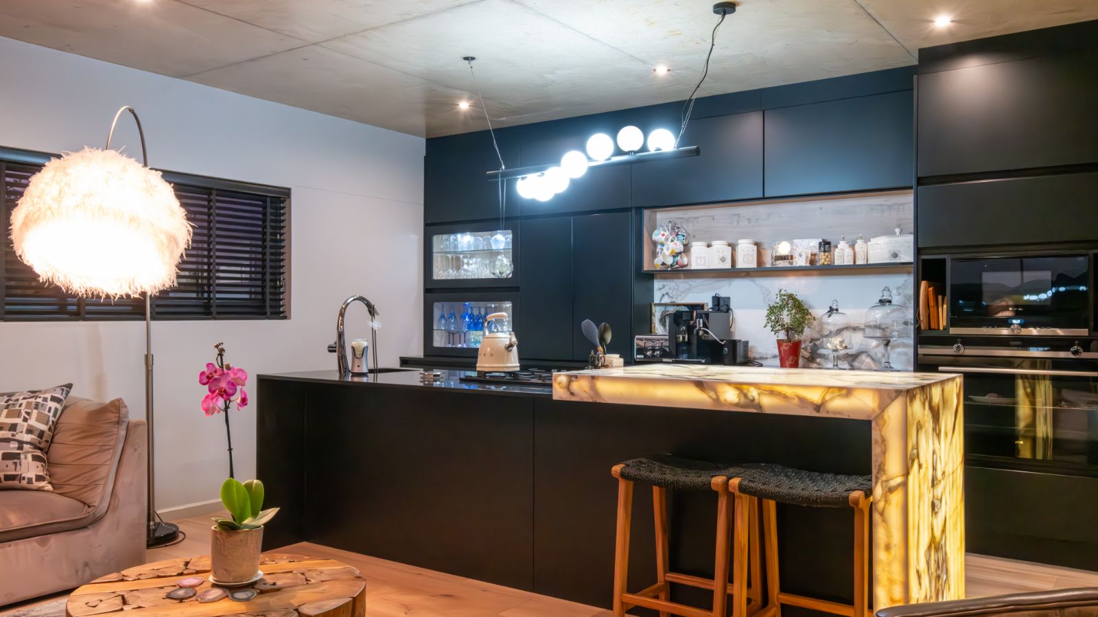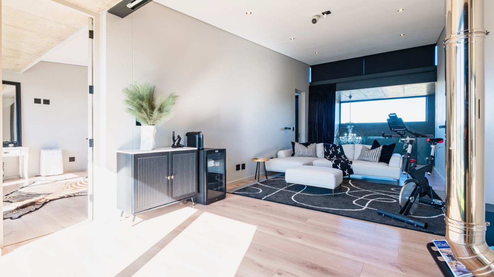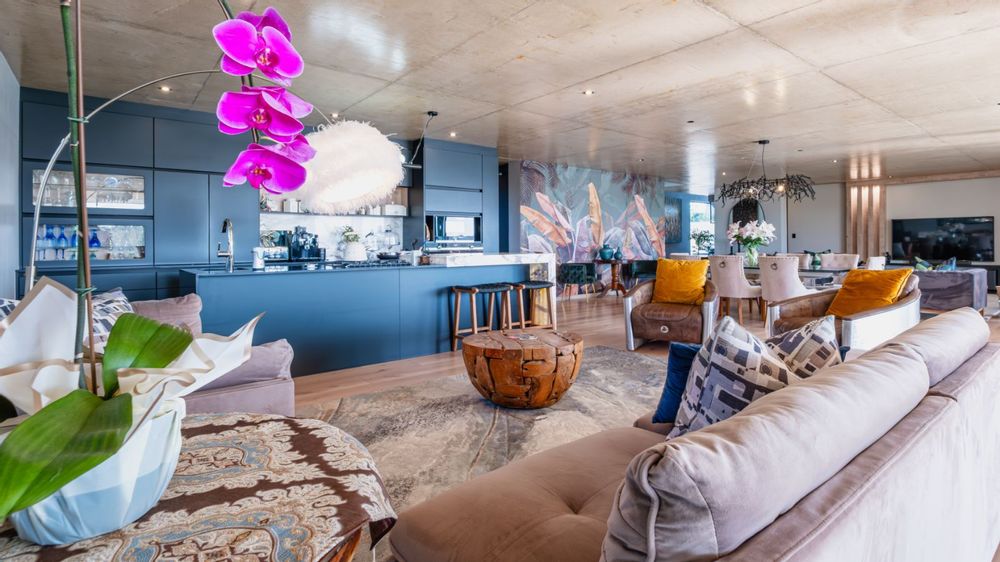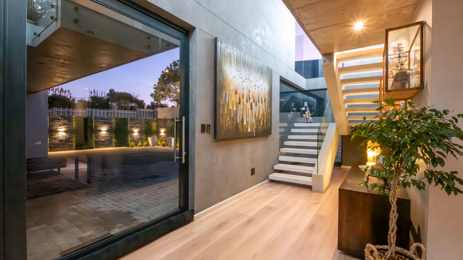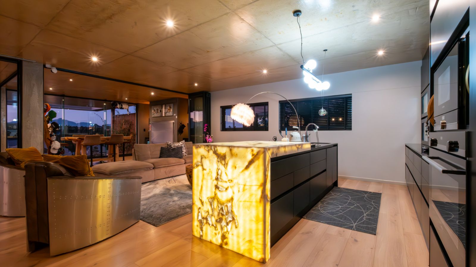 Step into a breathtaking open-plan living space where modern aesthetics meet effortless sophistication. The entrance welcomes you with a floating precast concrete staircase and two statement chandelier lights that set the tone for what lies ahead.