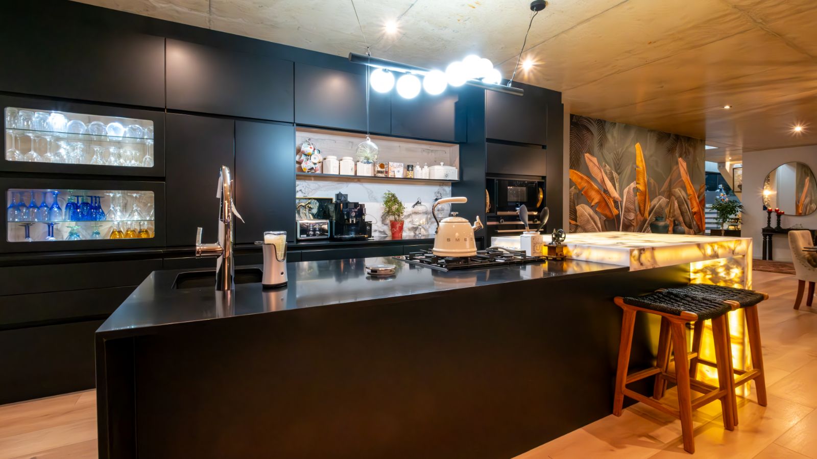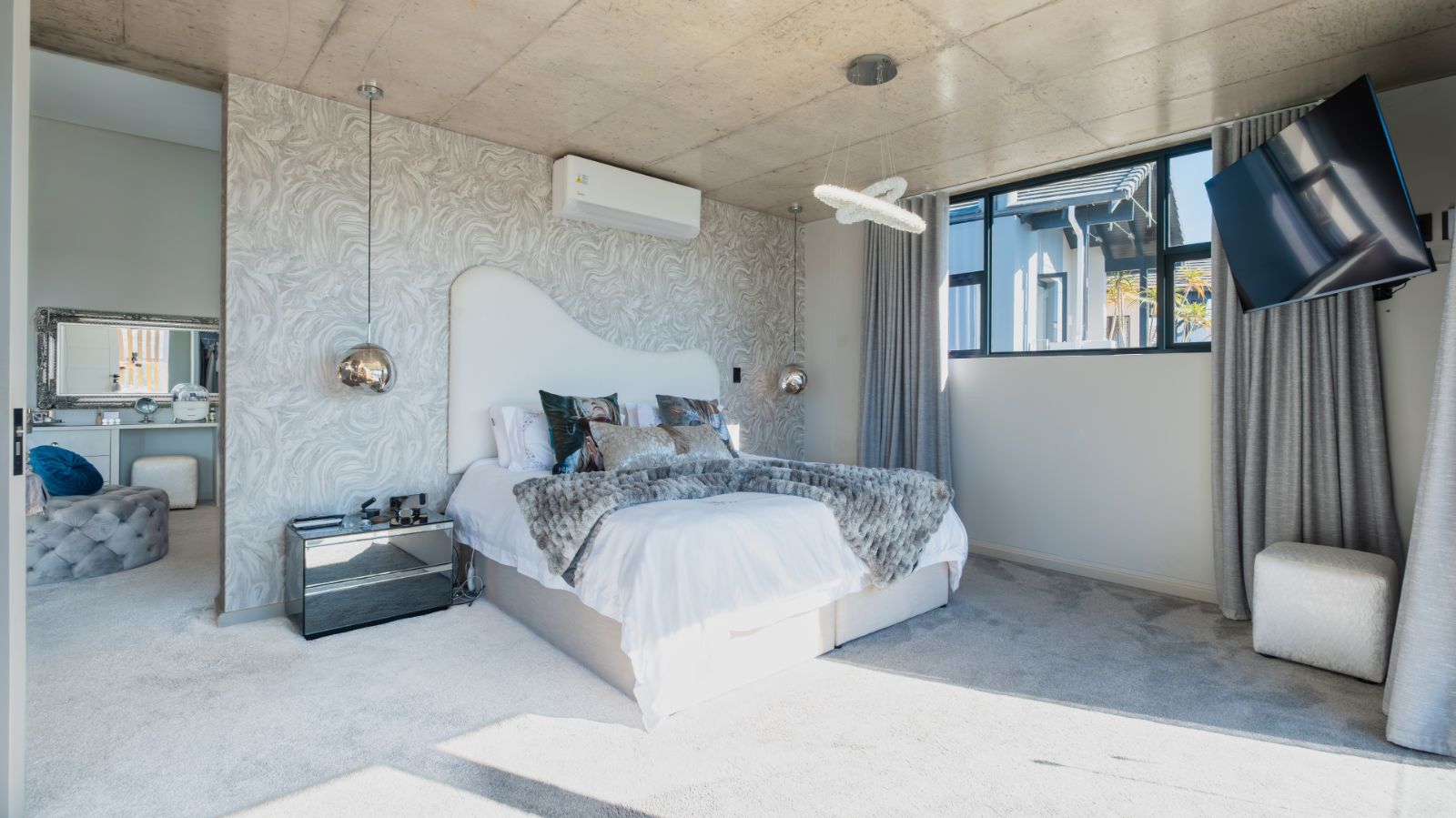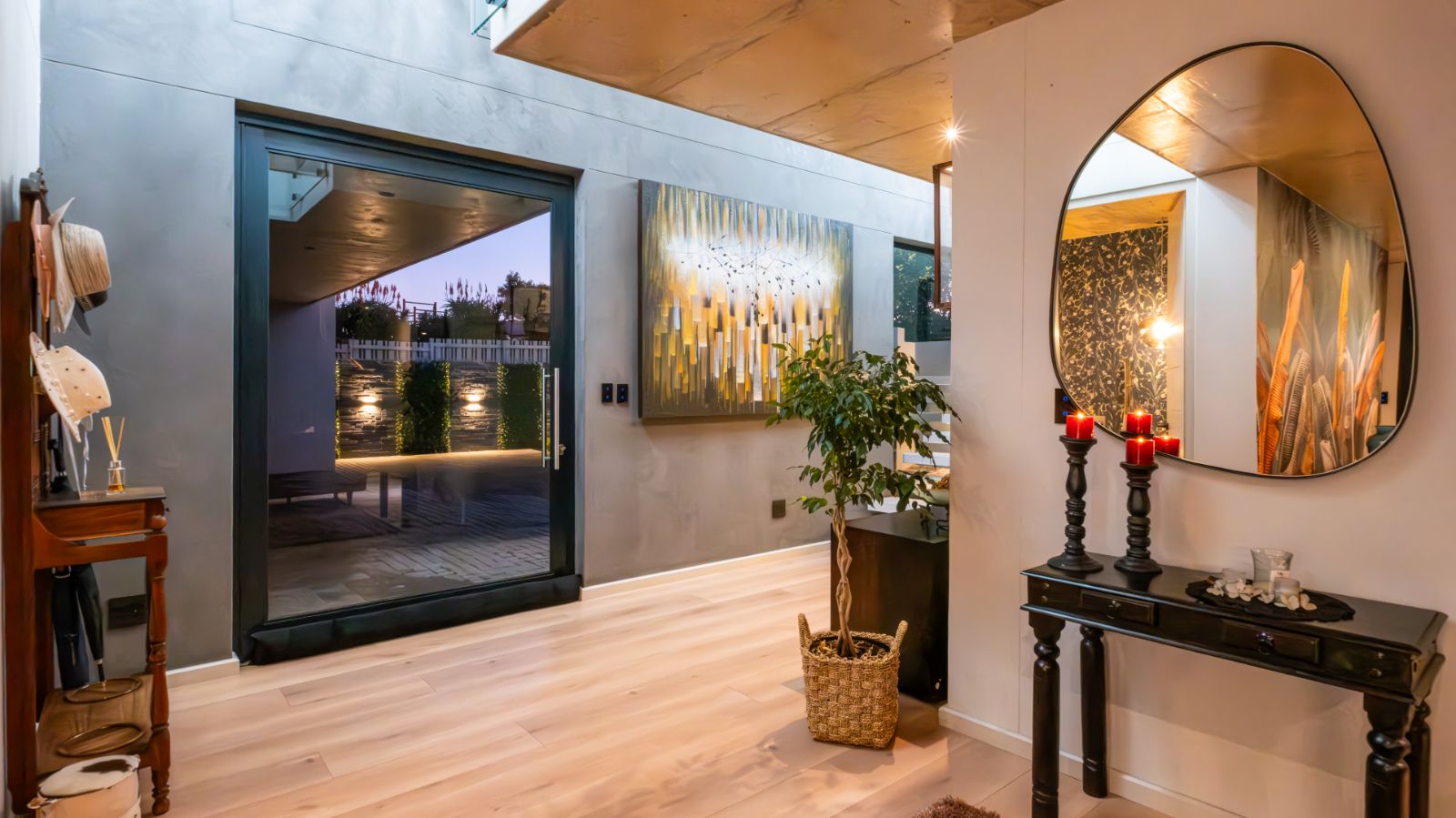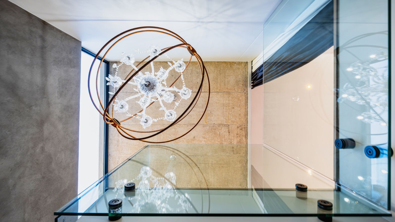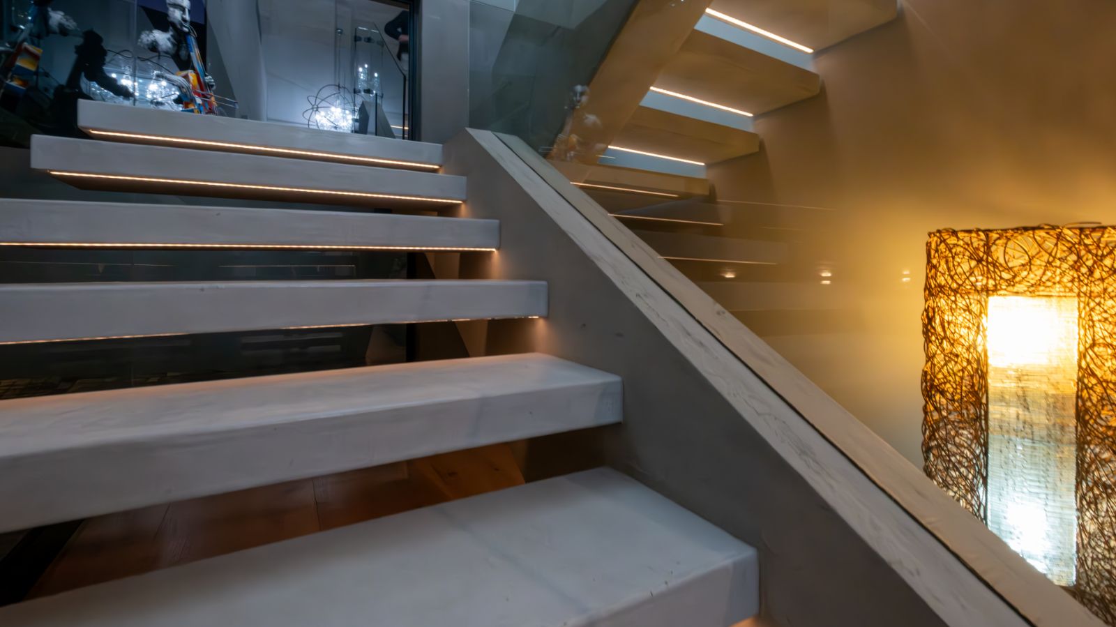 Step into a breathtaking open-plan living space where modern aesthetics meet effortless sophistication. The entrance welcomes you with a floating precast concrete staircase and two statement chandelier lights that set the tone for what lies ahead.