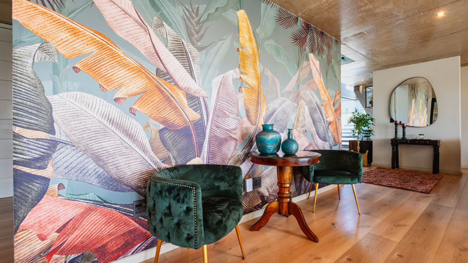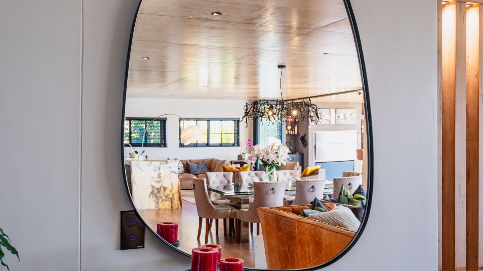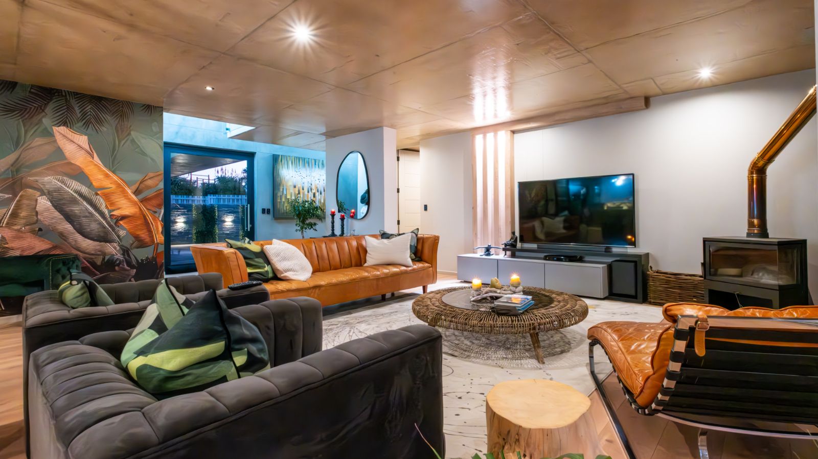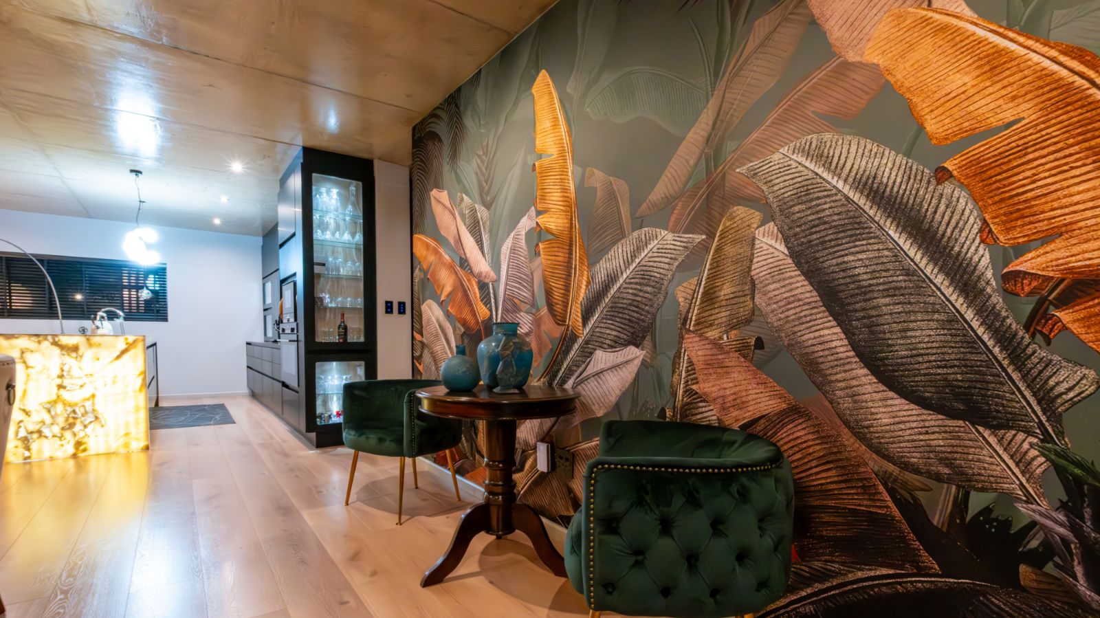 Step into a breathtaking open-plan living space where modern aesthetics meet effortless sophistication. The entrance welcomes you with a floating precast concrete staircase and two statement chandelier lights that set the tone for what lies ahead.