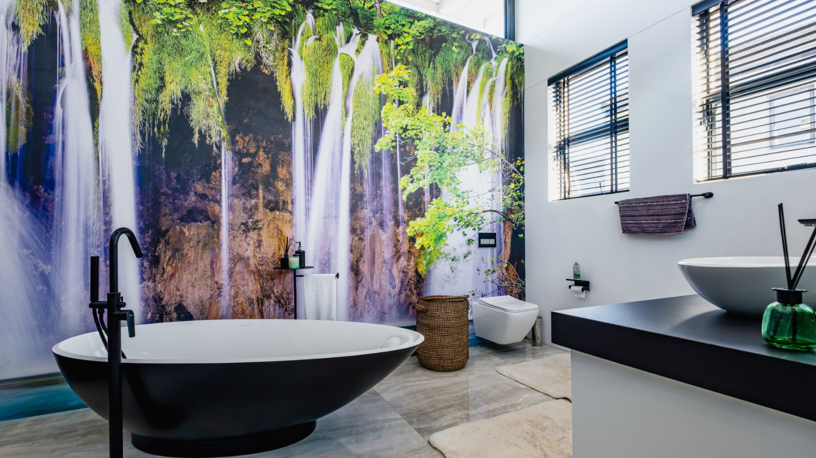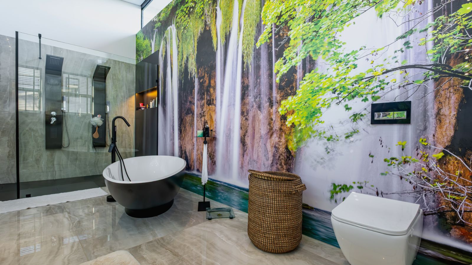 The ground floor also includes a stylish guest suite with a full en-suite bathroom and a private covered patio overlooking the garden and mountains.