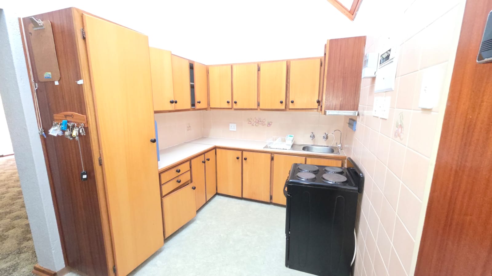 The interior features a functional layout, beginning with a well-lit lounge area that provides a welcoming space for relaxation. The kitchen, openly connected to the living area, is equipped with extensive light wood cabinetry, an L-shaped counter, a tiled backsplash, and a freestanding electric stove, offering ample storage and a practical setup for daily meal preparation. While presenting an opportunity for modern updates, the kitchen remains highly functional.