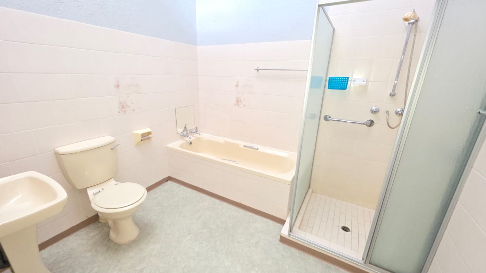 The single bedroom is designed for comfort, featuring built-in wooden wardrobes that provide convenient storage solutions. Natural light streams in through large windows and sliding doors, complemented by ceiling fans and chandeliers for optimal lighting and air circulation. The bathroom is equipped with both a separate bathtub and a shower stall, catering to diverse preferences, though it retains an older aesthetic.