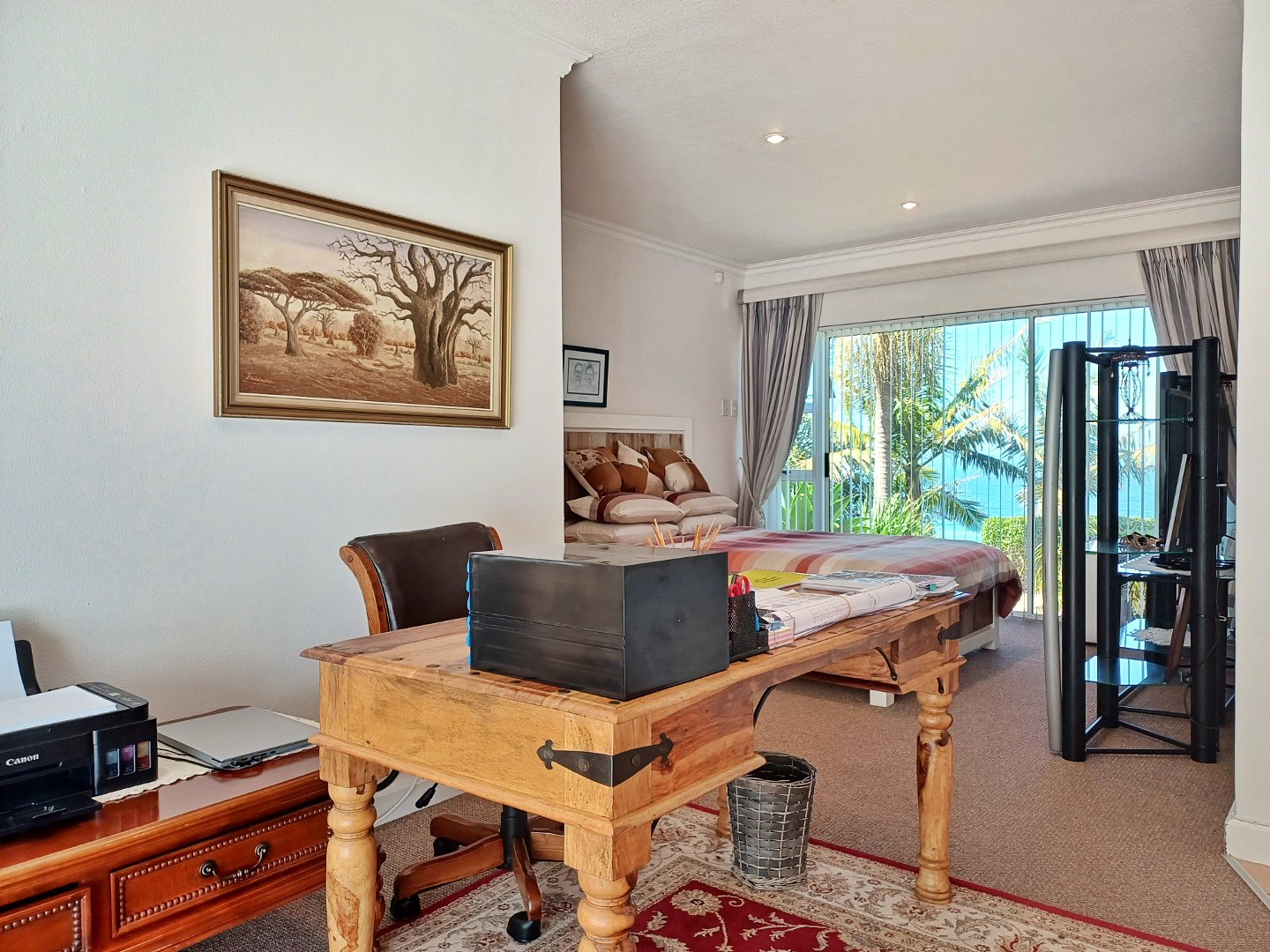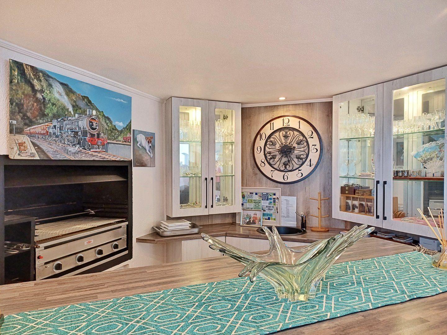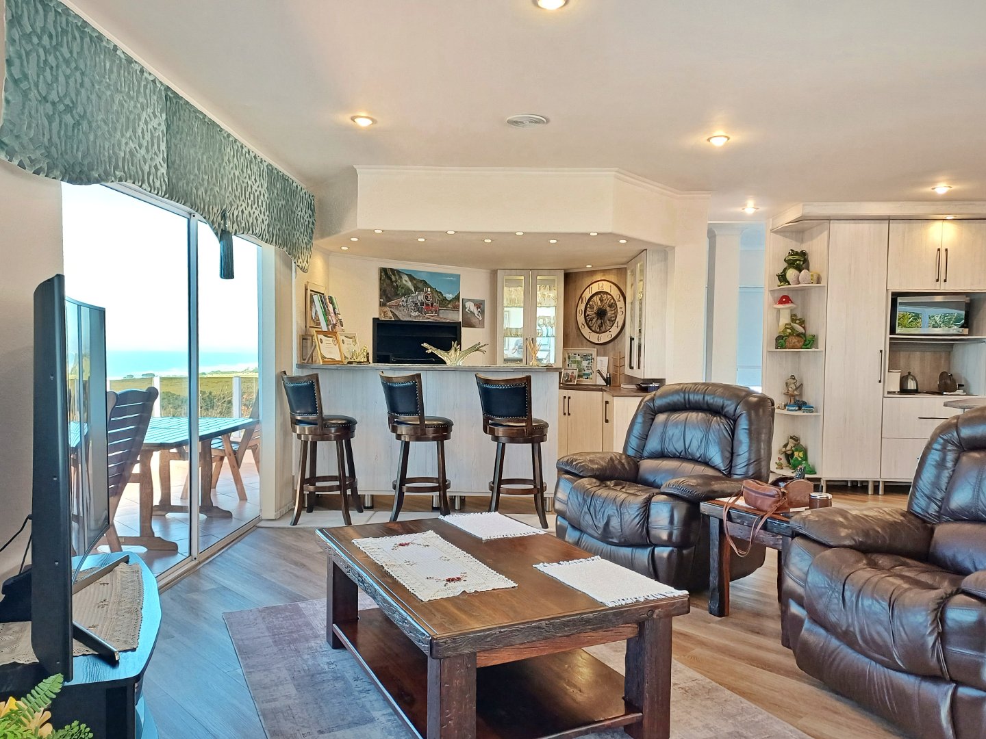 The first floor unveils an impressive, open-concept living area that flows effortlessly between the lounge with fire place, family room and dining space to a stylish corner bar. The bar, complete with a built-in gas braai, is perfect for gatherings. The kitchen completes the area and is an entertainer's dream, equipped with both gas and electric hobs, an oven, and ample cabinetry. A separate scullery and laundry room add convenience, while large windows frame captivating ocean views. This level also features an enclosed braai area for indoor-outdoor entertaining and a spacious guest suite with its own en-suite, living space, and kitchenette, offering privacy for family or visitors.