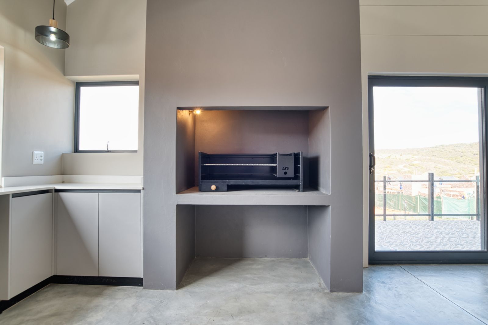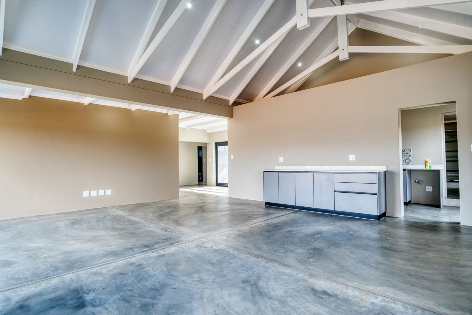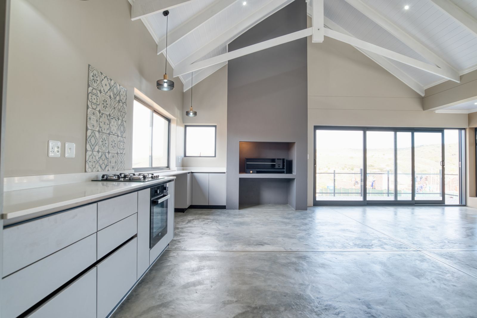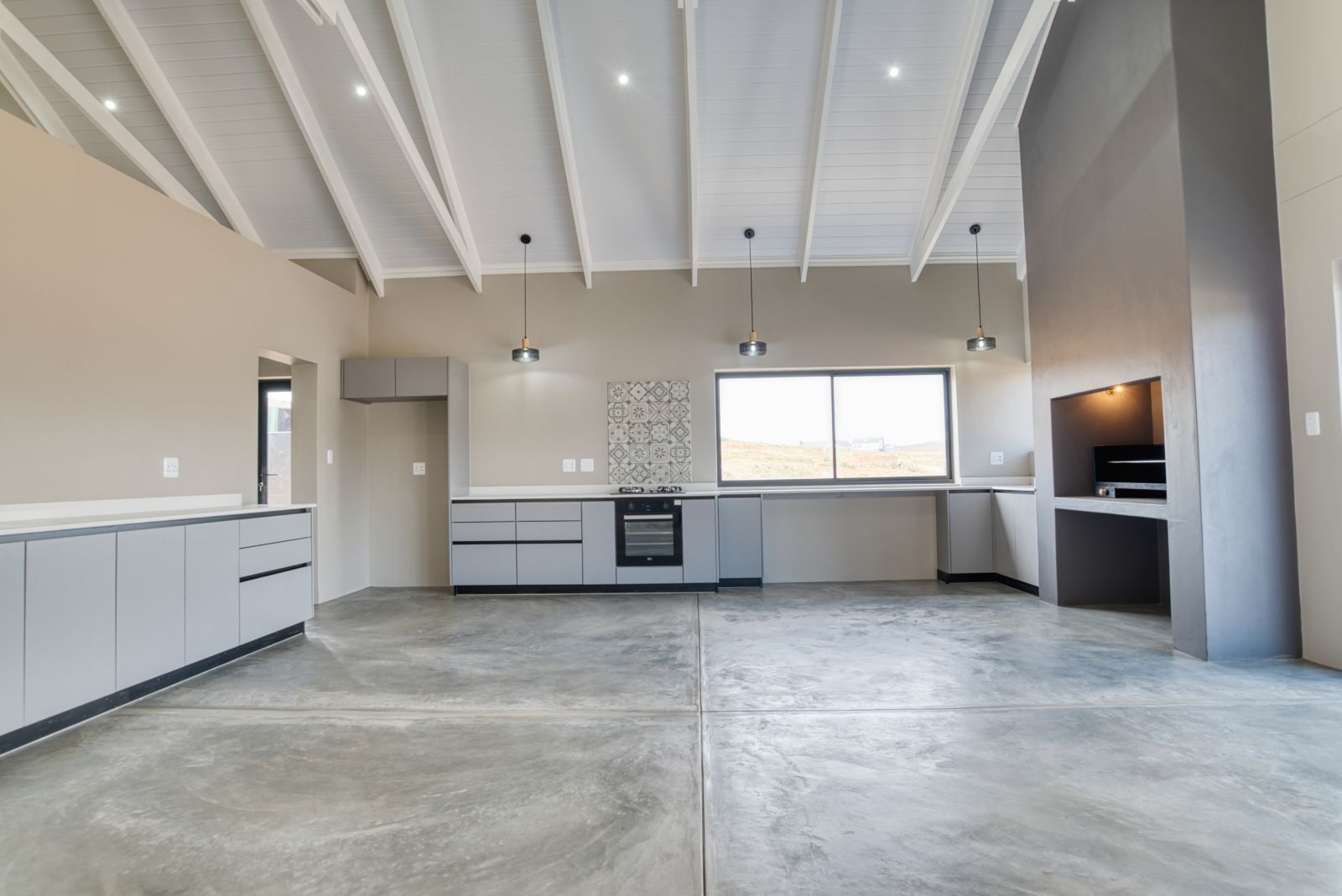 Enter the home through large glass doors into a welcoming foyer. To the left is a conveniently placed guest toilet, while a passage leads through to the spacious open-plan living area. The living space seamlessly combines a modern open kitchen, dining area, and a built-in braai with a family entertainment area—ideal for relaxed living and entertaining. A separate scullery provides additional practicality and offers direct access from the double garage.