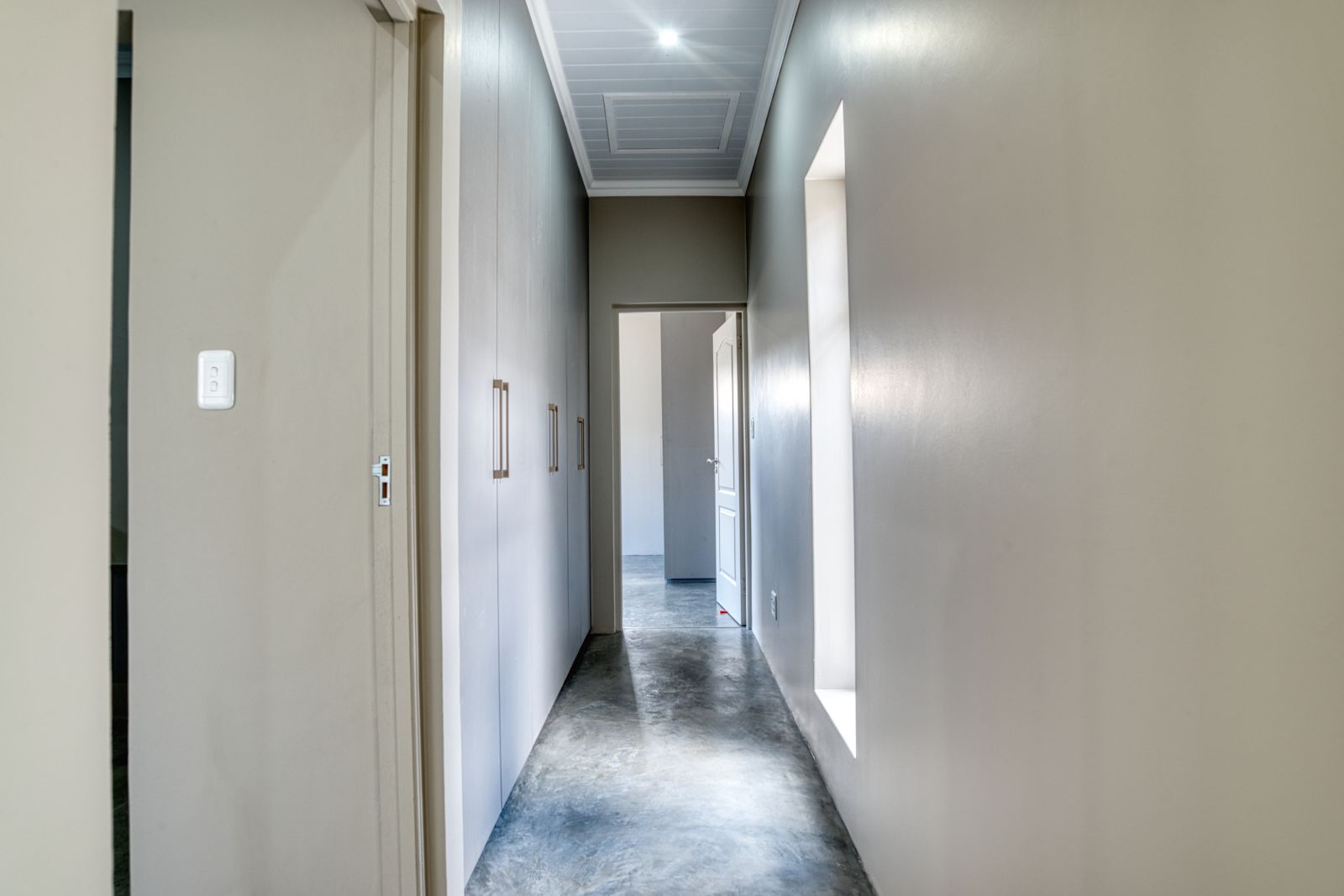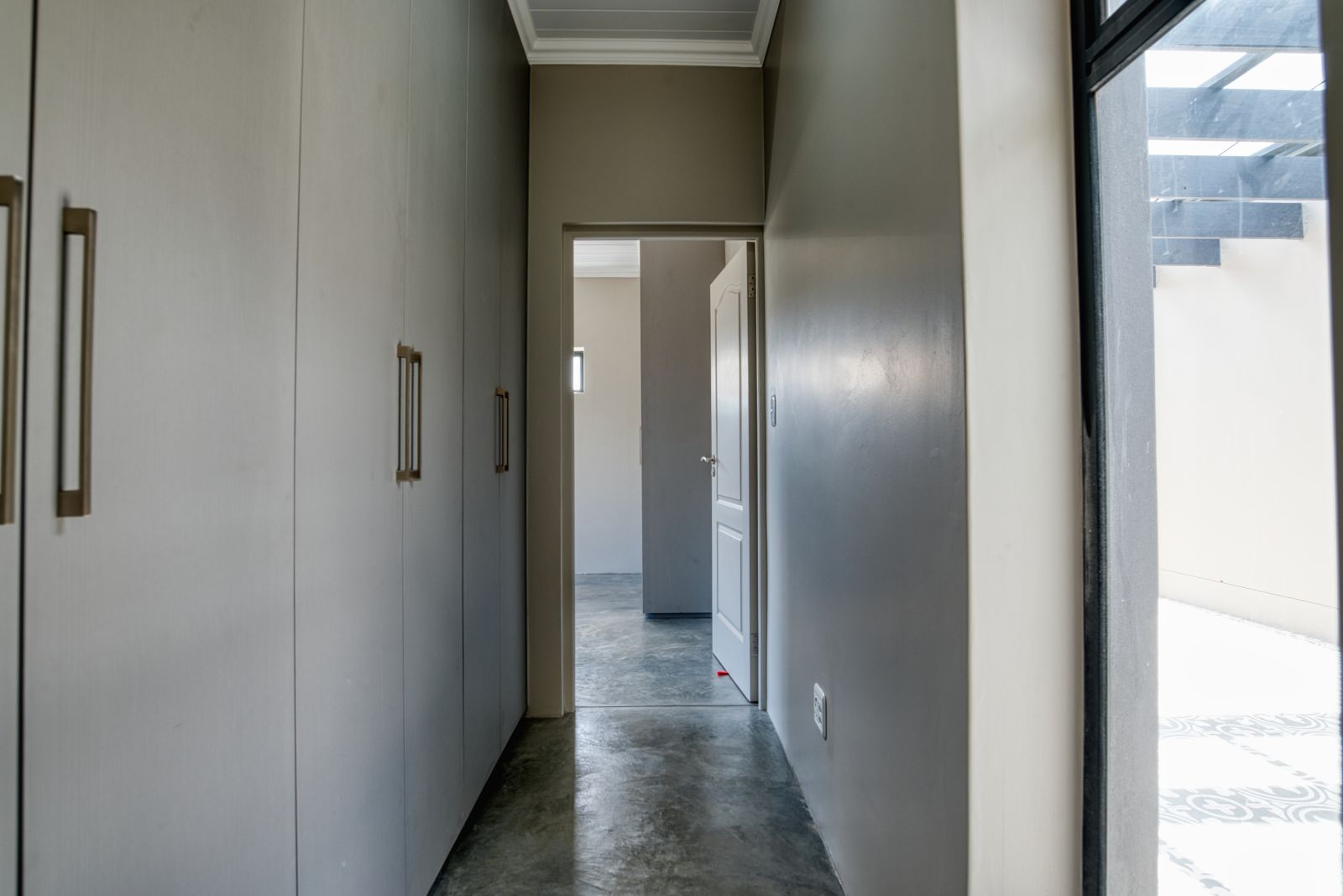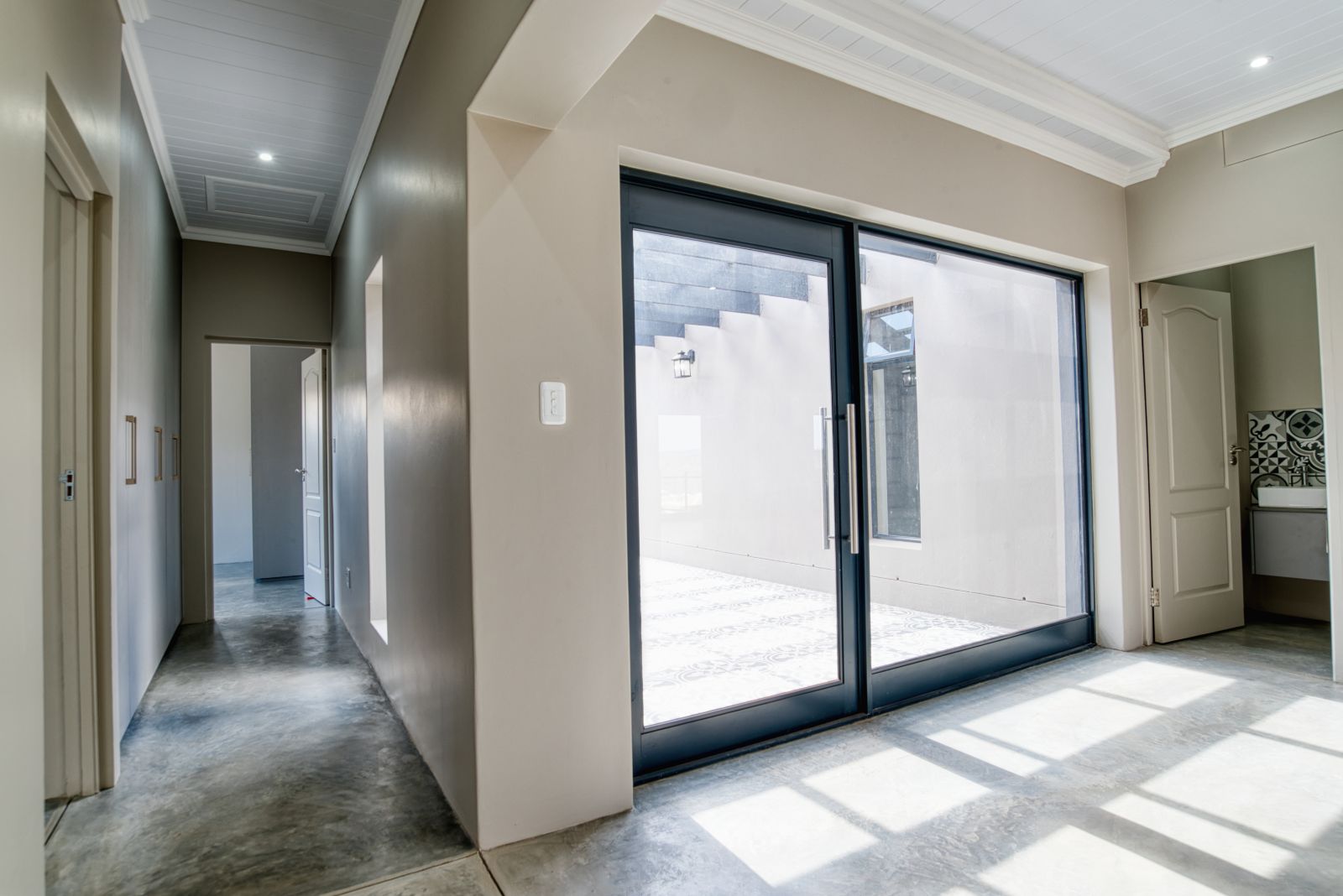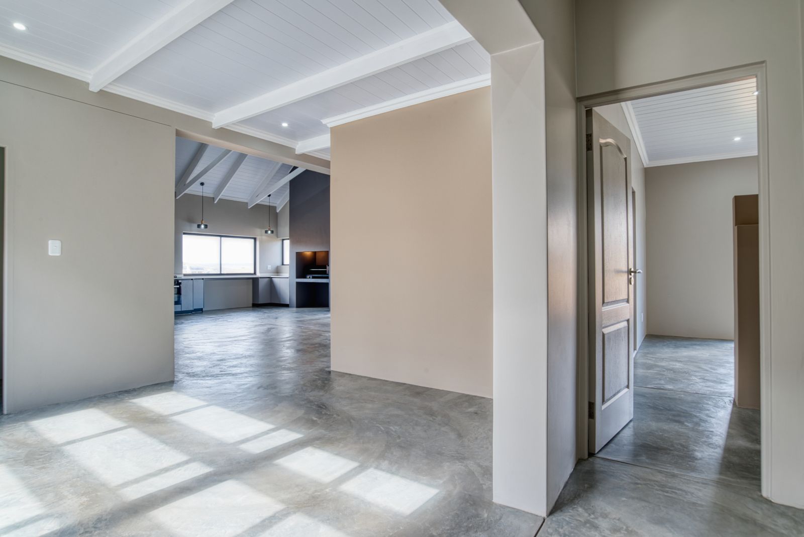 Enter the home through large glass doors into a welcoming foyer. To the left is a conveniently placed guest toilet, while a passage leads through to the spacious open-plan living area. The living space seamlessly combines a modern open kitchen, dining area, and a built-in braai with a family entertainment area—ideal for relaxed living and entertaining. A separate scullery provides additional practicality and offers direct access from the double garage.