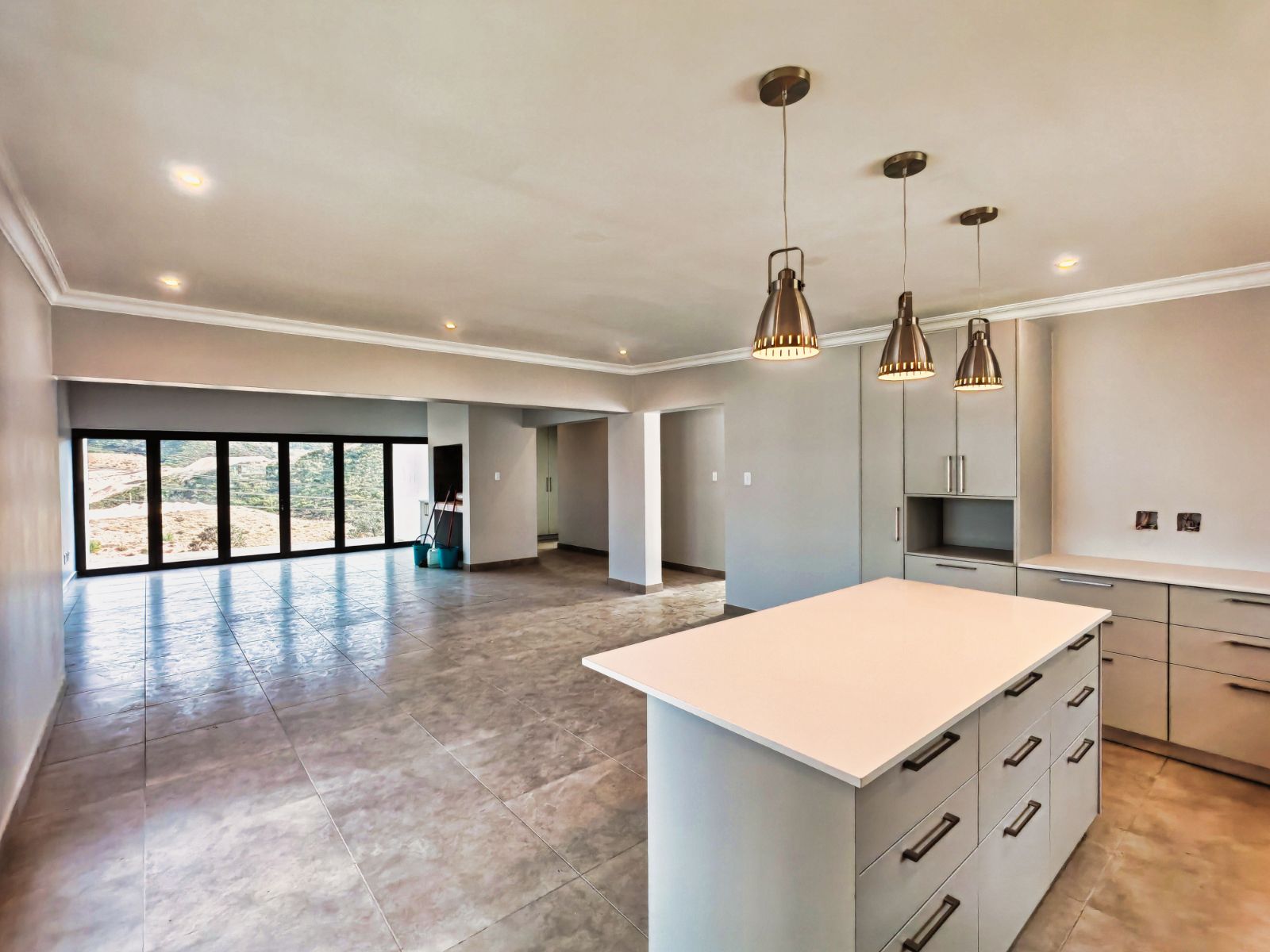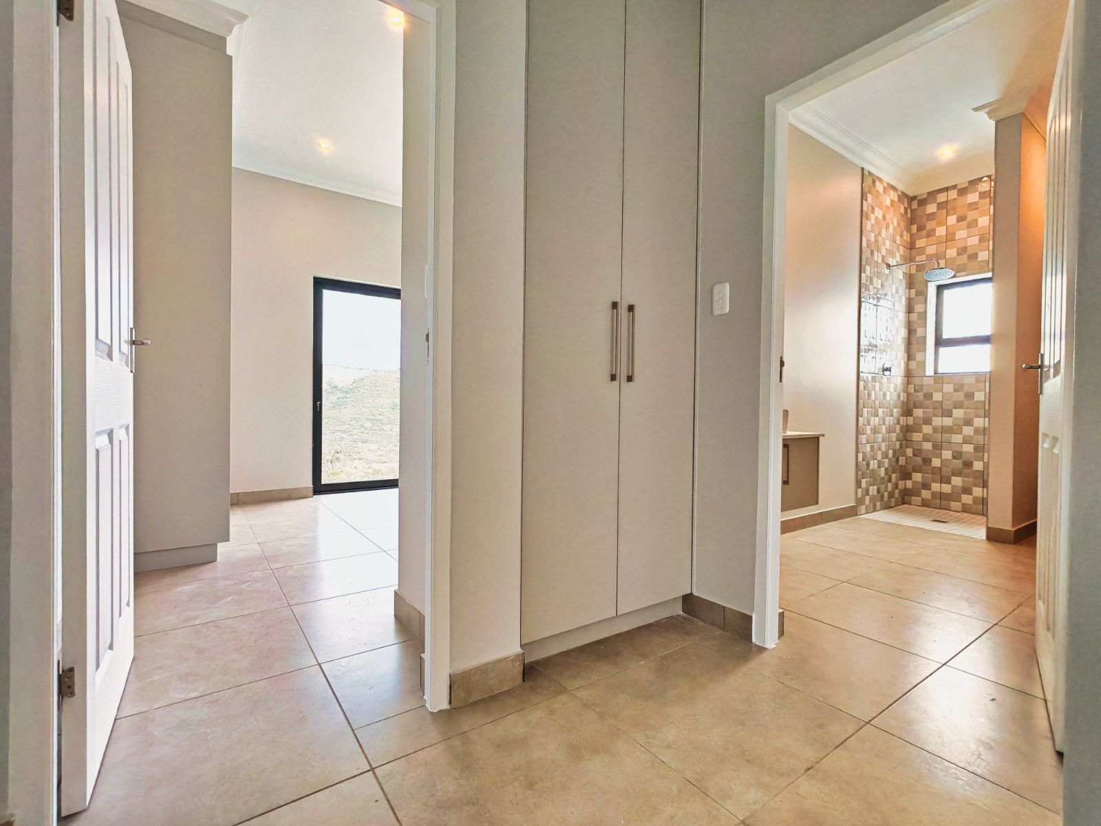 To the left of the living area is the spacious main bedroom with a full en-suite bathroom, offering privacy and serene views. On the right, a practical scullery leads to two additional bedrooms that share a well-appointed bathroom — ideal for family or guests. On the Ground Floor another room is available.