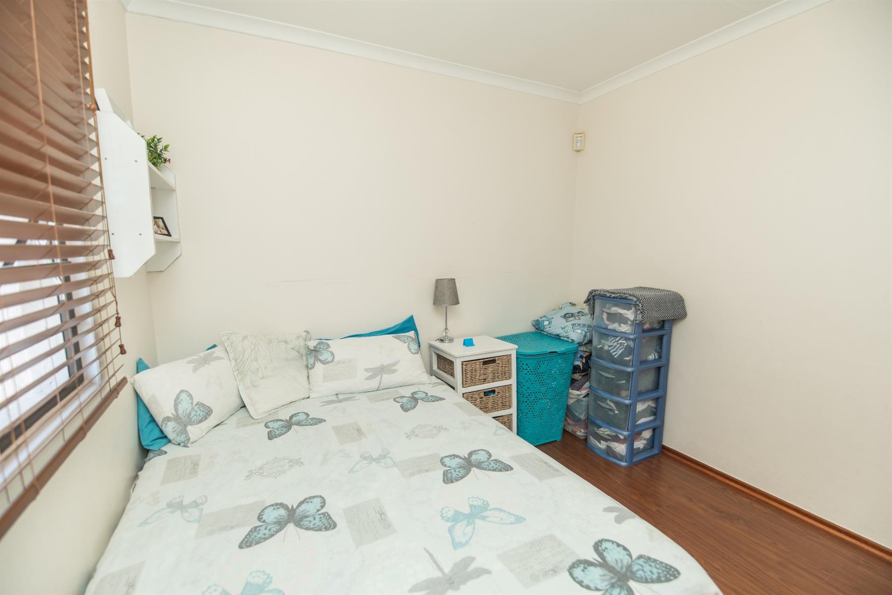 The modern kitchen is newly renovated and fitted with an oven, hob, and extractor fan. Main living areas are tiled throughout, with laminated flooring in the bedrooms. The bathroom has been stunningly renovated, adding a luxurious touch to this stylish home.
