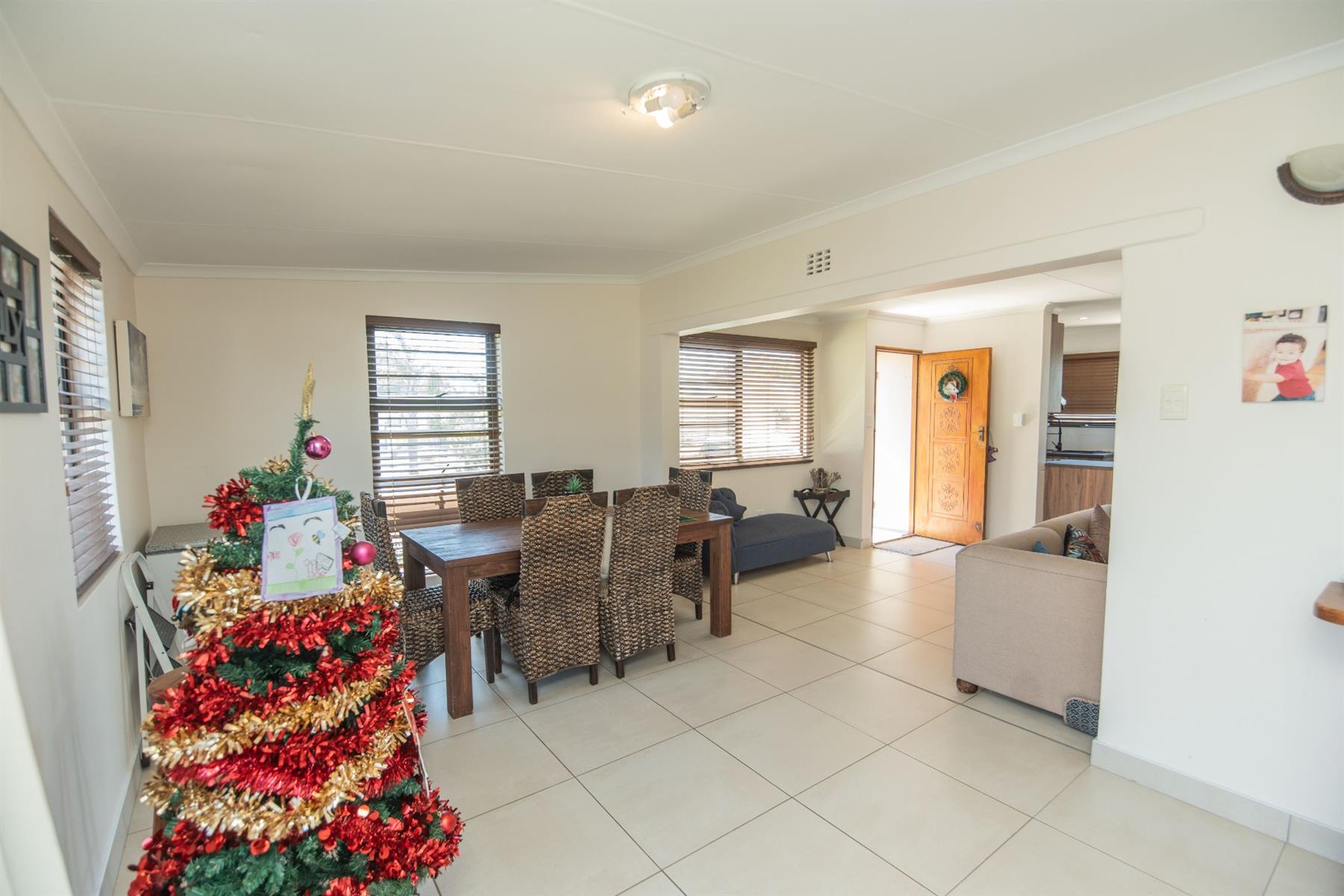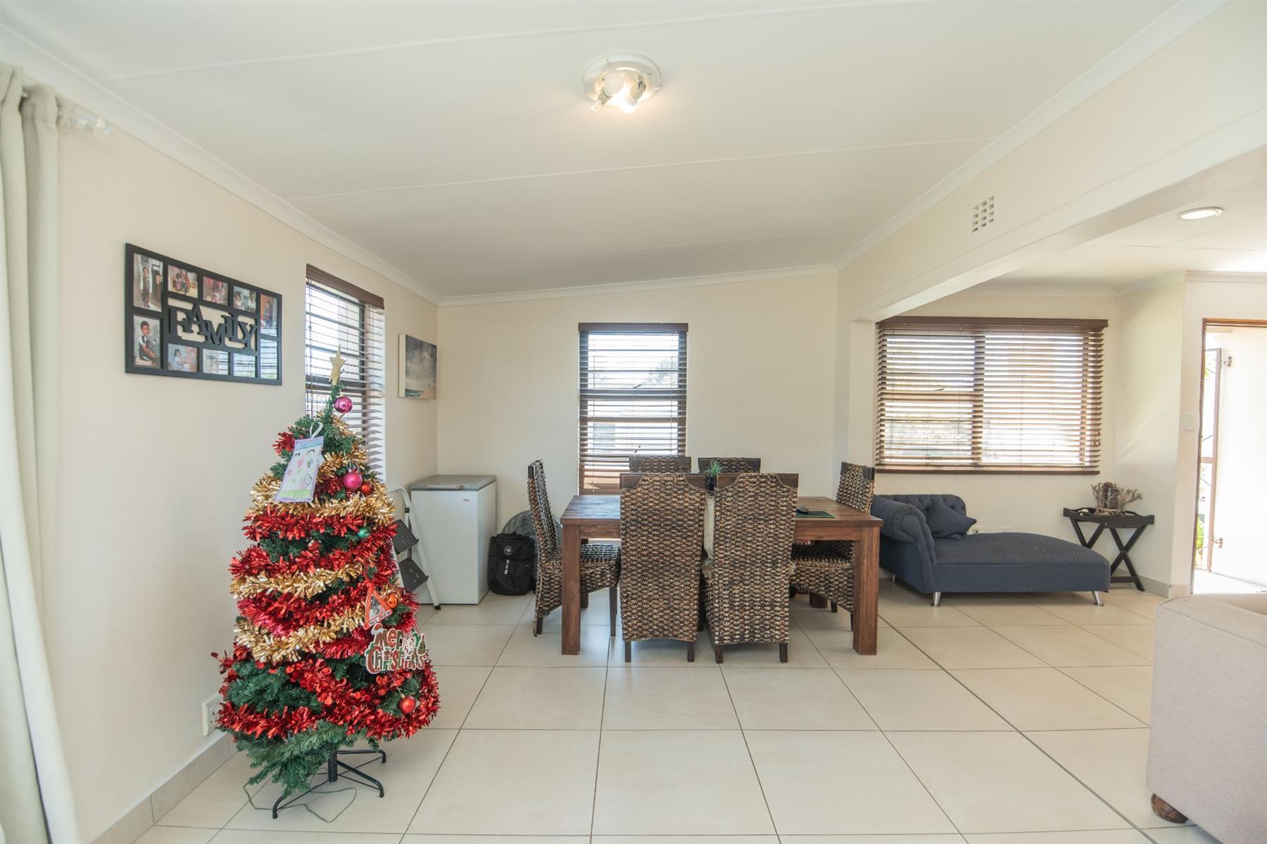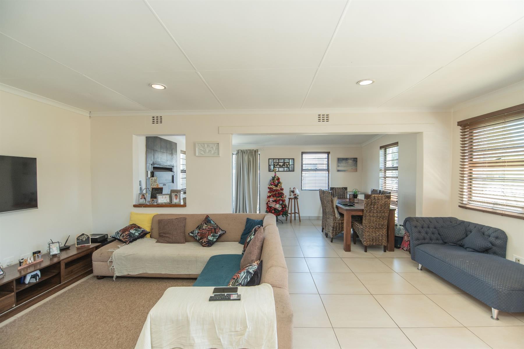 The home offers a very spacious open-plan lounge, dining room, and kitchen, seamlessly flowing into an indoor braai and entertainment area—ideal for relaxed family living and entertaining. The property is light, sunny, and beautifully finished, featuring high-quality fittings and fixtures throughout.