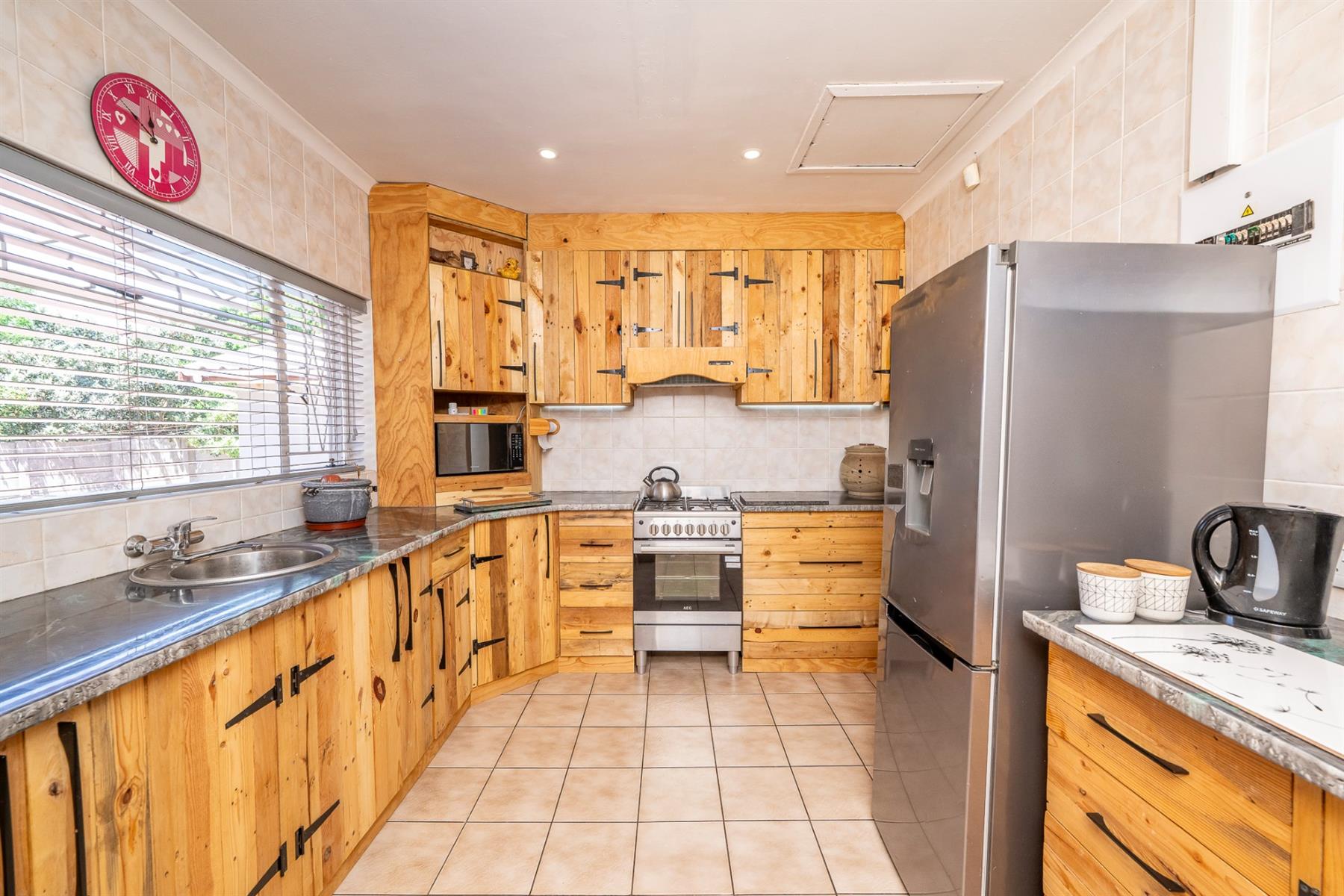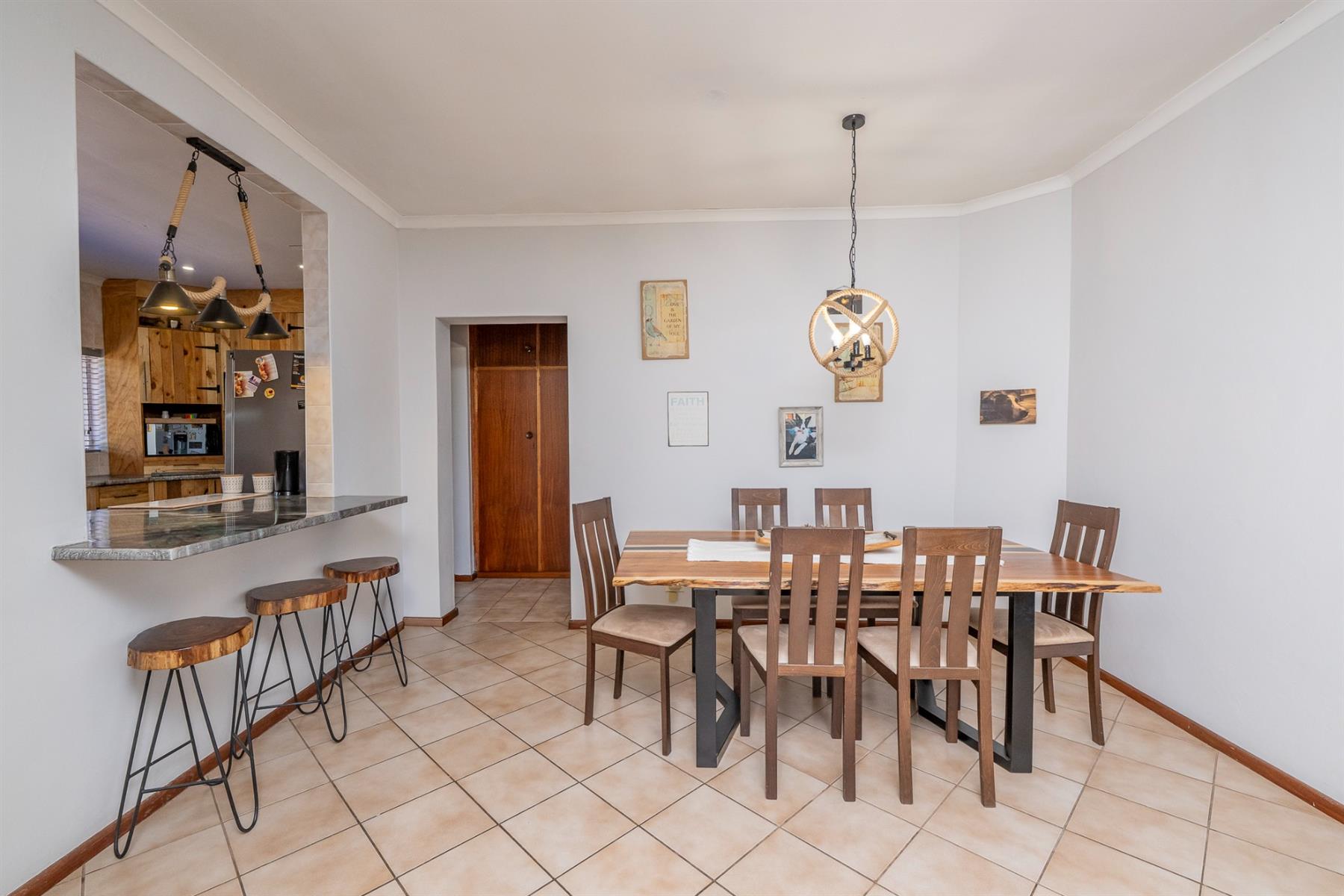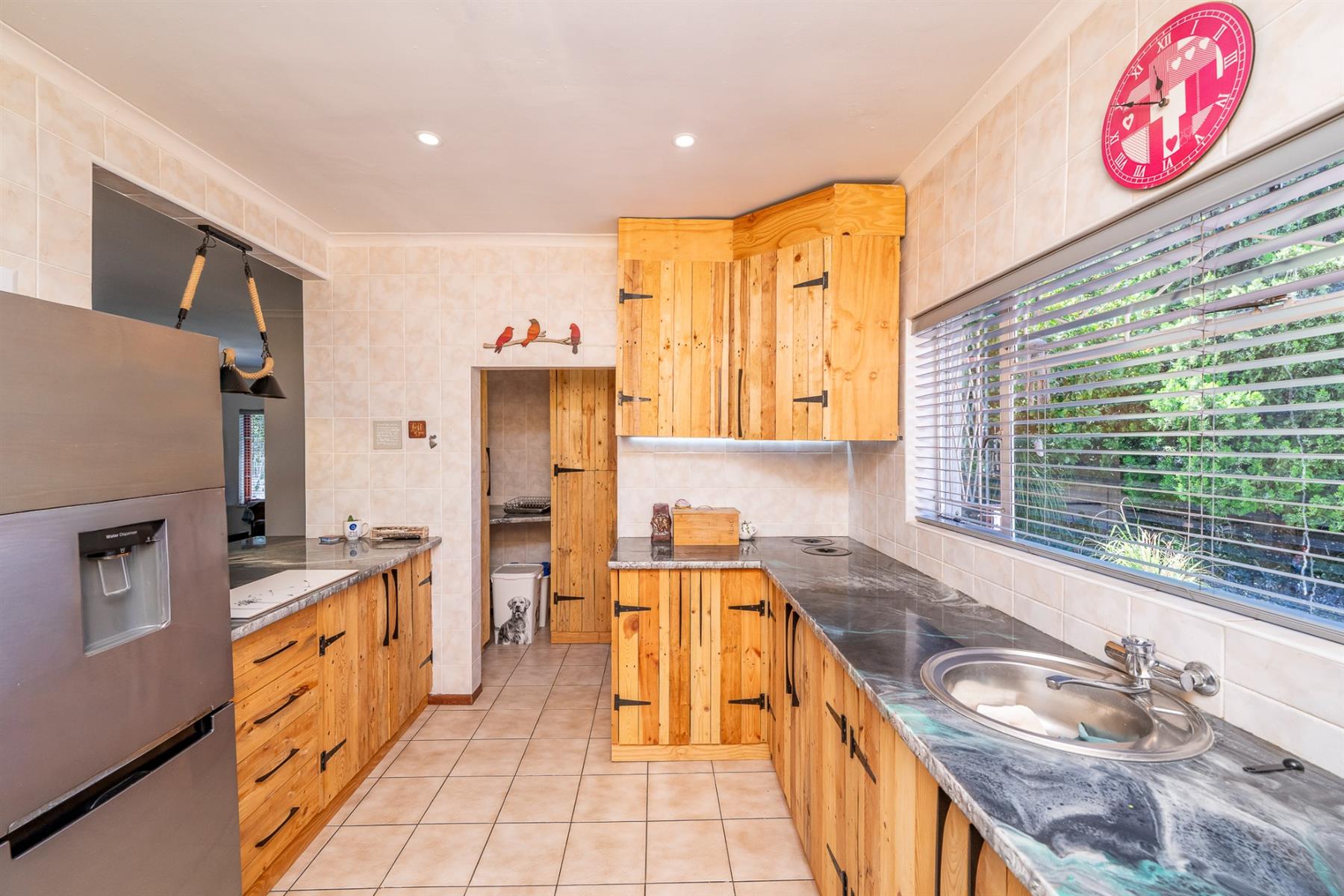 As you enter, you are welcomed into a formal lounge, dining area, and a TV room fitted with air conditioning. The kitchen features a charming rustic farmhouse style and is thoughtfully designed with ample cupboard space, complemented by a separate scullery.