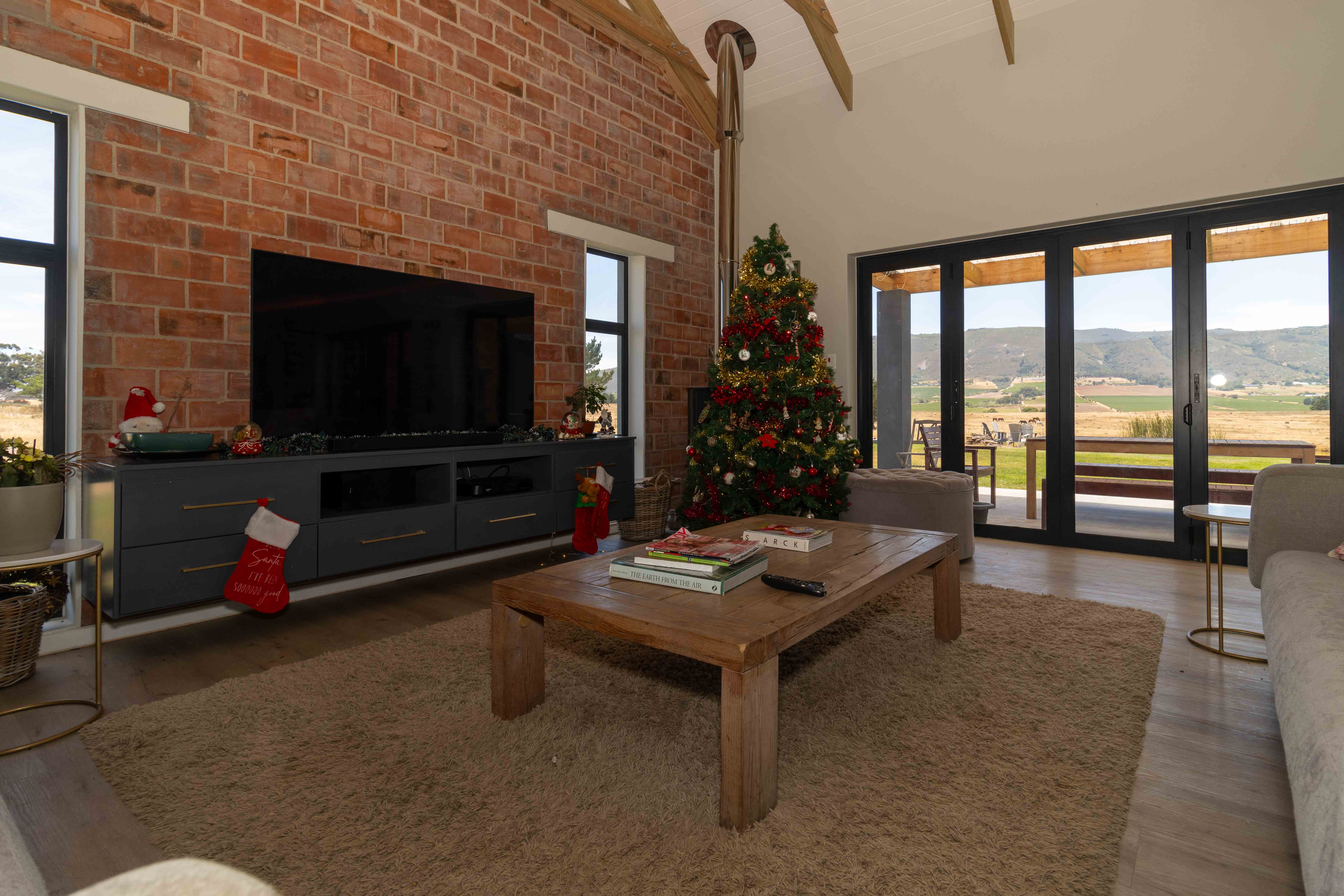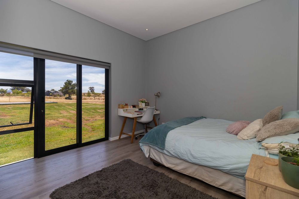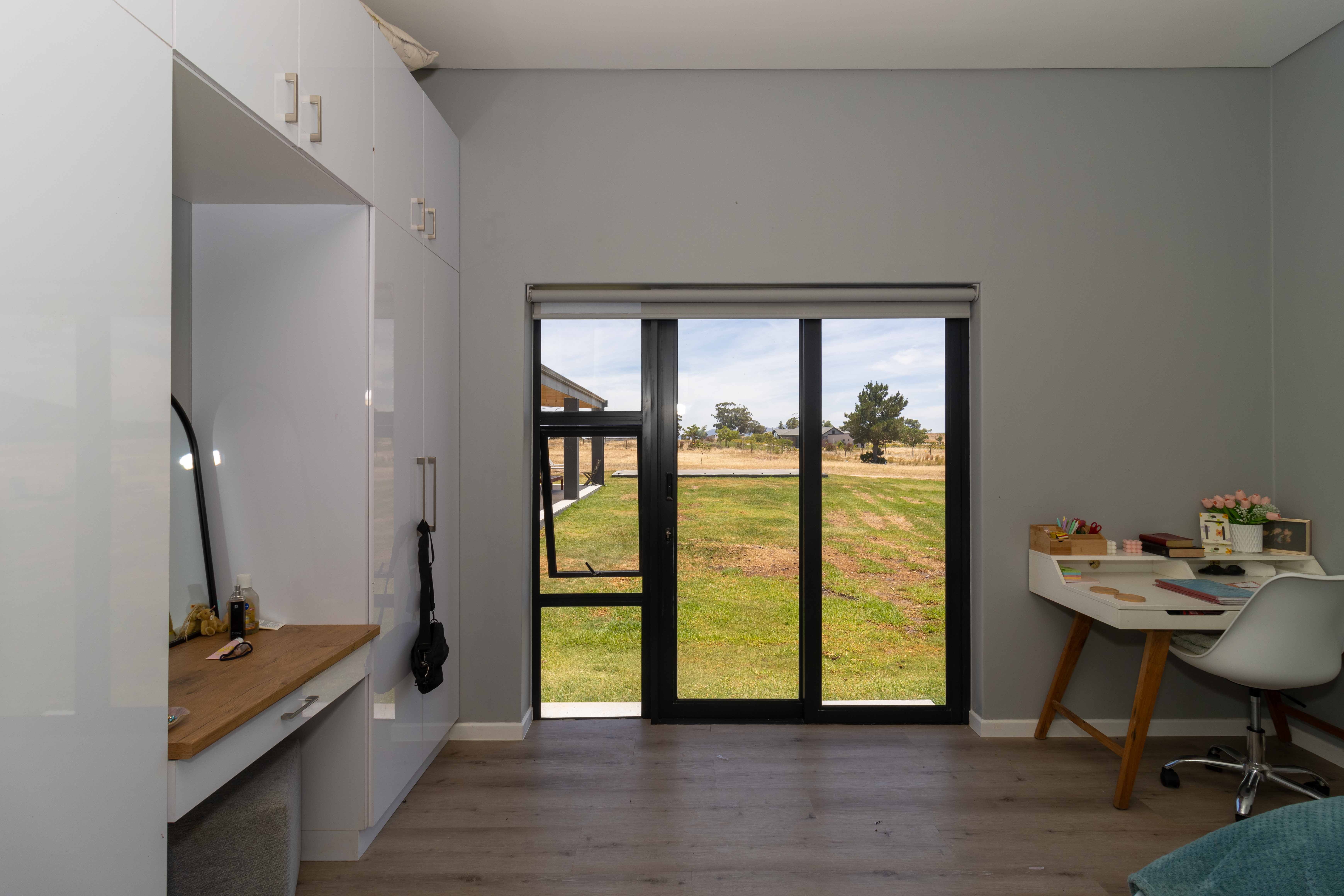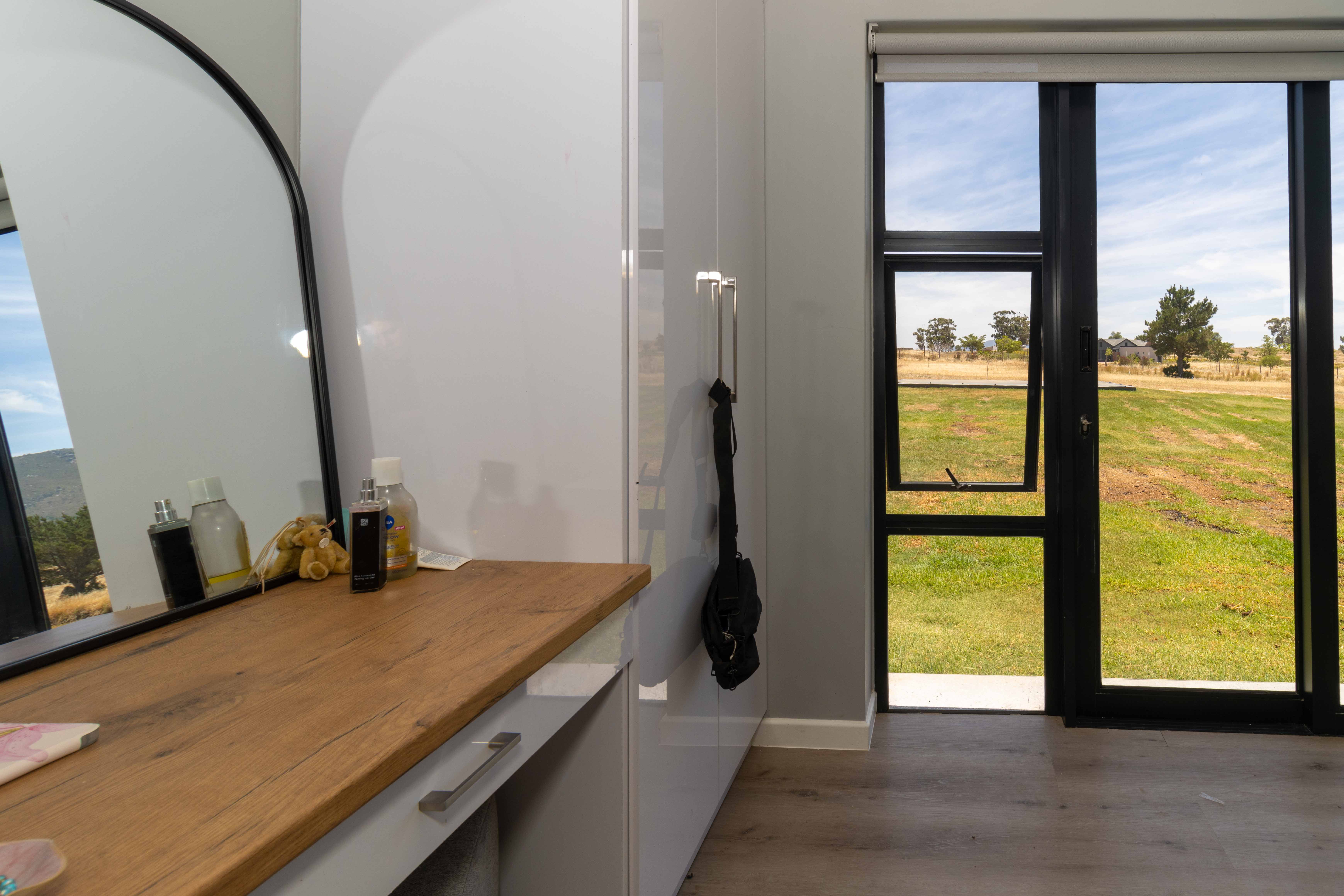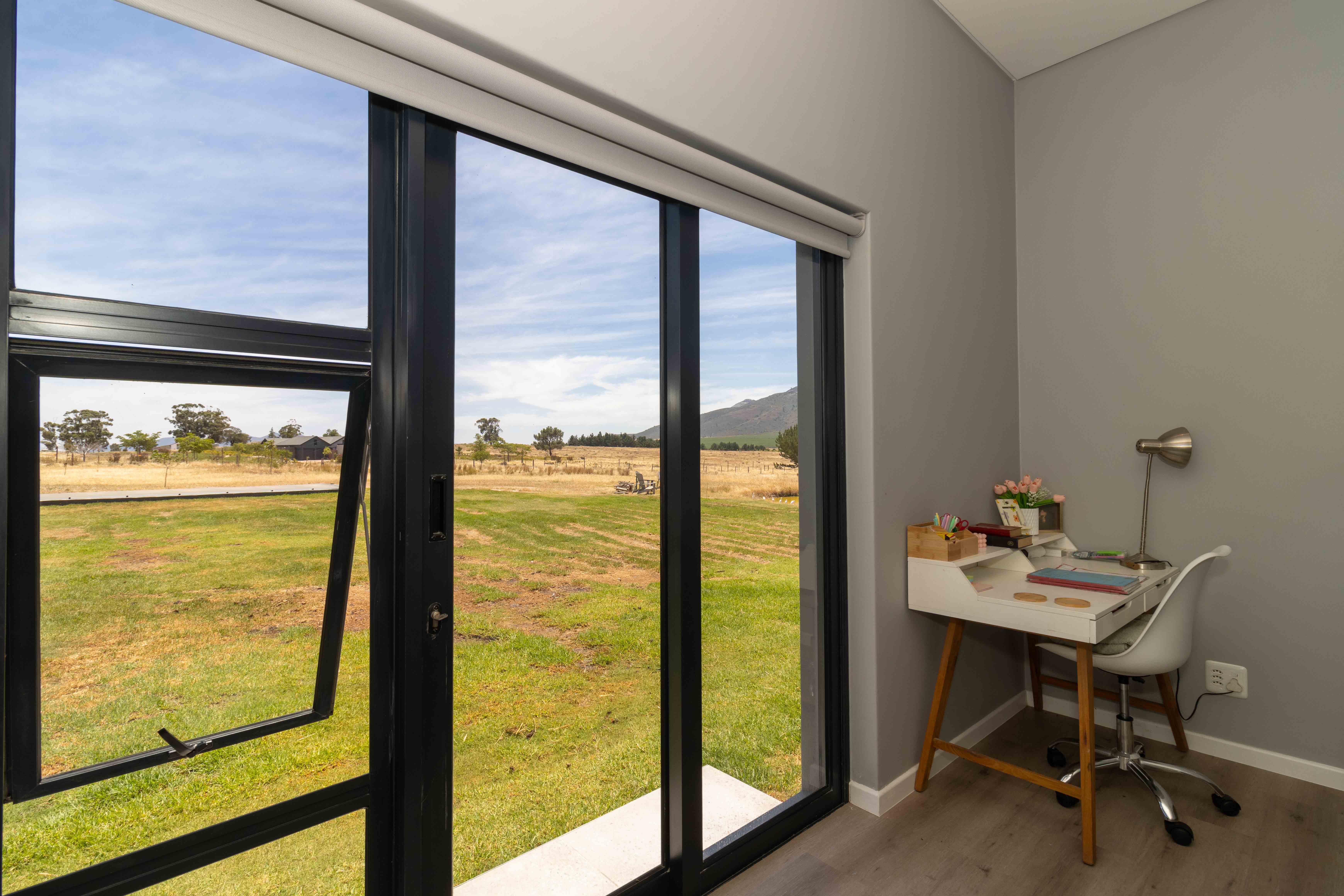 Both guest bedrooms are generously sized and serviced by a stylish, modern full bathroom. A guest toilet is conveniently located near the entrance. The dedicated study enjoys panoramic vistas of the estate, with horses roaming peacefully in the background — an inspiring setting for work-from-home living.