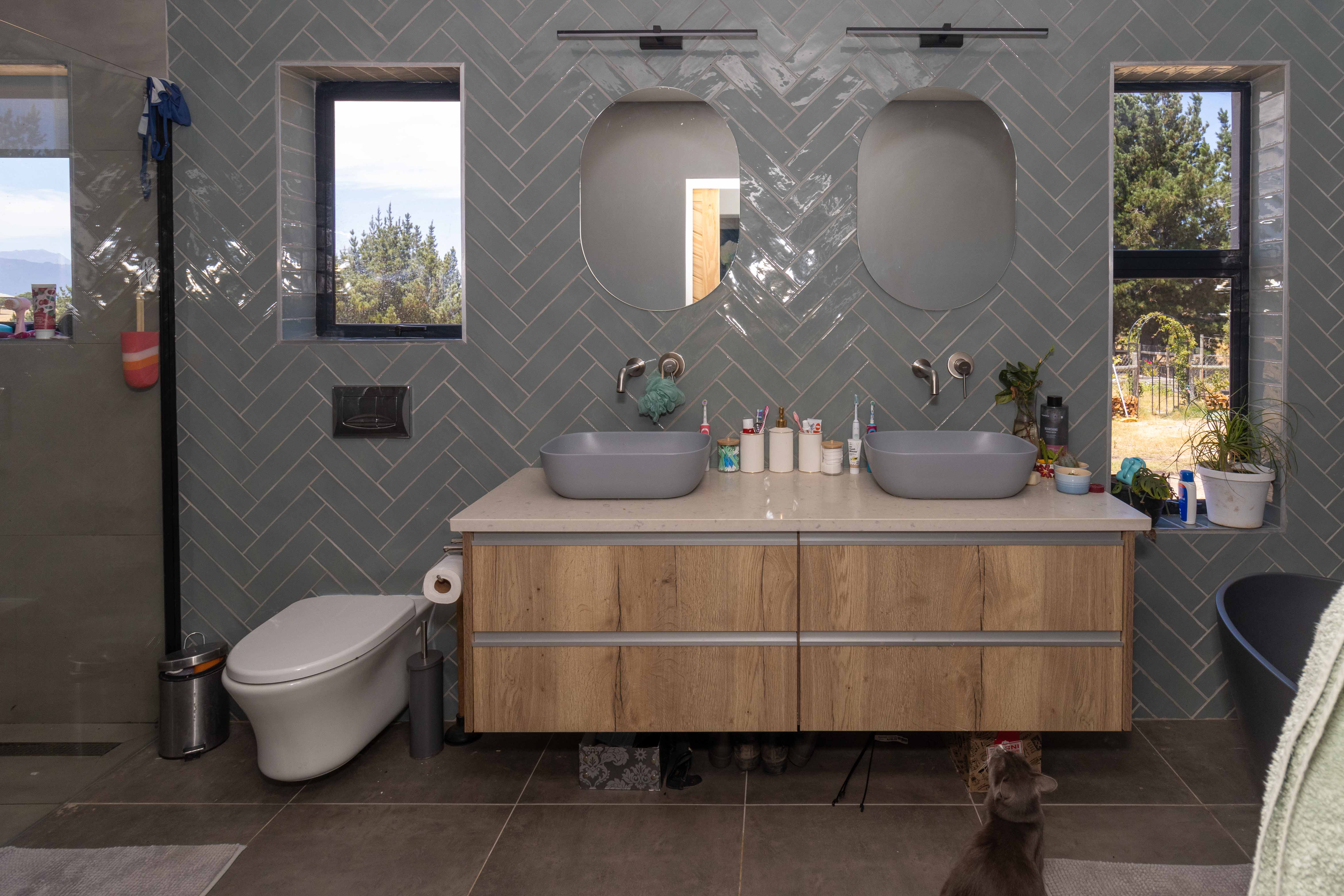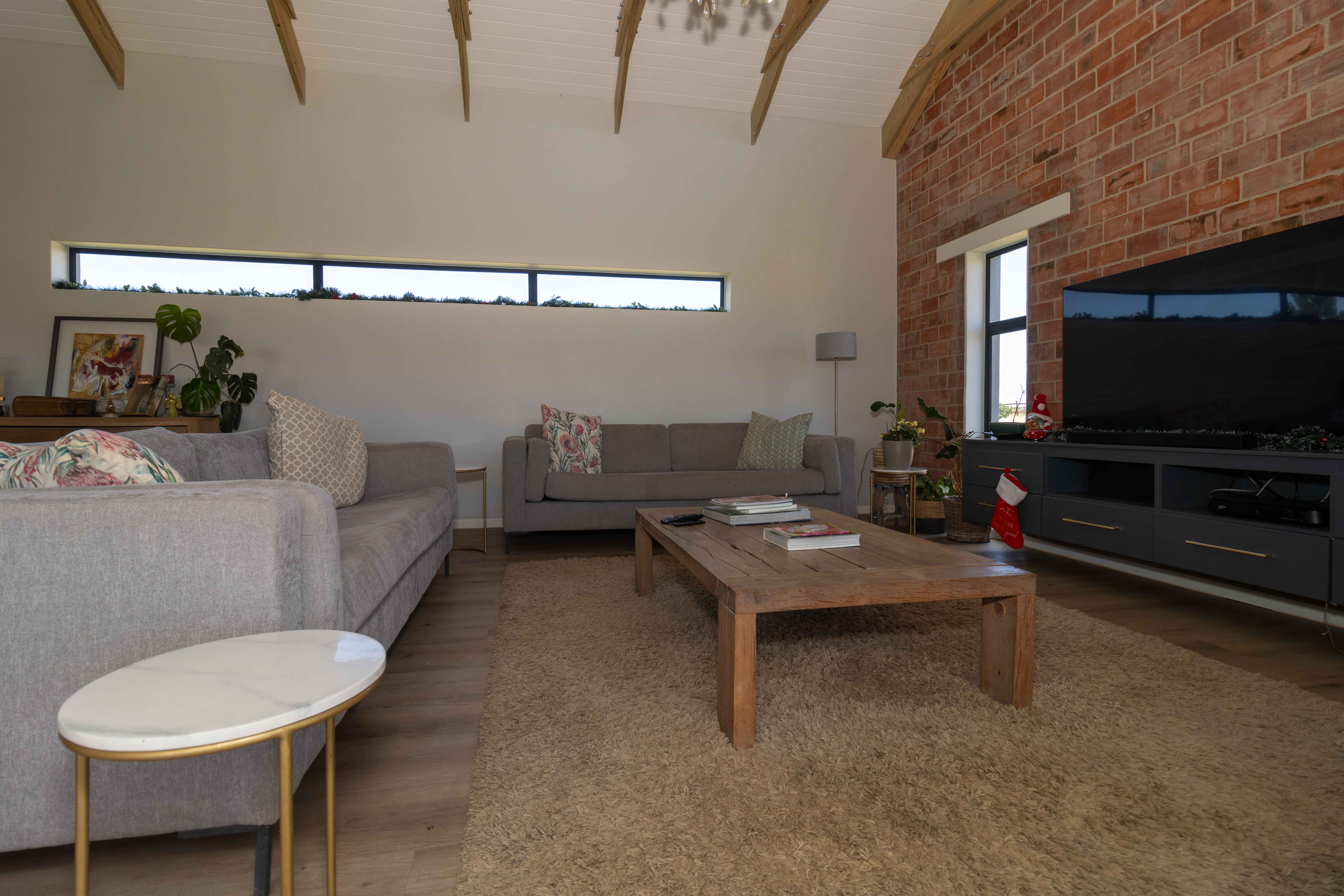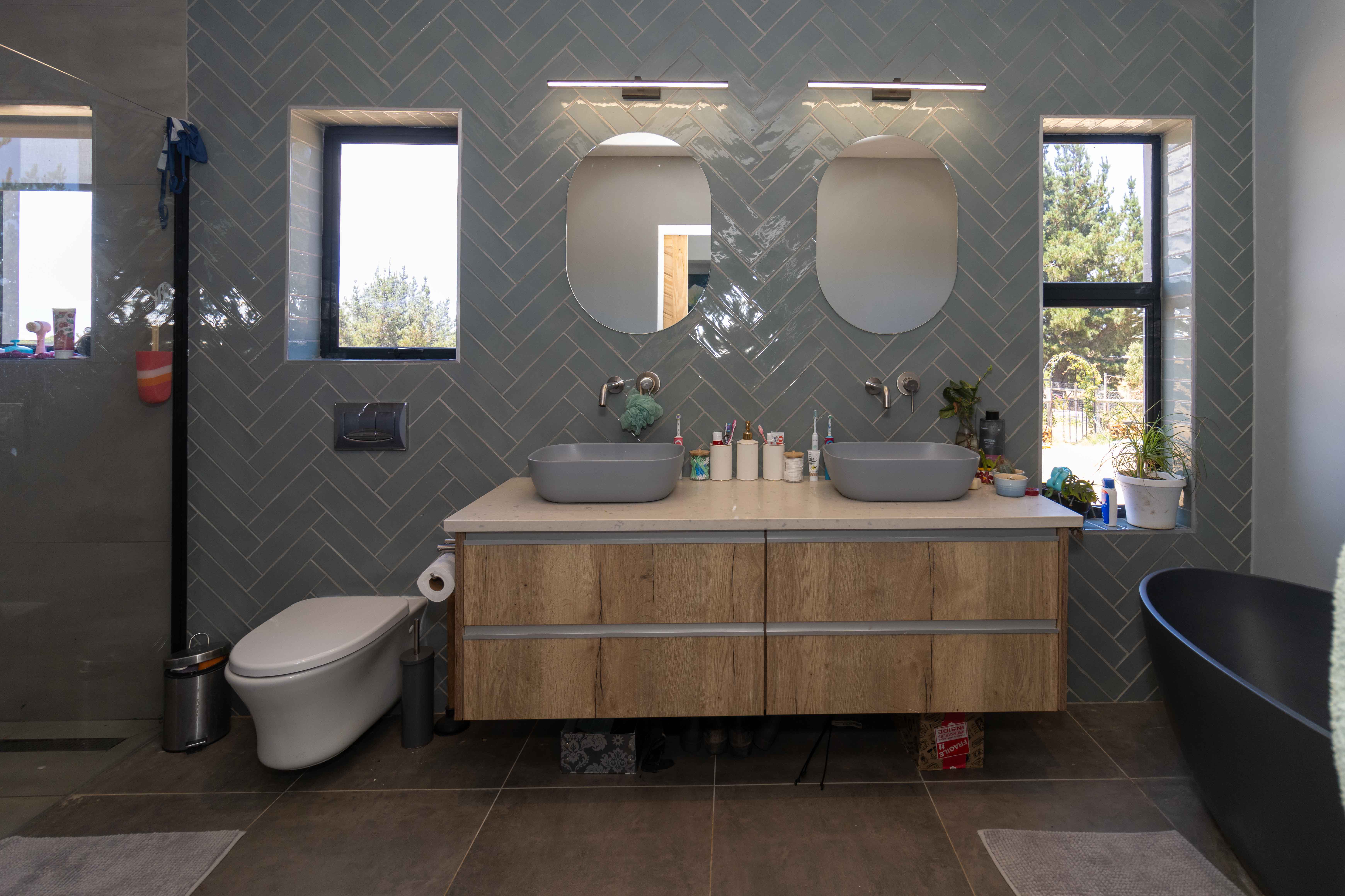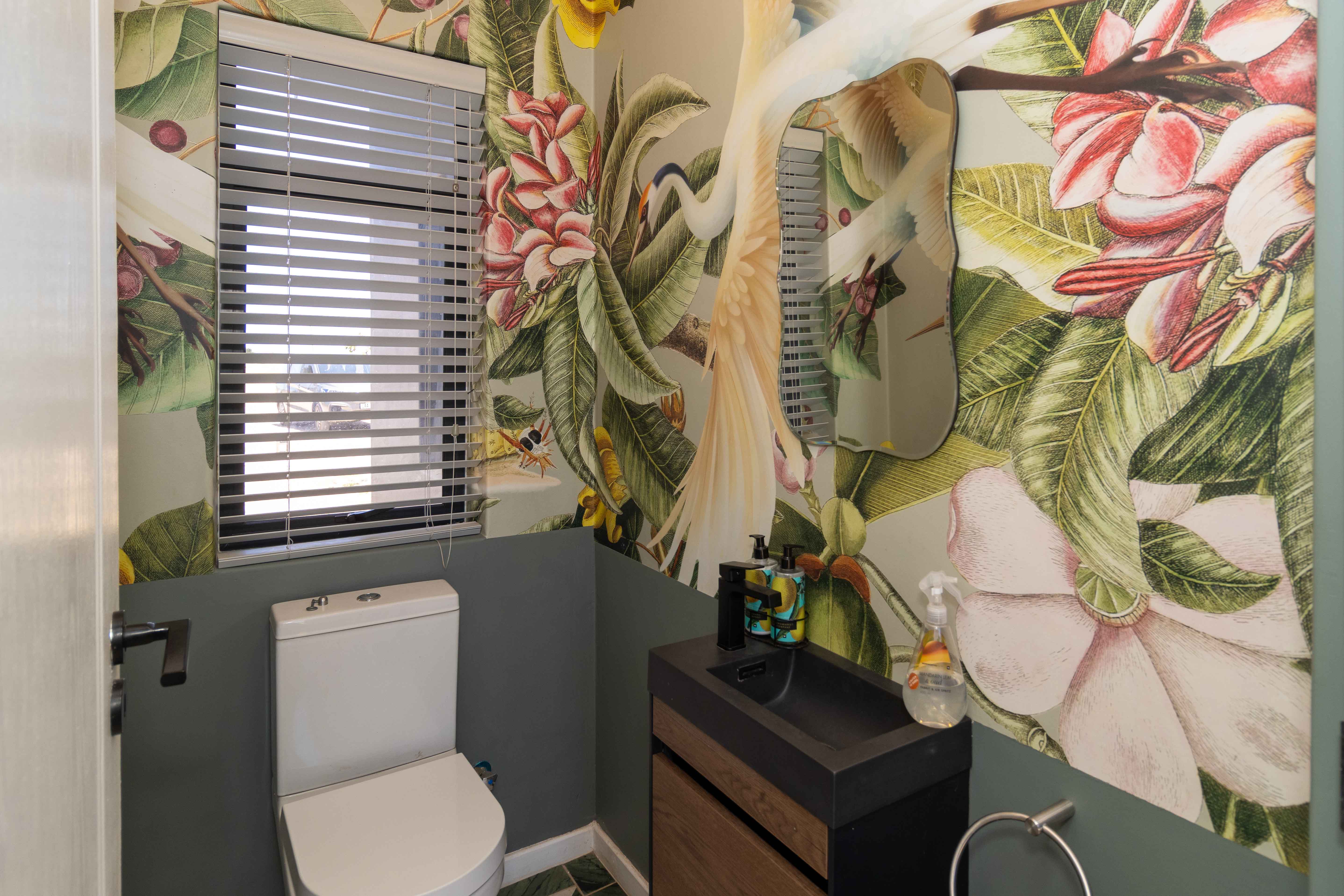 Both guest bedrooms are generously sized and serviced by a stylish, modern full bathroom. A guest toilet is conveniently located near the entrance. The dedicated study enjoys panoramic vistas of the estate, with horses roaming peacefully in the background — an inspiring setting for work-from-home living.