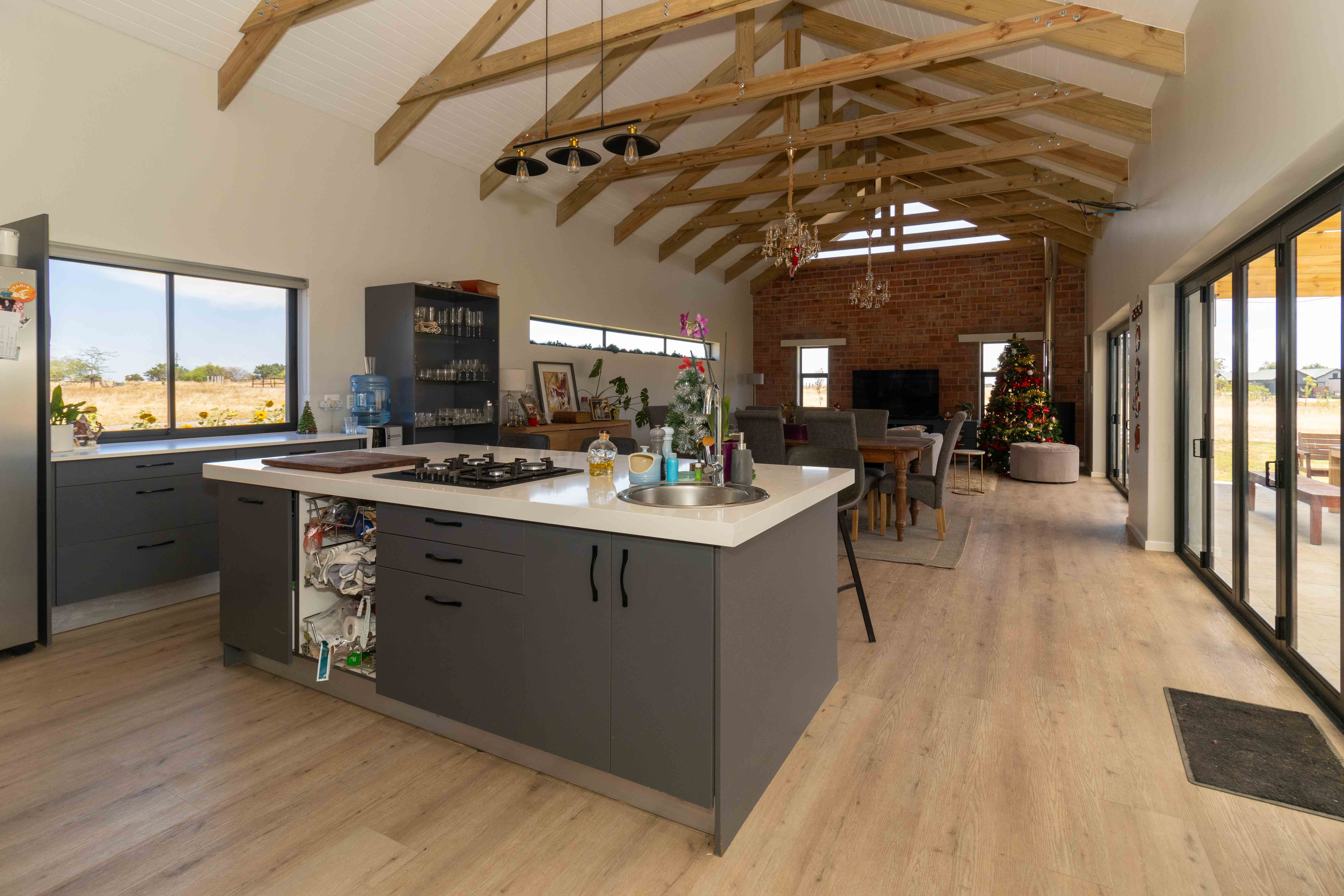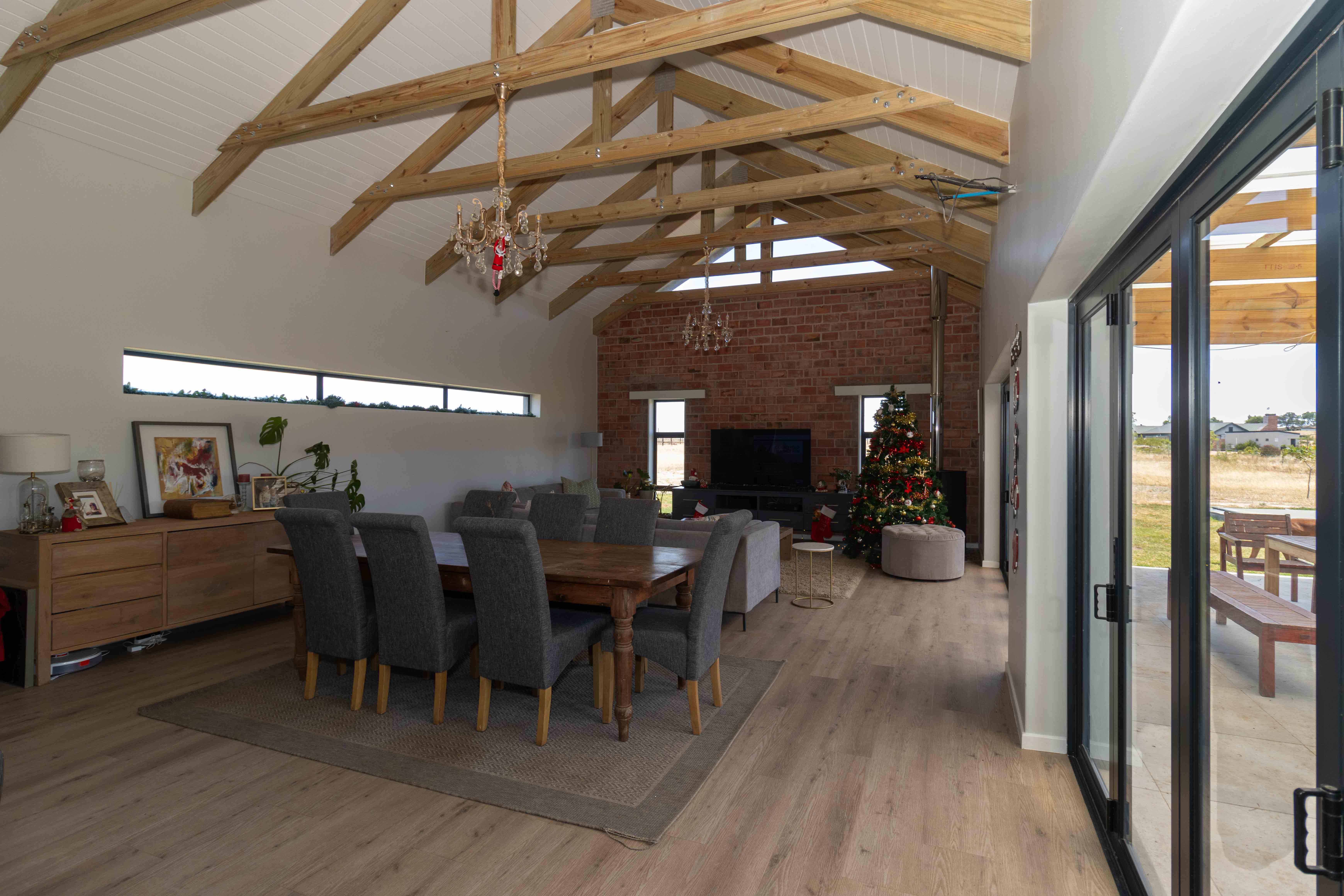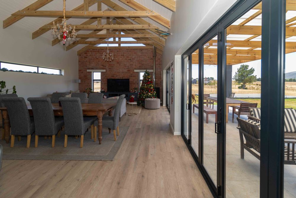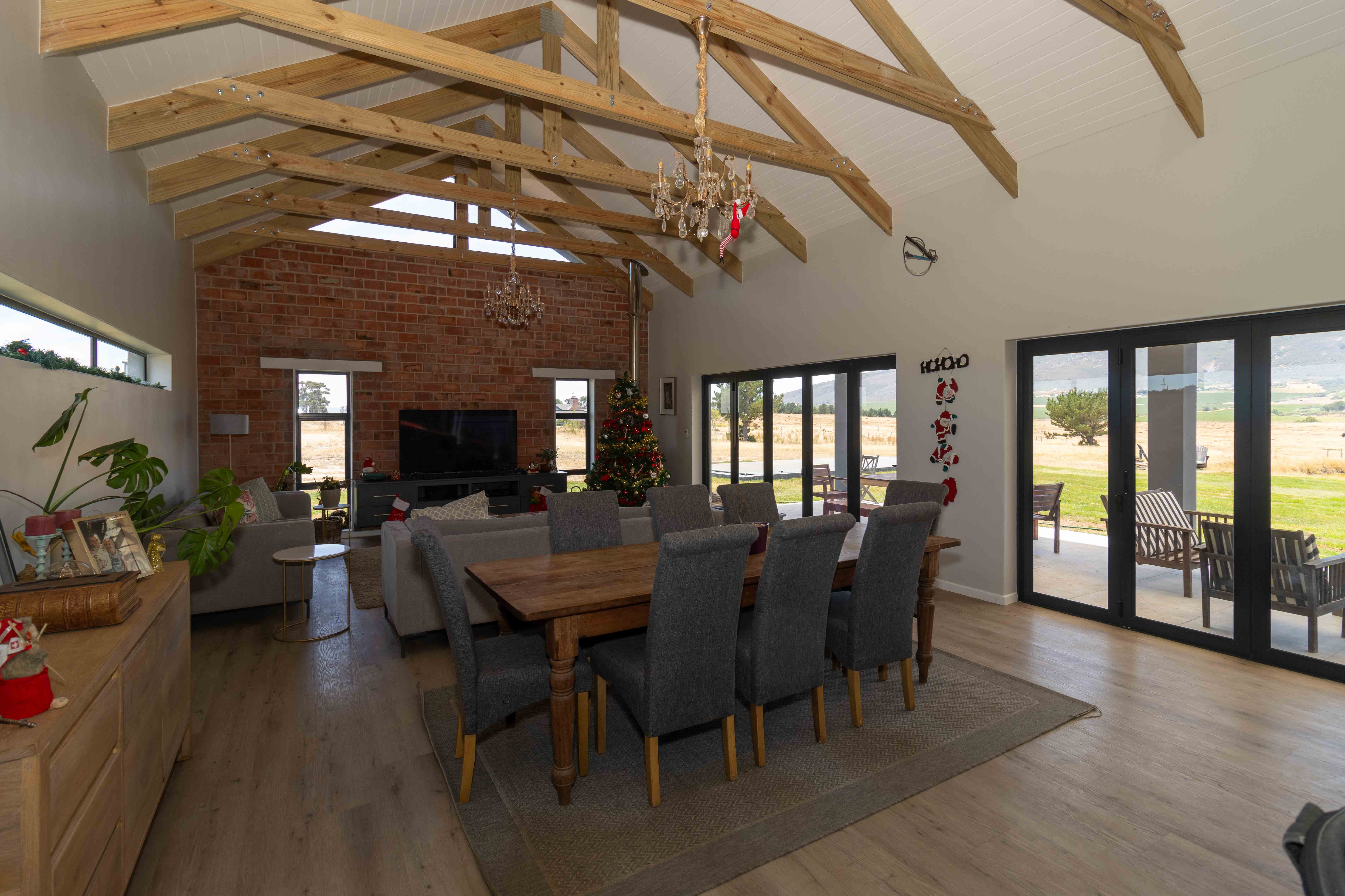 Inside, the home offers a spacious open-plan living area with a fireplace and a modern kitchen with a separate scullery. The versatile entertainment area can be enclosed to extend your indoor living space, flowing naturally into the garden, pool area, and surrounding views.