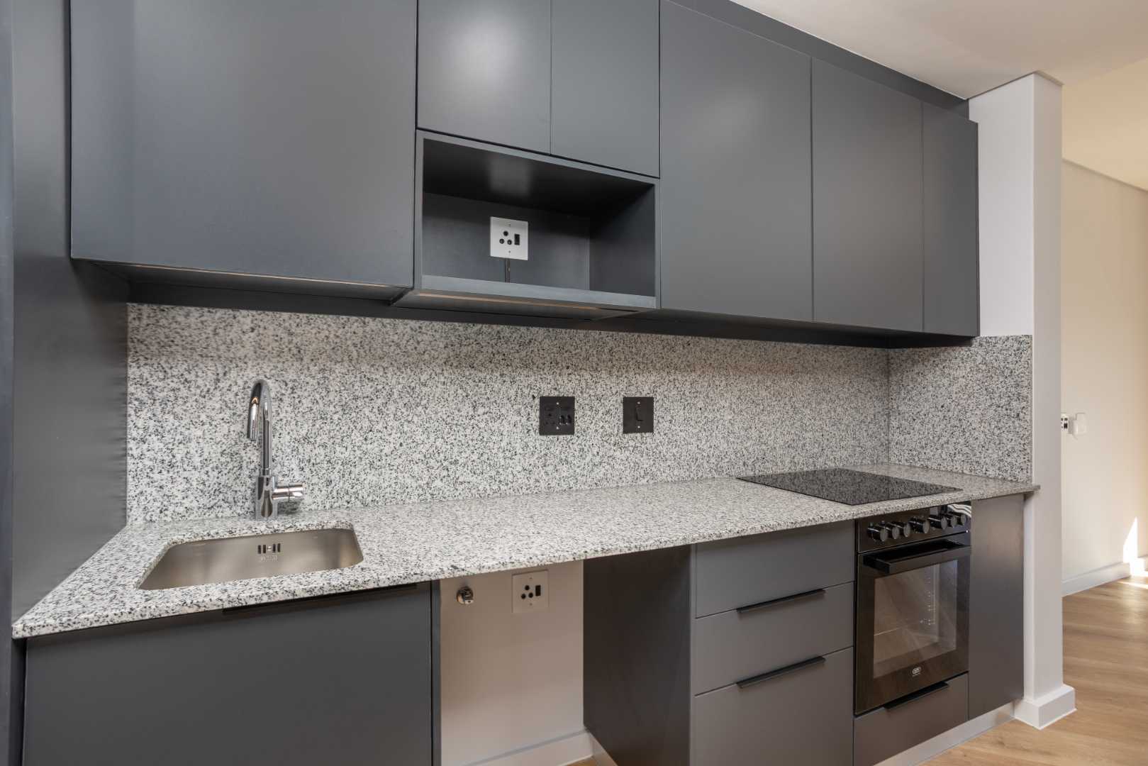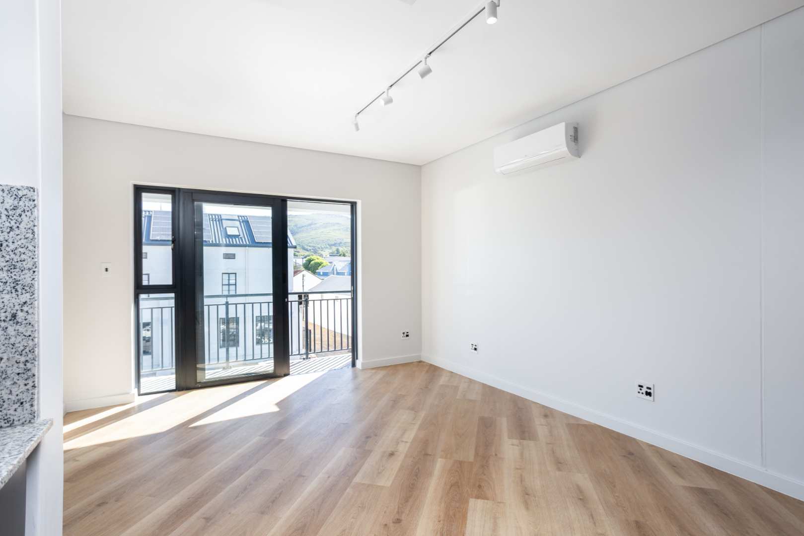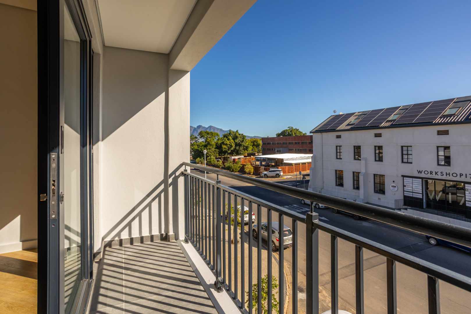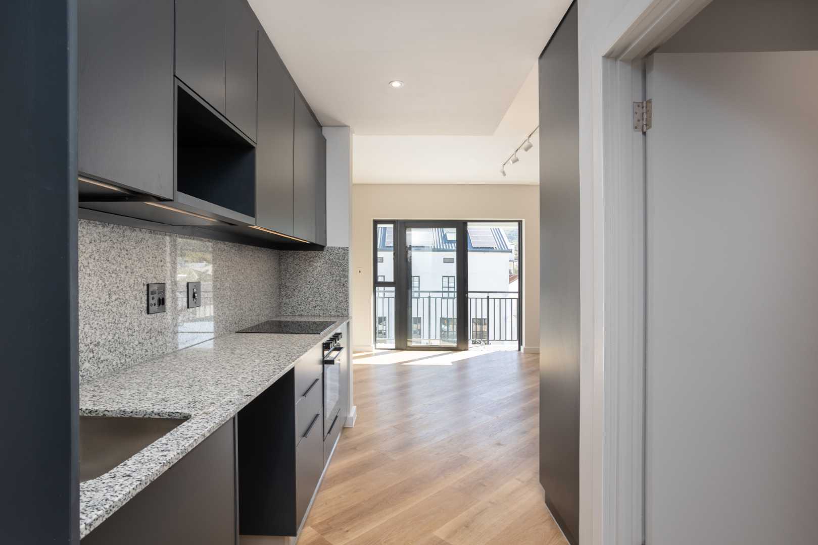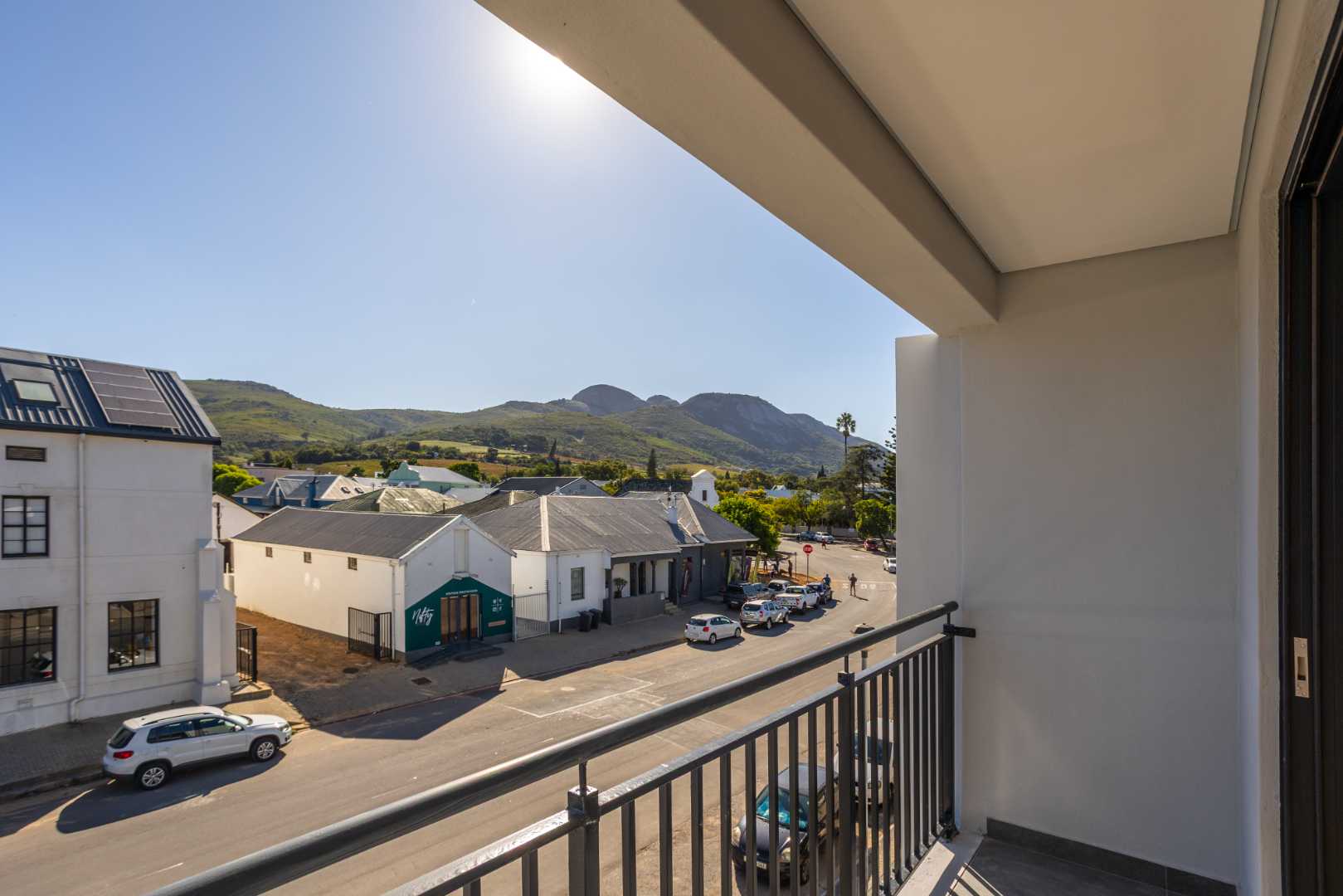 The beautifully designed open-plan layout features a sleek kitchen with high-end finishes. A balcony lets in ample natural light against the backdrop of Paarl Mountain and the majestic Bretagne Rock.