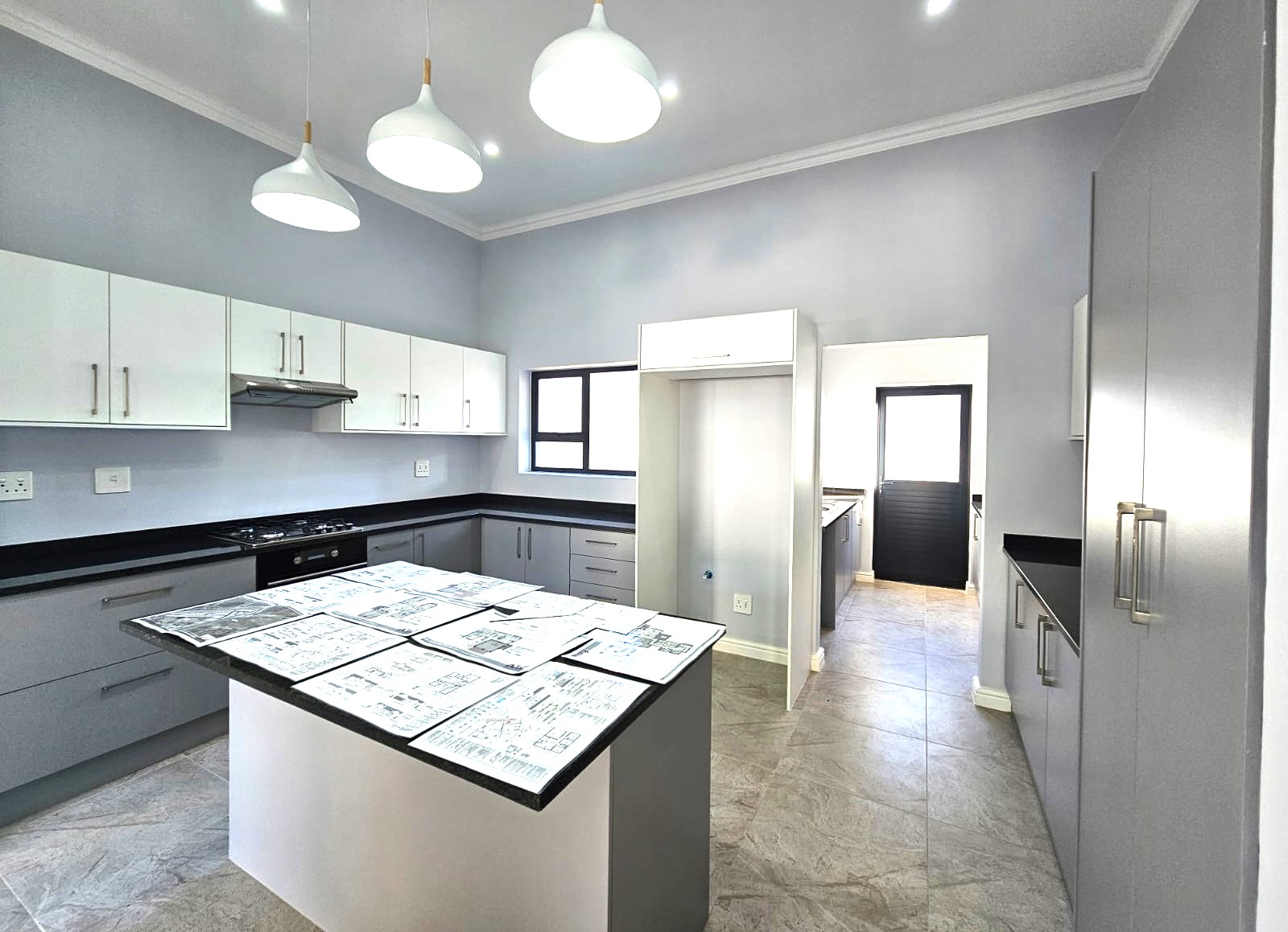 Modern melamine kitchen with granite tops, gas hob, electric