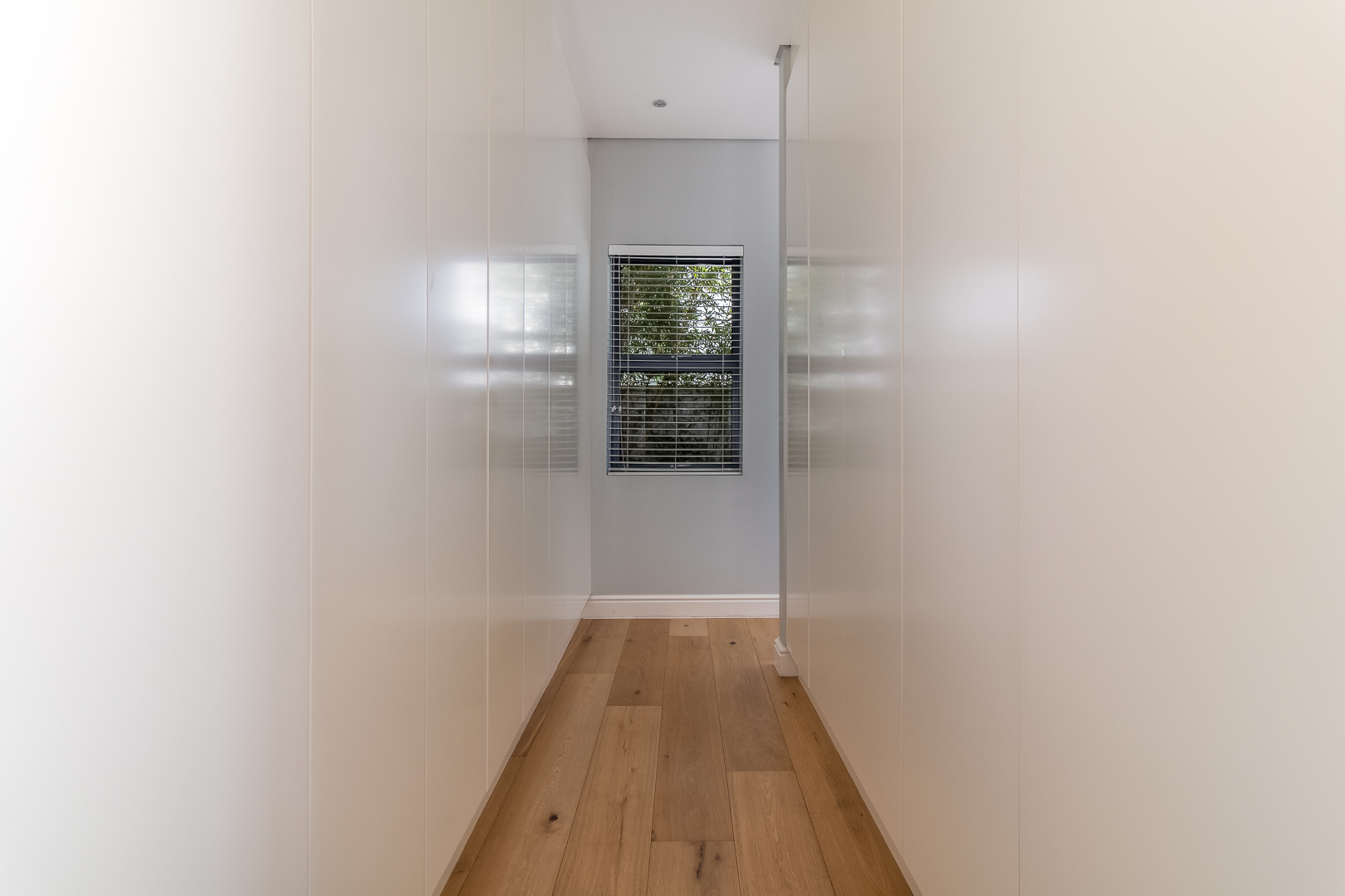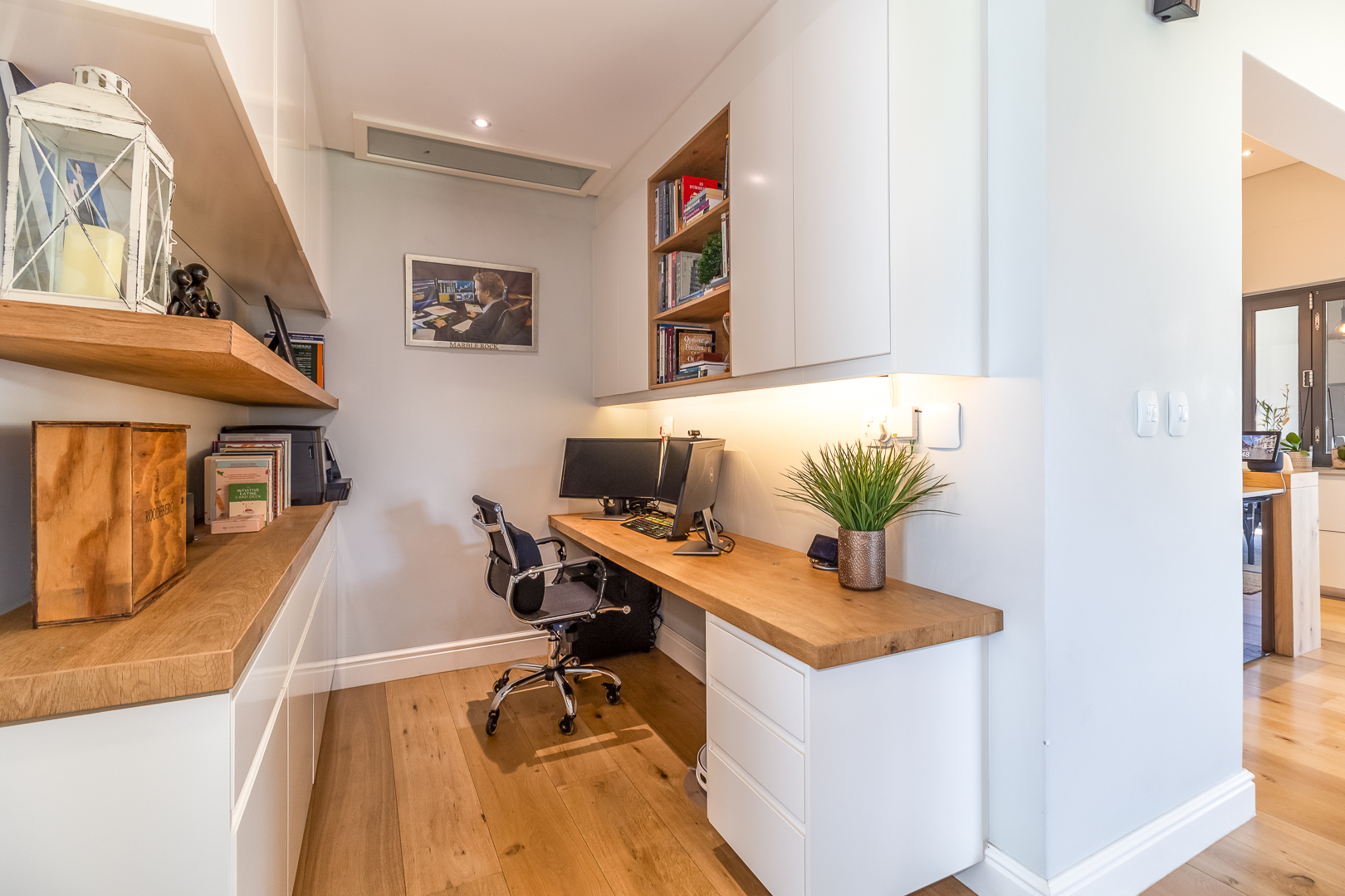 - A spacious entrance hall leads to a dedicated study with built-in desk, cupboards, and bookshelves.
