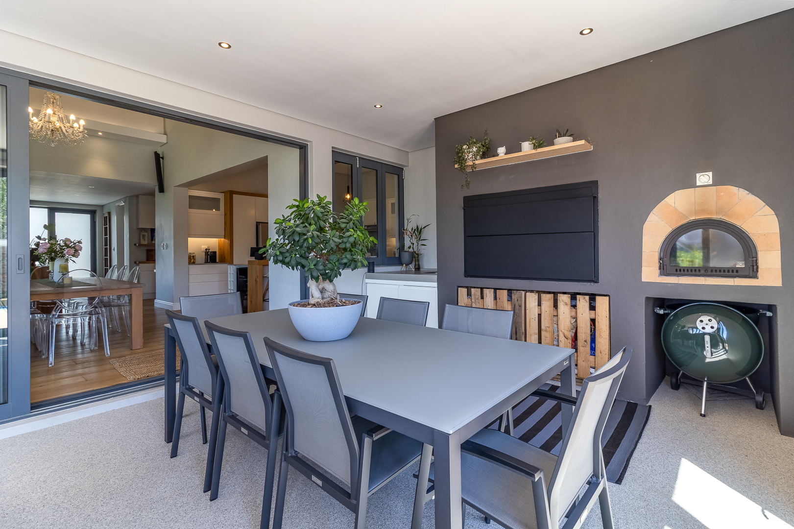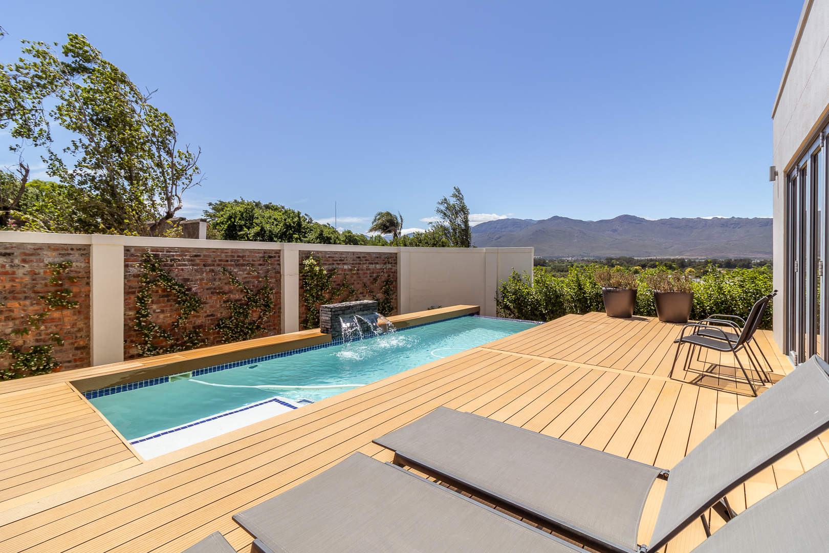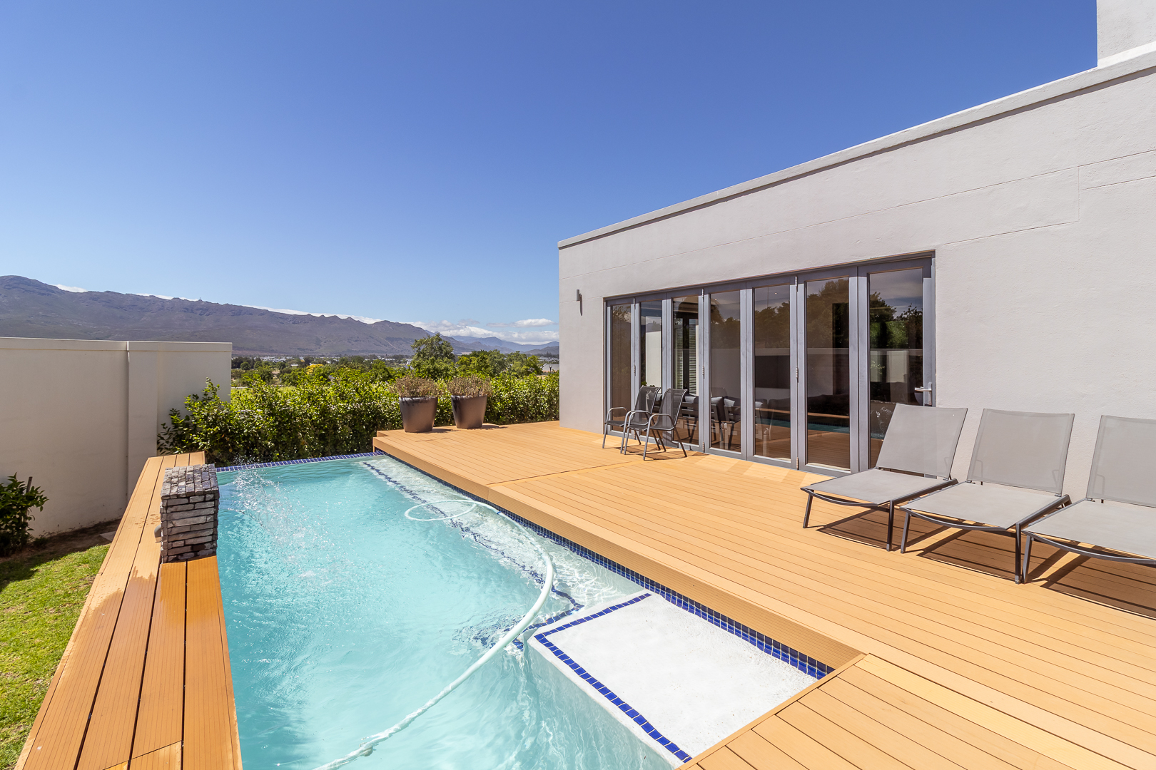 The entertainment room features quartz carpet flooring, a built-in braai, pizza oven, and jacuzzi. Stack doors open directly onto the pool area and compact garden — all overlooking vineyards and the Drakenstein mountains. The gunite pool includes a remote-control cover and is surrounded by composite decking.