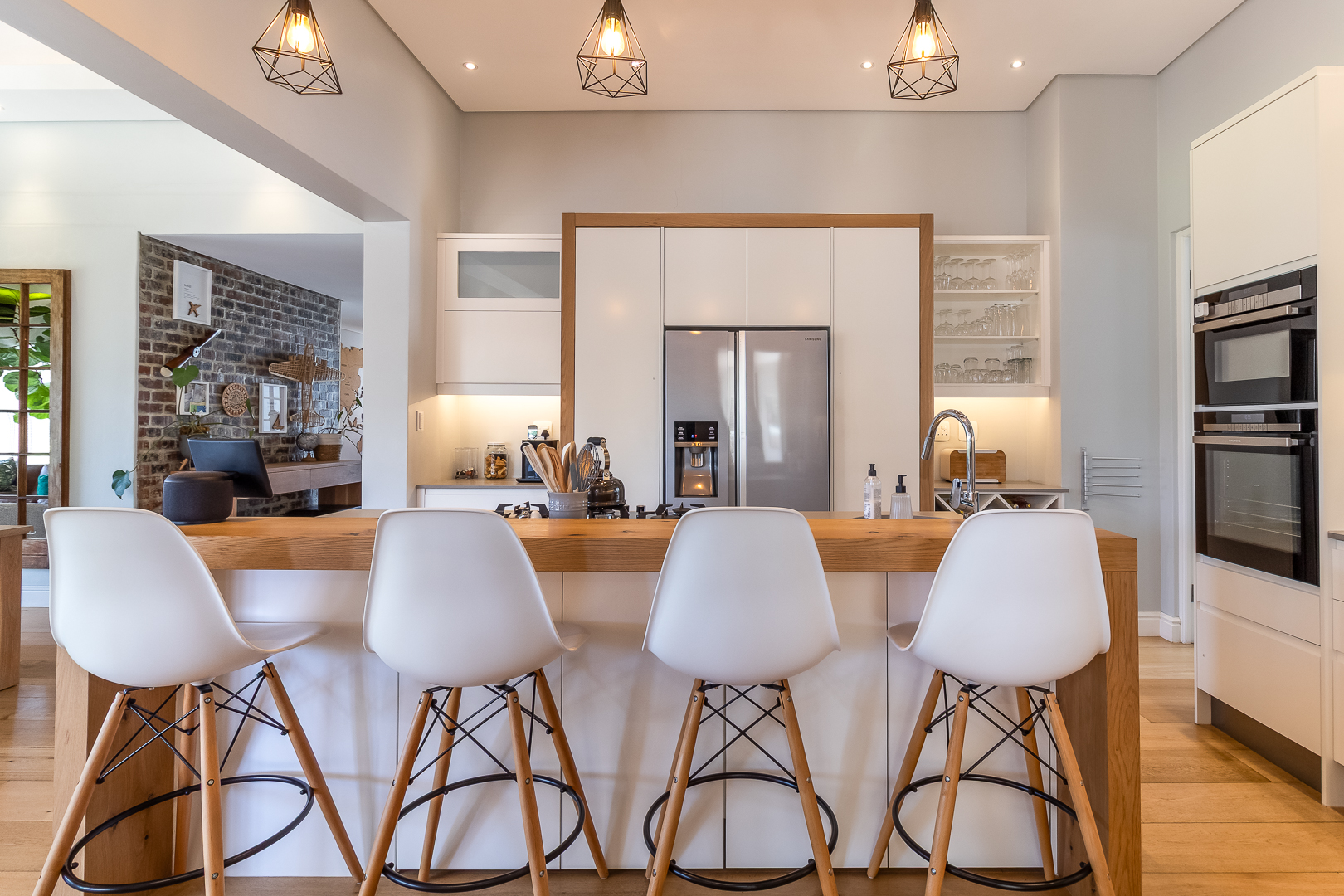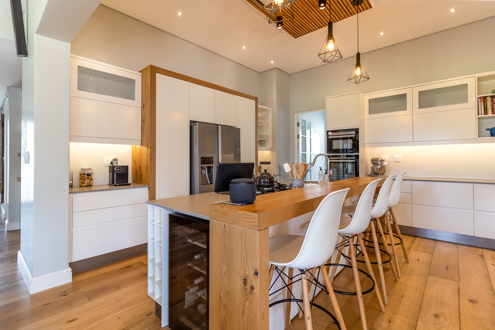 - The modern open-plan kitchen features Caesarstone countertops, a Grundig hob and oven, and a wine cooler.