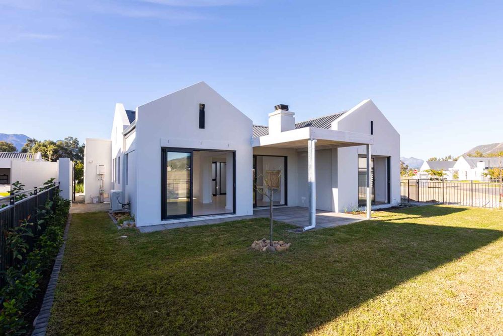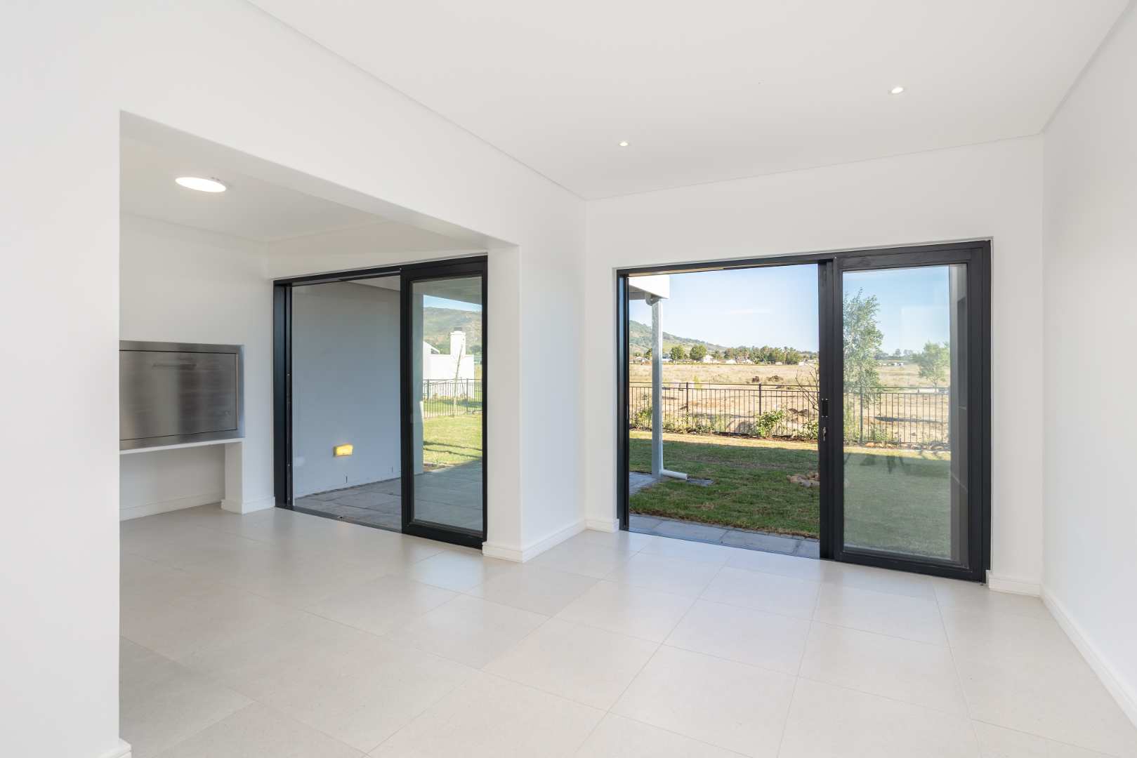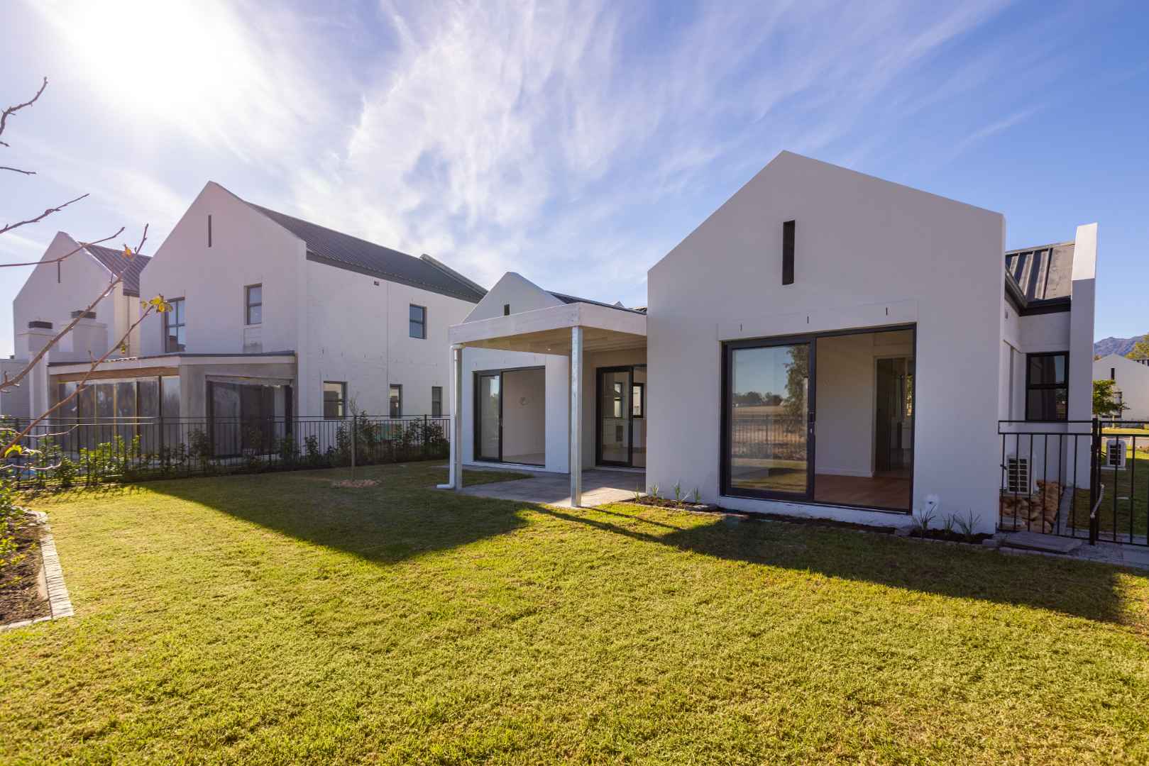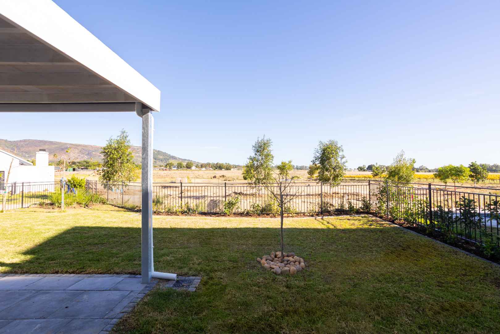 Entertaining is a delight with a built-in stainless-steel braai, ideal for gatherings and enjoying the weather and striking sunsets. A double garage provides secure parking and storage. Outside, a low-maintenance, irrigated garden overlooks a beautifully landscaped park and surrounding vineyards.