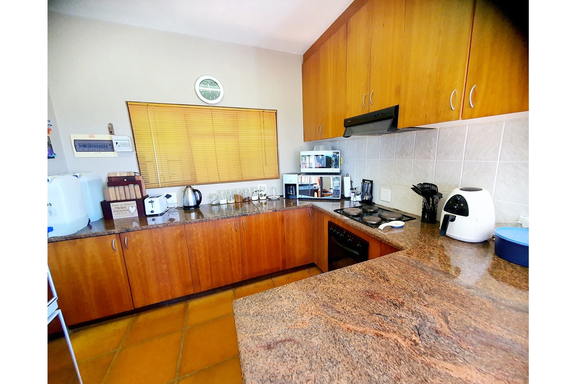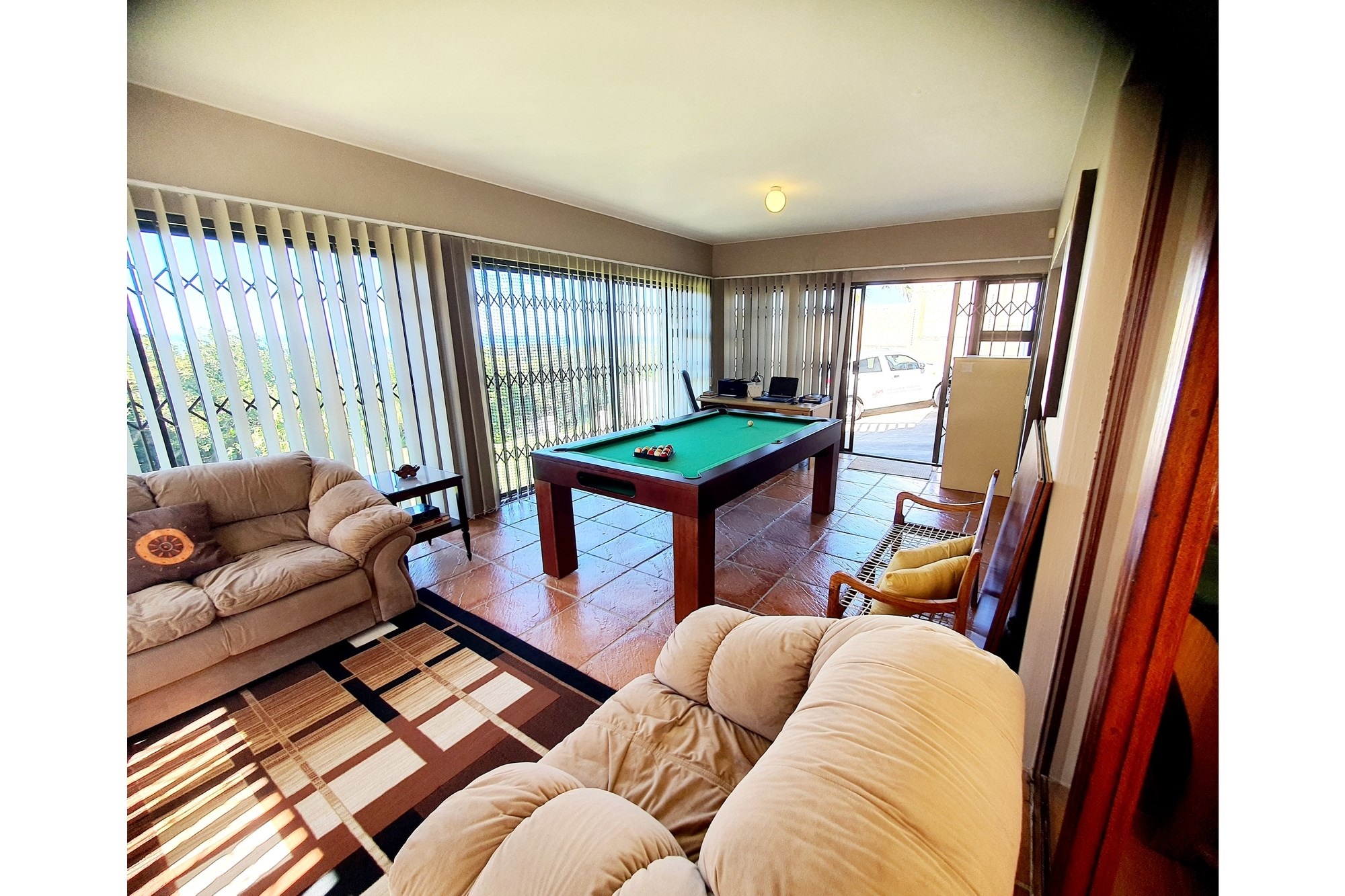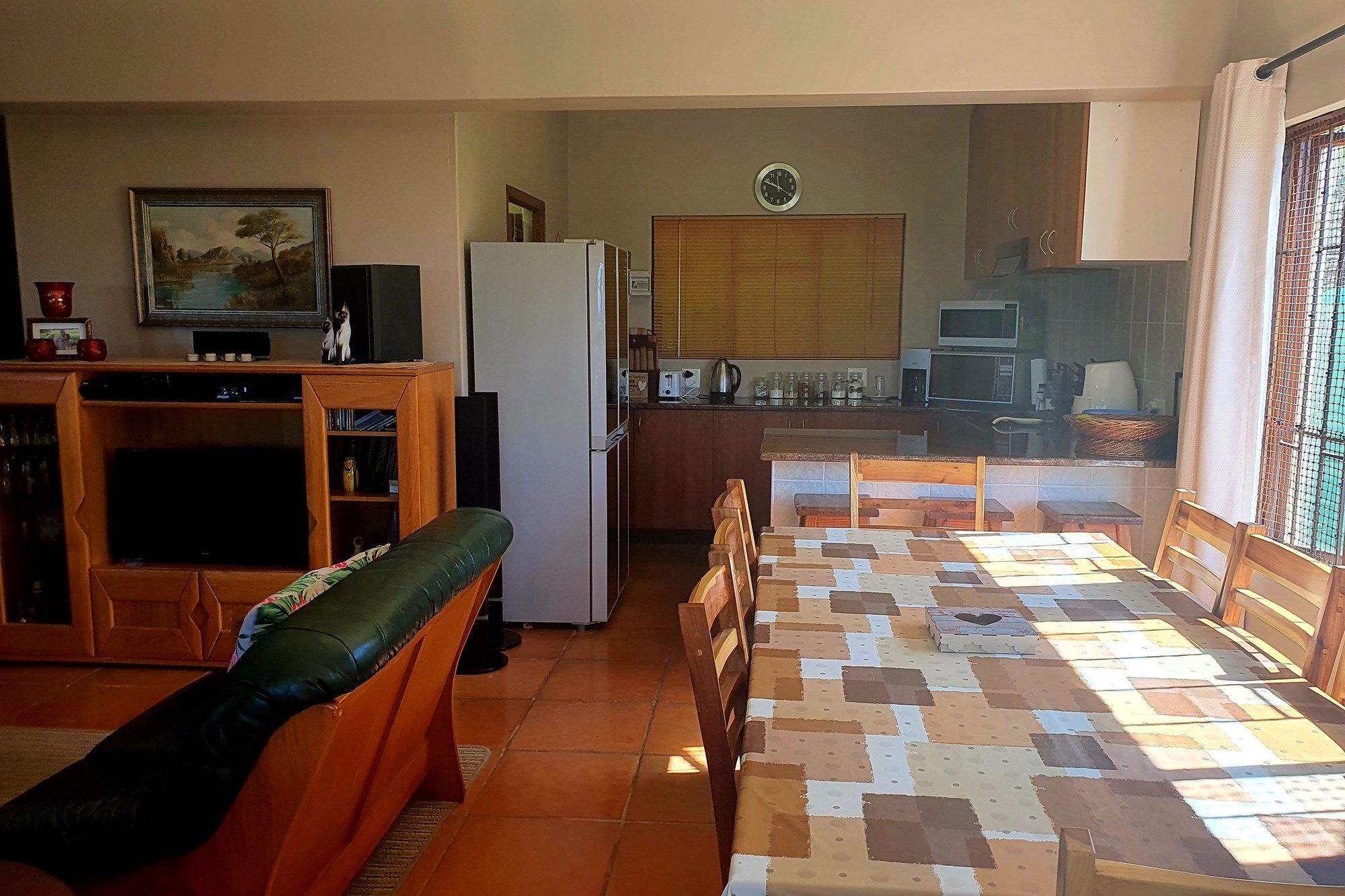 The kitchen is a chef’s delight, featuring rich brown granite countertops, modern built-in cabinetry, and a generous wash-up area and scullery with space for a washing machine, dishwasher, and tumble dryer. The open-plan dining room leads into a large lounge or entertainment area—perfect for hosting, with room for a snooker table and lounge suite.