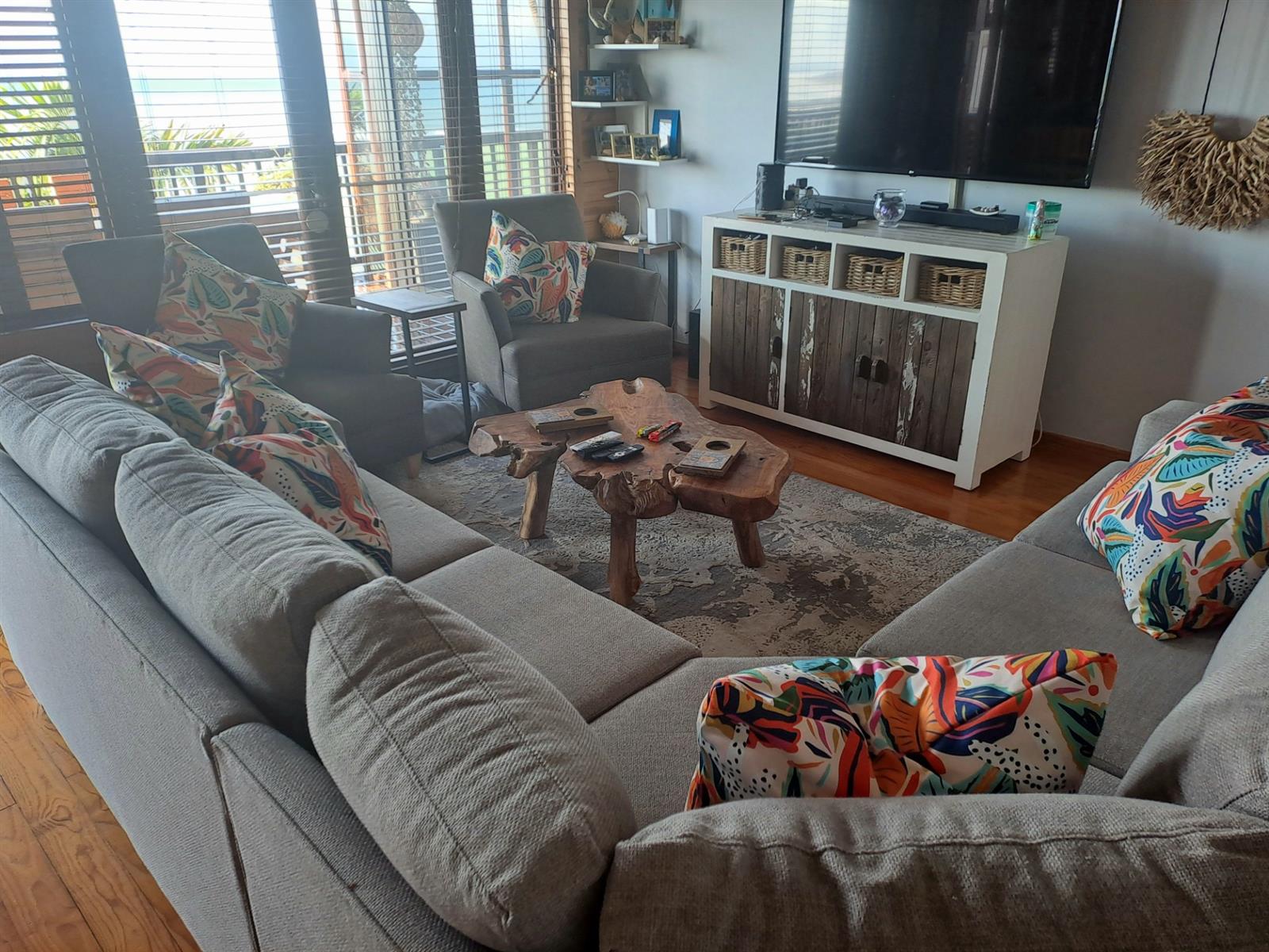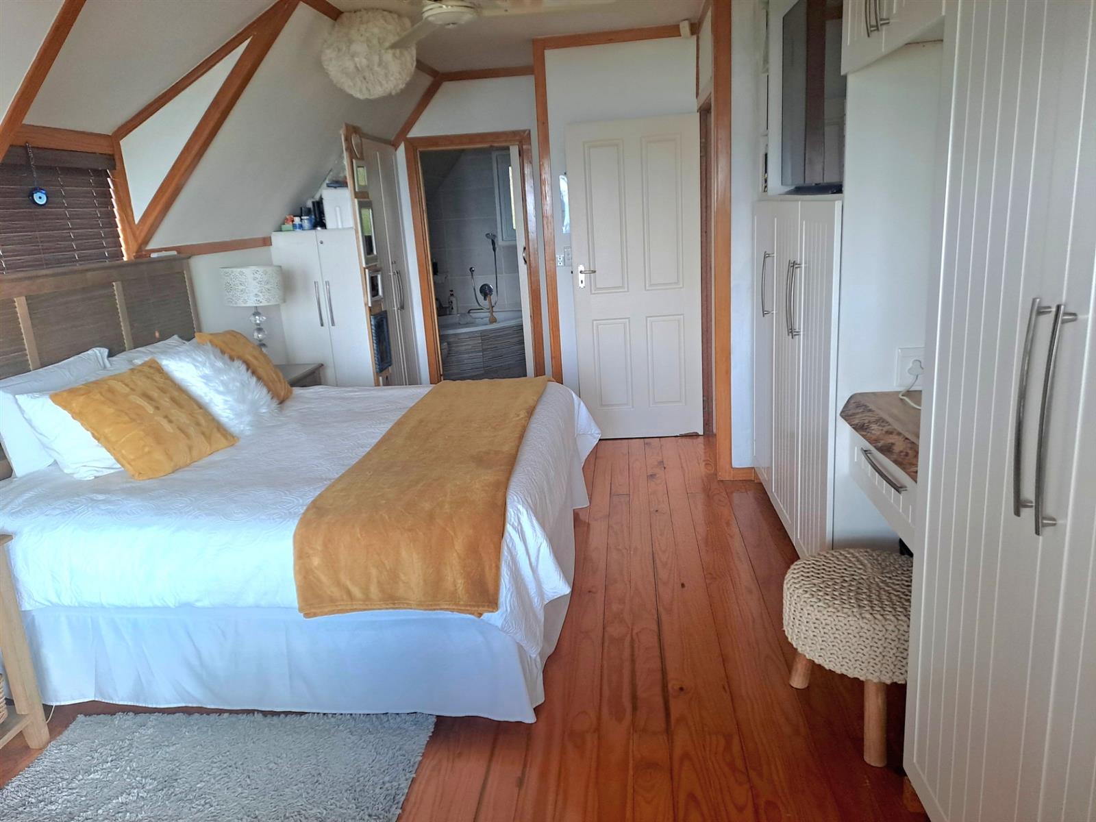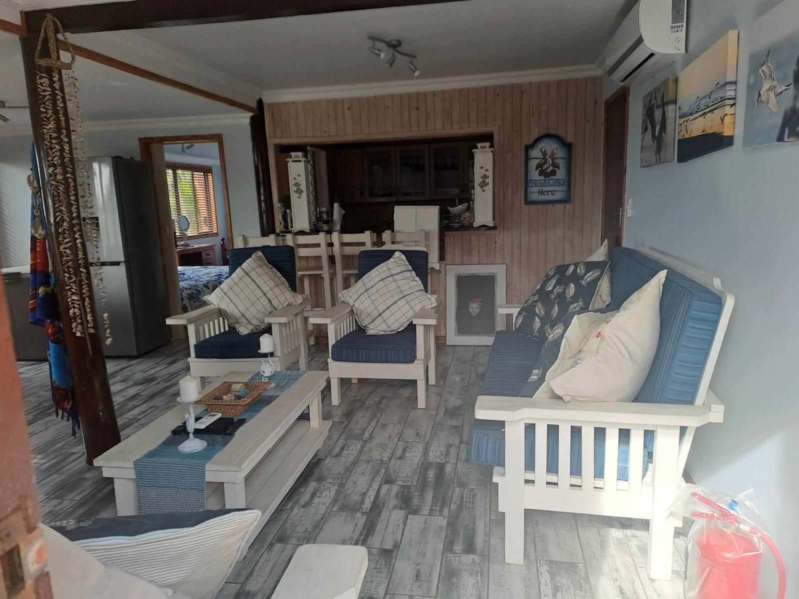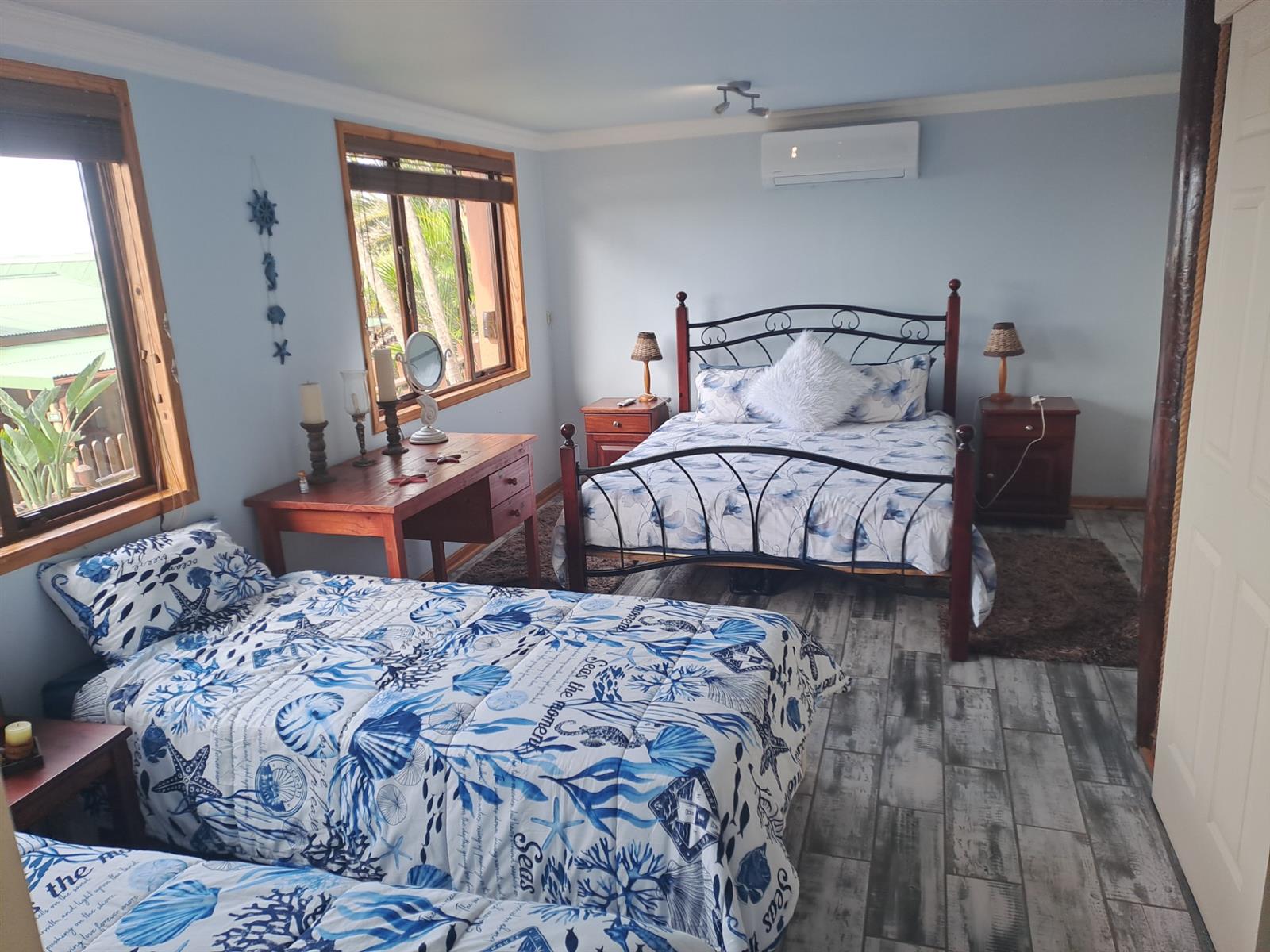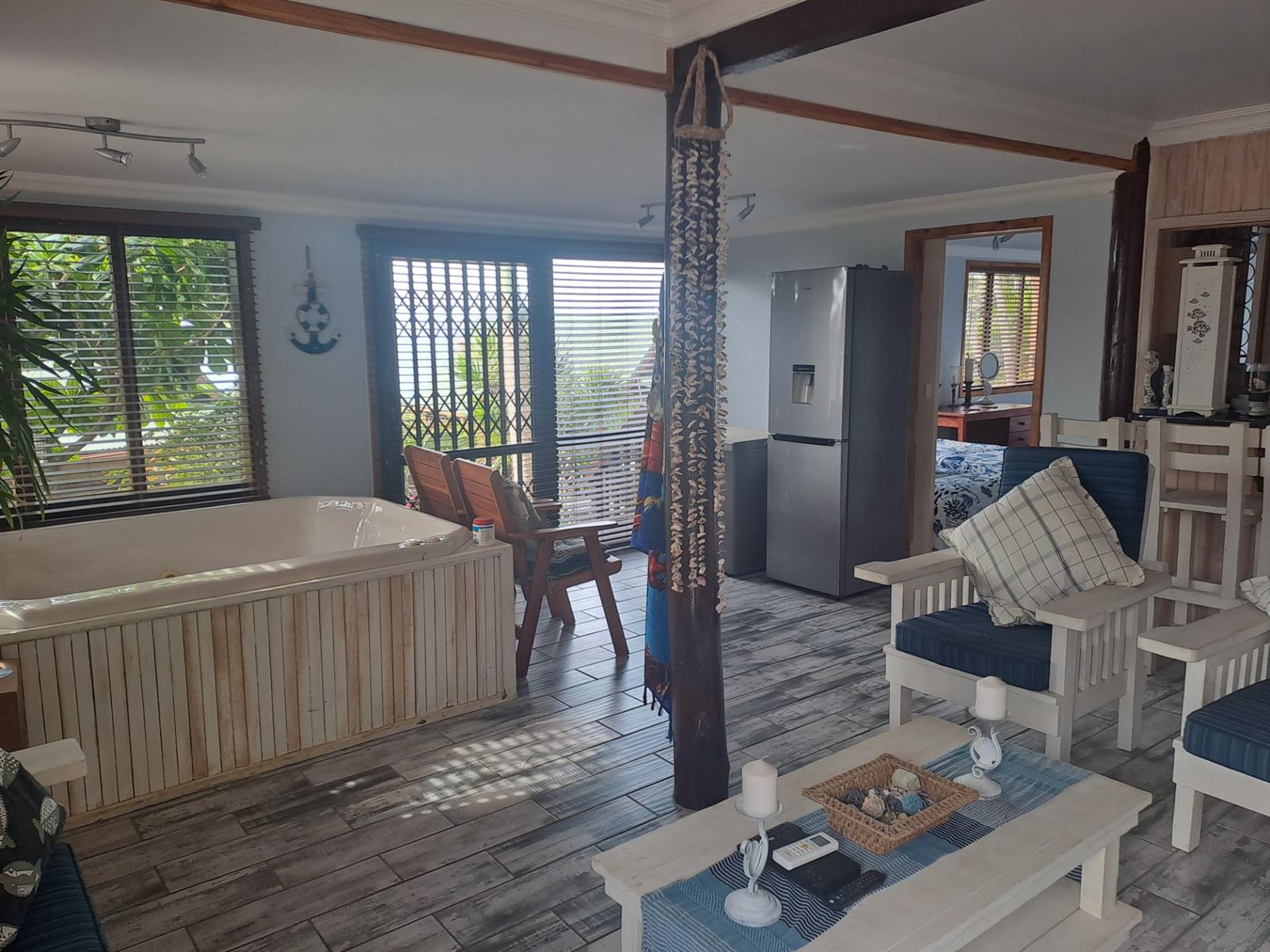 .You are going to be enchanted by the ultra private main house with its expansive wooden deck. The ocean vistas are simply incredible. This is probably where you are going to want to spend most of your time!. There is a seamless inside/outside flow from large open plan living areas. The finishes throughout this home are beautiful and up to date. The bathrooms are modern, the bedrooms spacious and the tastefully renovated eat- in kitchen has plenty of cupboards, beautiful granite tops and space for all your appliances! Stacking windows open to the built in braai area in a corner of the deck. A delightful feauture is the enclosed " pajama lounge" linked to the master bedroom. It forms part of the deck. There is a tandem double garage with a seperate storage area for all your "toys", as well as APPROVED plans for a carport. An INVERTER with 3 batteries and two 5000 l water tanks ensure electricity and water at all times. Provision has also been made for rainwater harvesting. Many extras include 5 airconditioners- 3 upstairs and 2 downstairs.