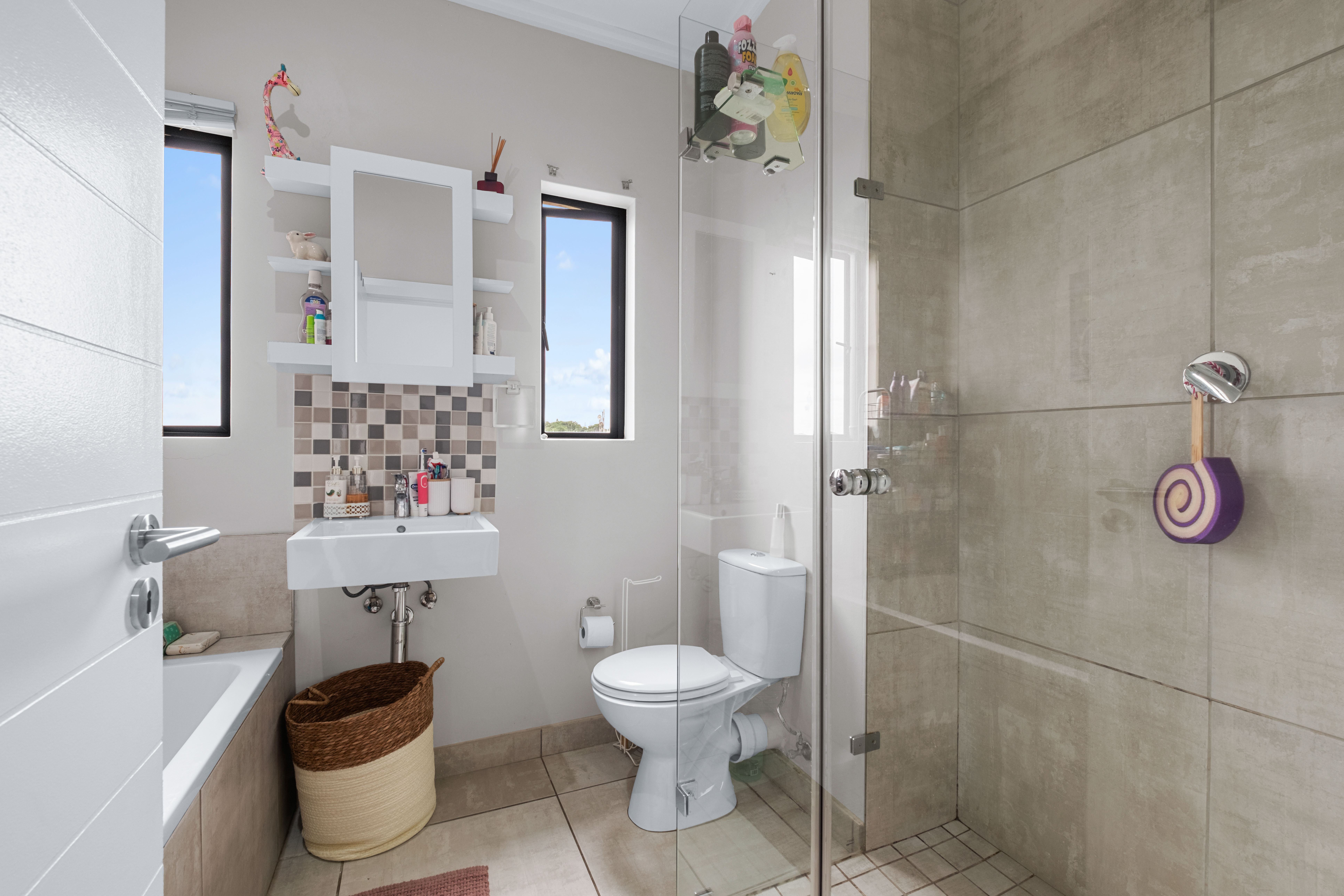 Step inside to a bright and airy open-plan living space. The modern kitchen features sleek finishes and ample cupboard space, flowing seamlessly into the dining and lounge areas —which is just perfect for everyday living and effortless entertaining. Large sliding doors open onto a private patio, creating ideal indoor–outdoor flow. Upstairs, both bedrooms are generously sized with built-in cupboards. The main bedroom boasts a stylish en-suite bathroom, while a second full bathroom serves the additional bedroom. A convenient guest toilet downstairs adds extra practicality.