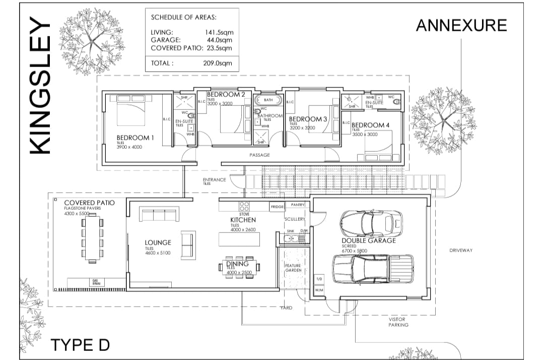 The "Type D" option has 4 bedrooms and 3 bathrooms, with the main en-suite. The kitchen and living areas are open plan, leading to the patio and private garden.