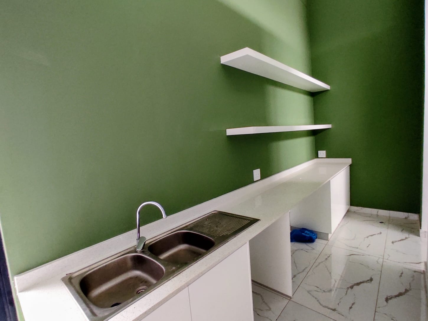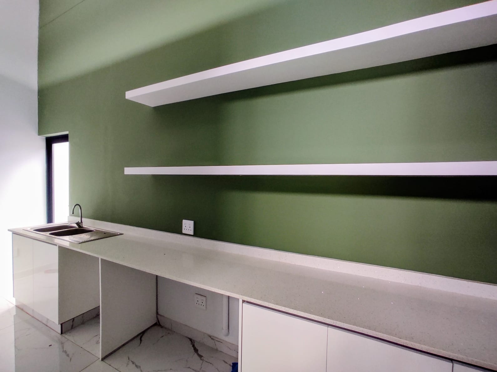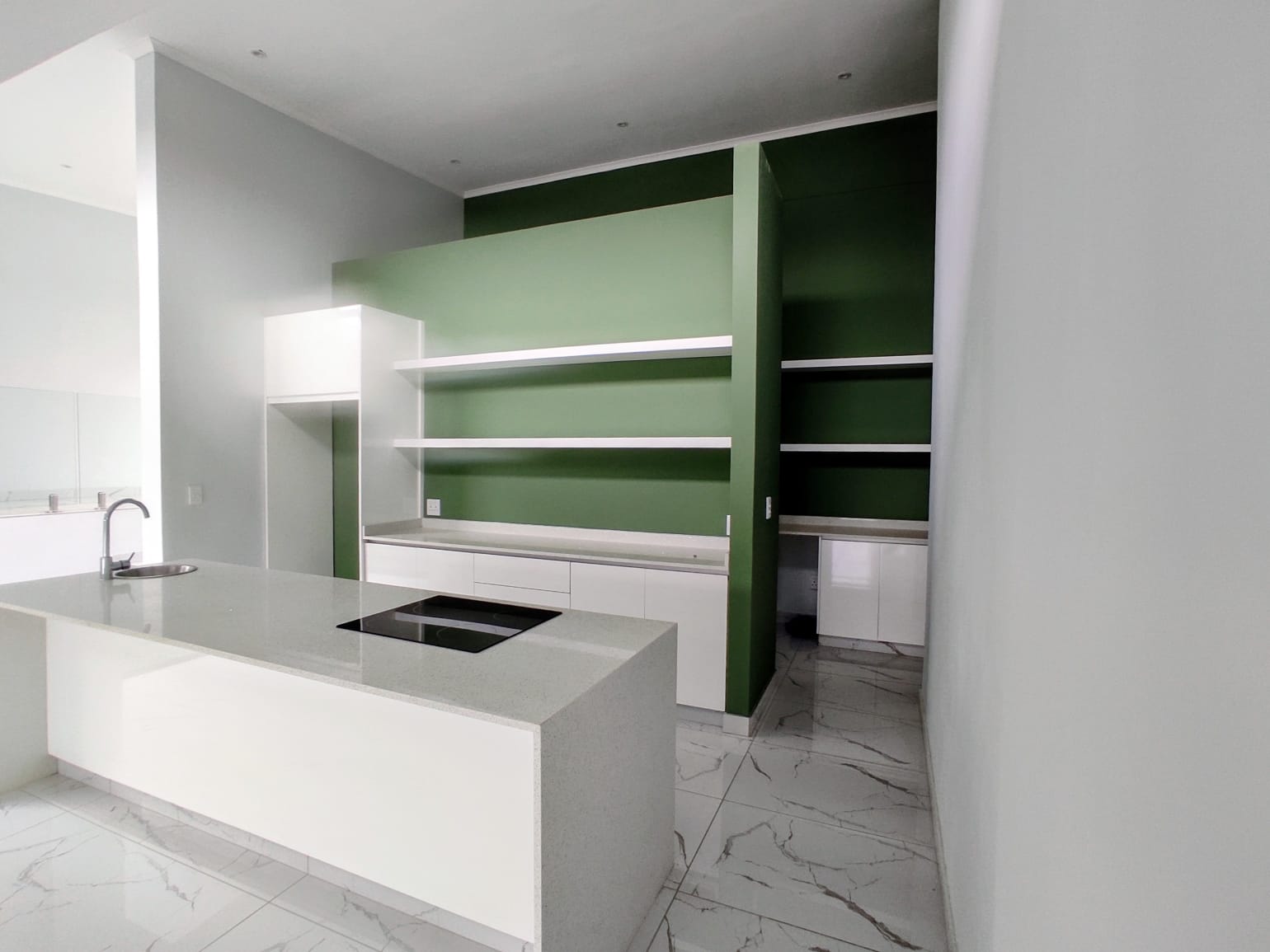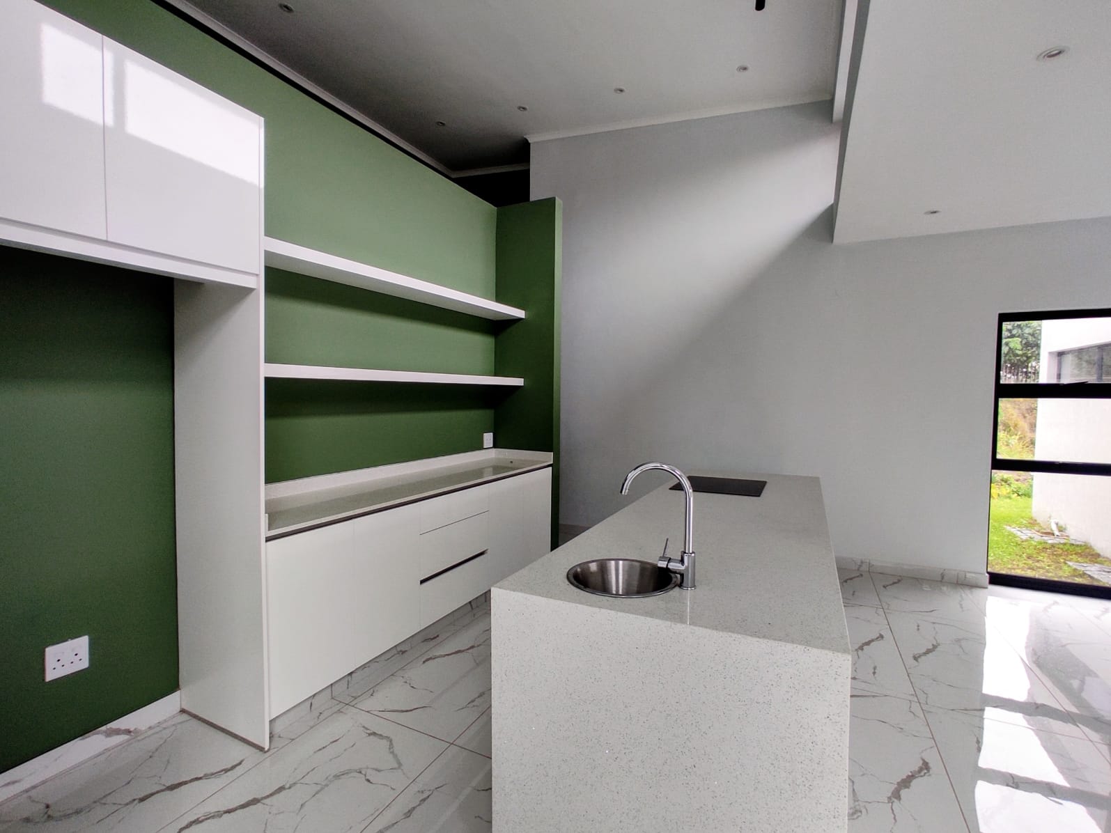 The modern green toned kitchen blends harmoniously with the natural surroundings, offering both style and functionality. Featuring a gas stove and open plan layout, it provides a sense of freedom and luxury for everyday living.