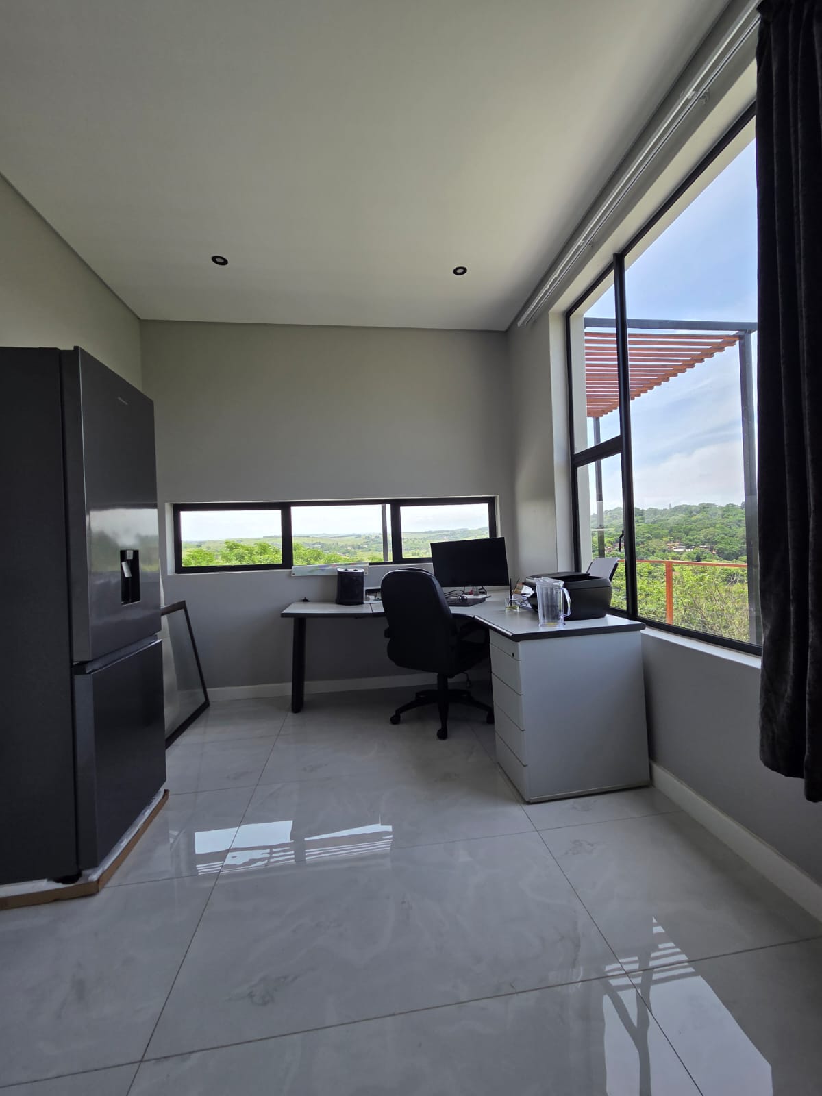 Upstairs, you’ll find three well-appointed bedrooms. The main bedroom feels especially generous, with plenty of cupboard space, a full modern en-suite bathroom, and its own balcony—an ideal spot to unwind with a book or simply take in the fresh air. The two additional bedrooms share a modern shower bathroom and a joined balcony that offers lovely views over the greenbelt and dam. The home is pet-friendly and includes a large garden area, giving children and pets space to play.