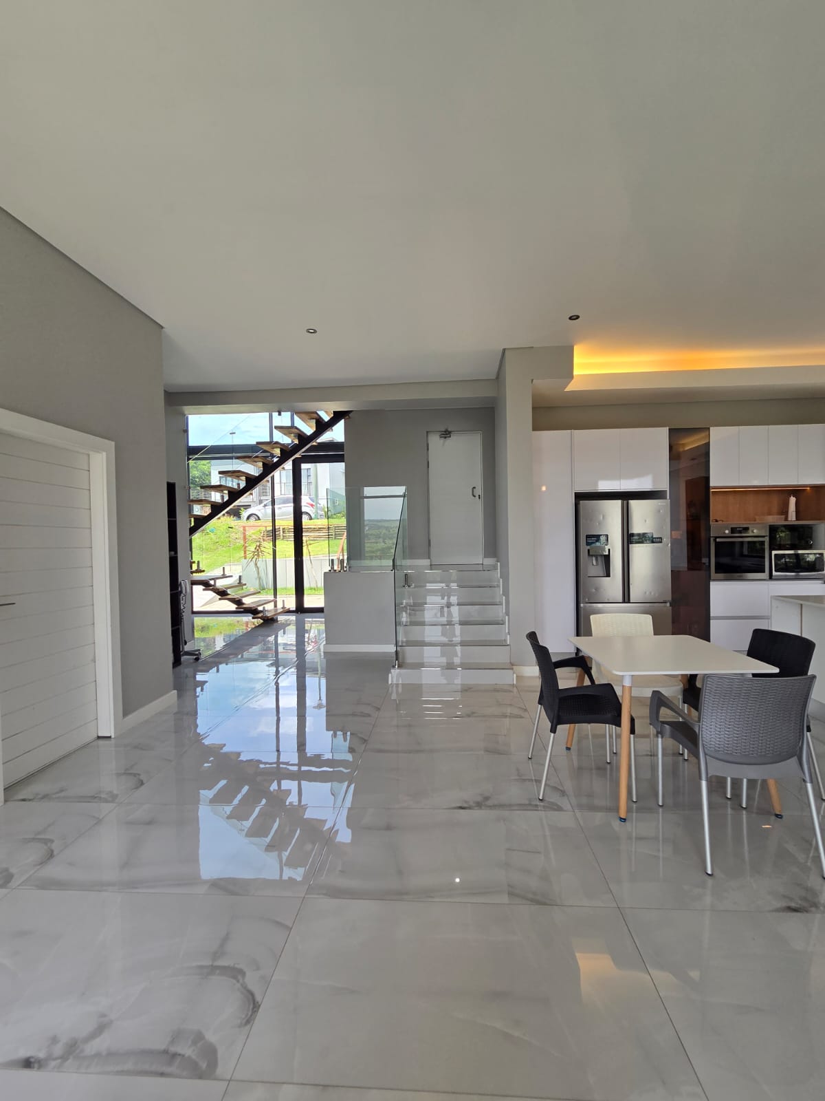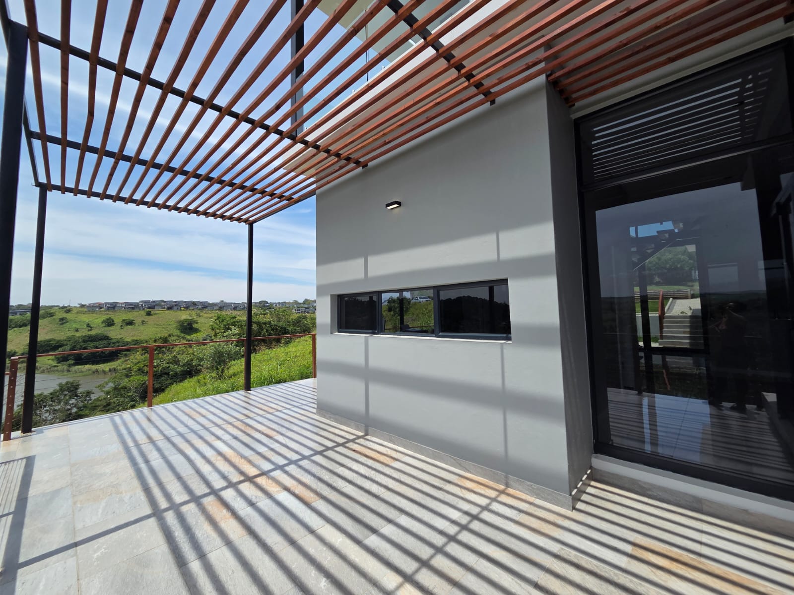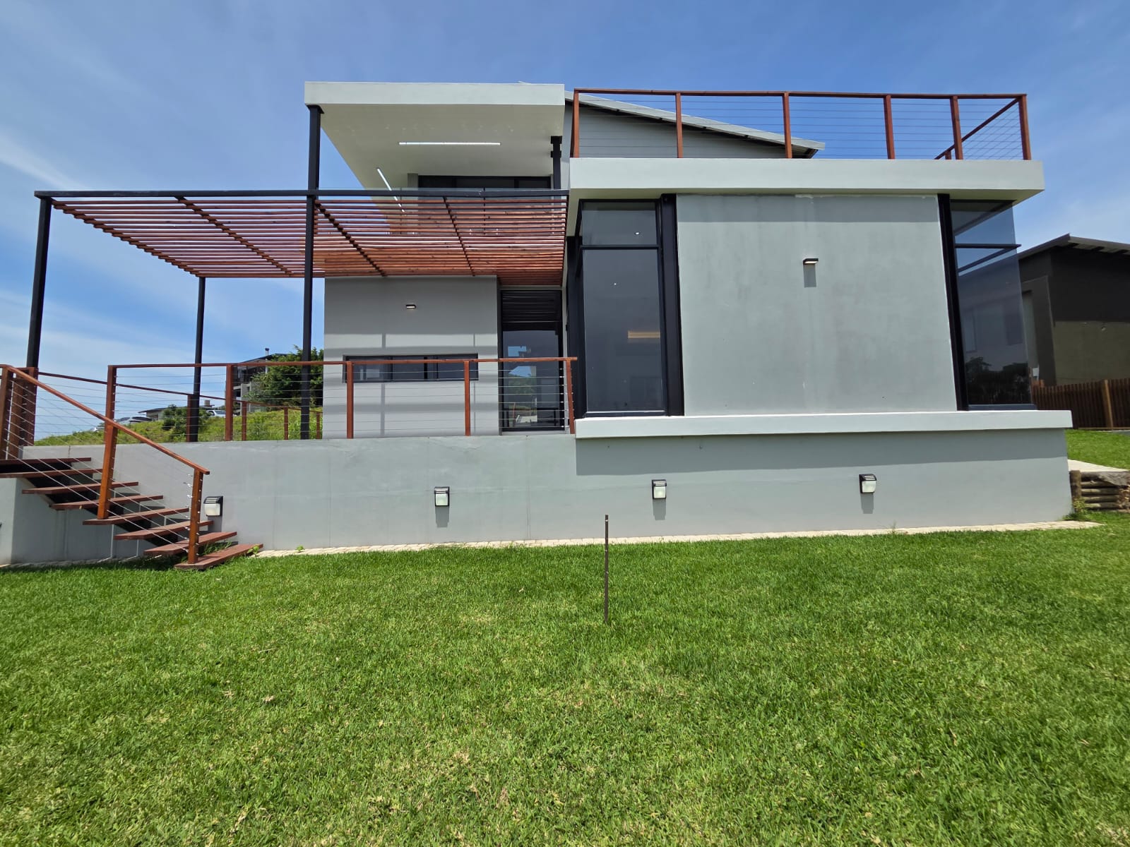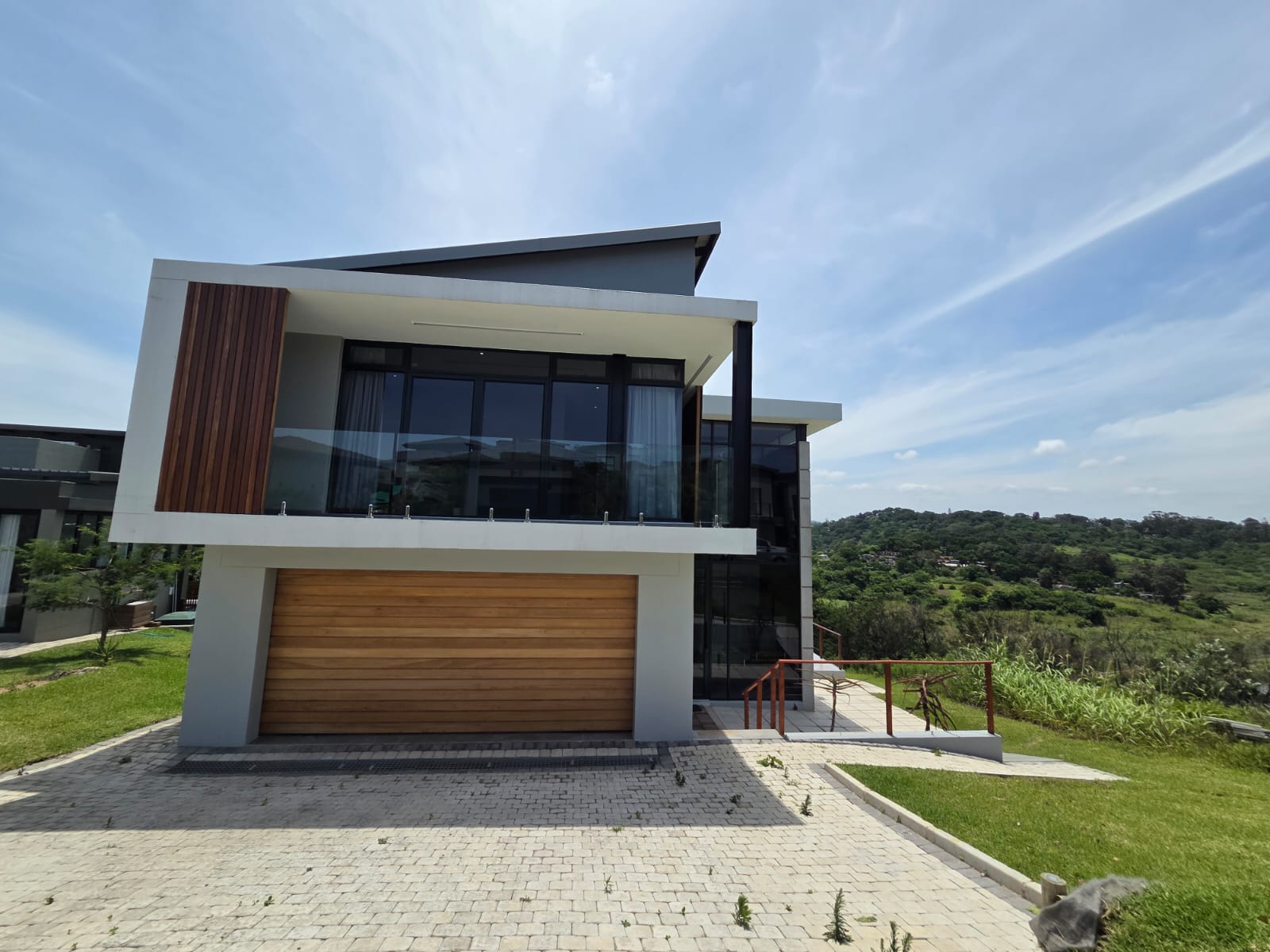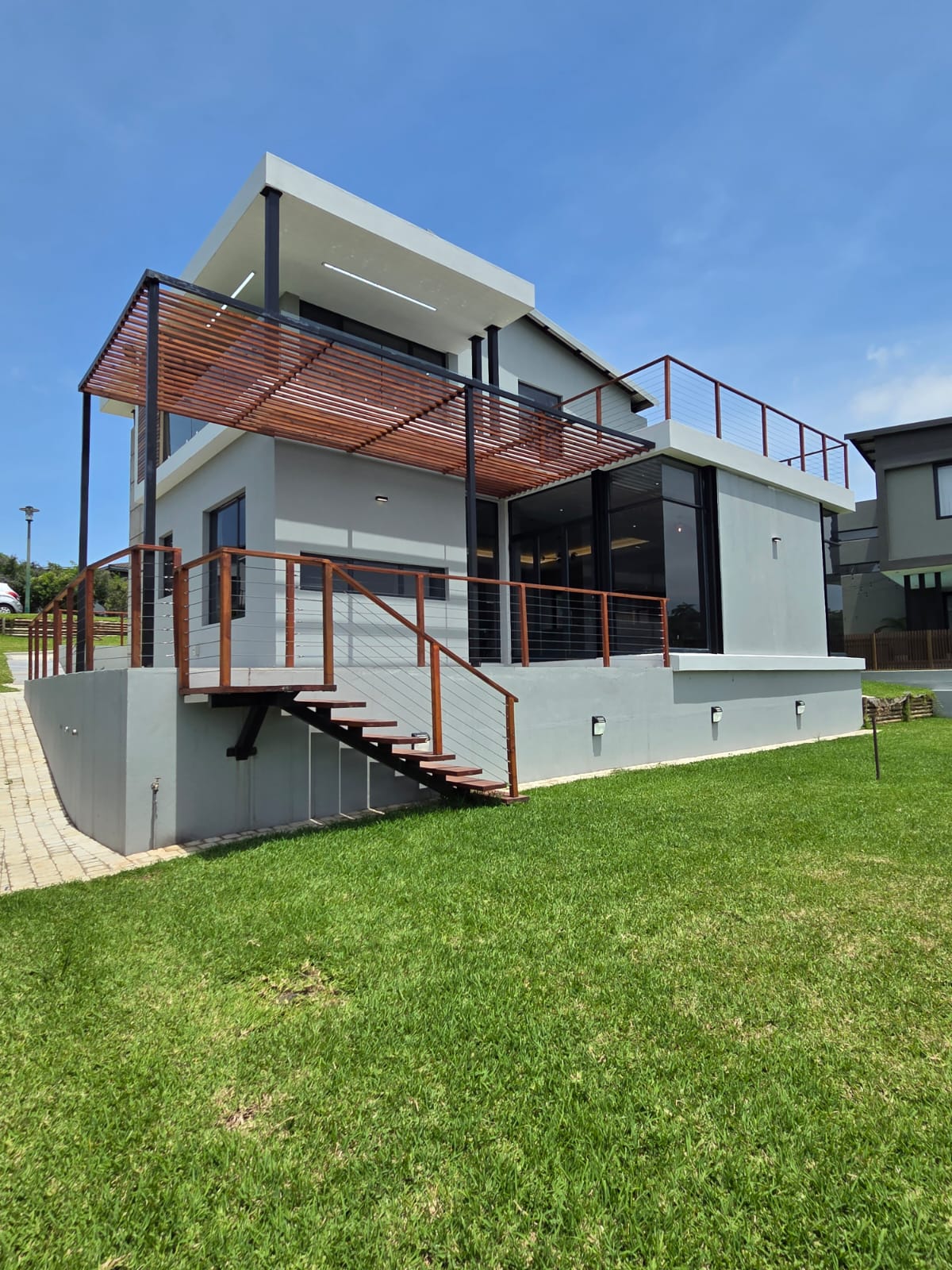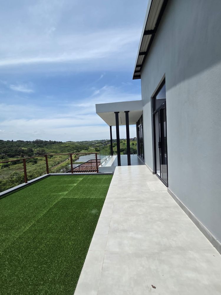 Upstairs, three well-appointed bedrooms offer space and comfort. The main bedroom is particularly generous, with ample cupboard space, a full modern en-suite, and a private balcony—an ideal retreat to unwind and enjoy the fresh air. The two additional bedrooms share a contemporary shower bathroom and a joined balcony overlooking the greenbelt and dam, creating a serene and peaceful outlook. The pet-friendly home also boasts a large garden, providing plenty of room for children and pets to play.