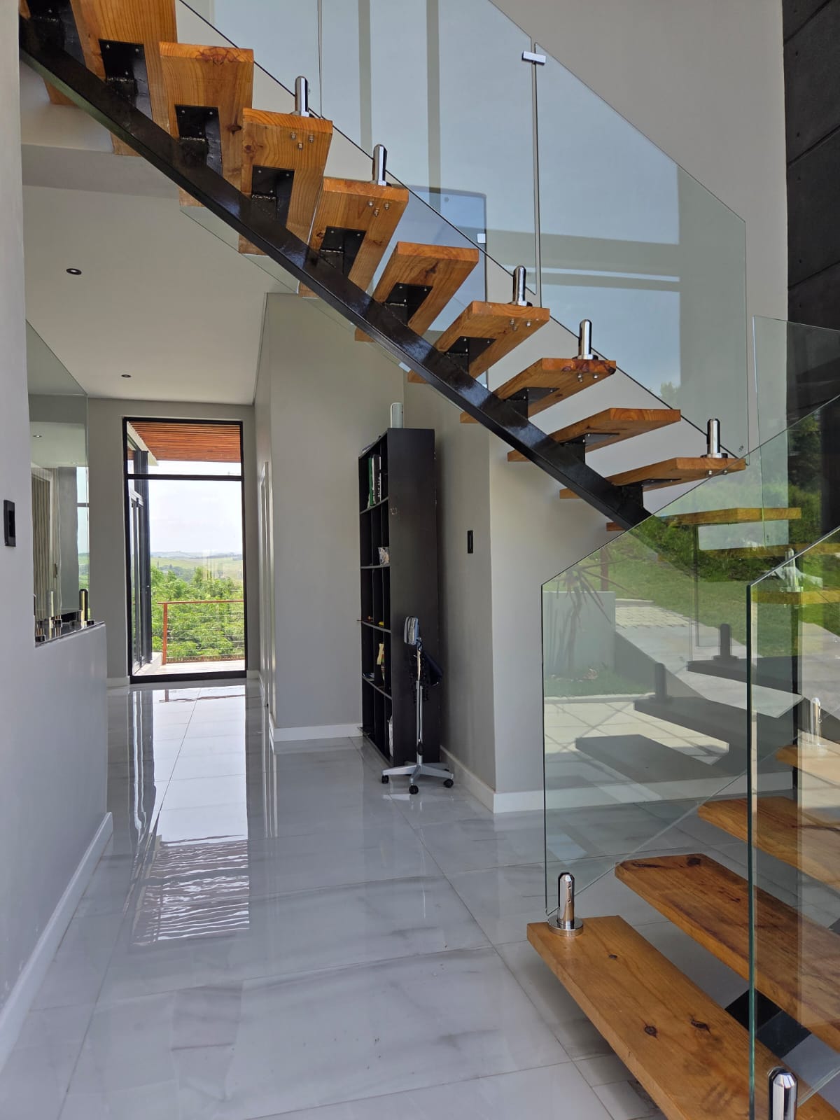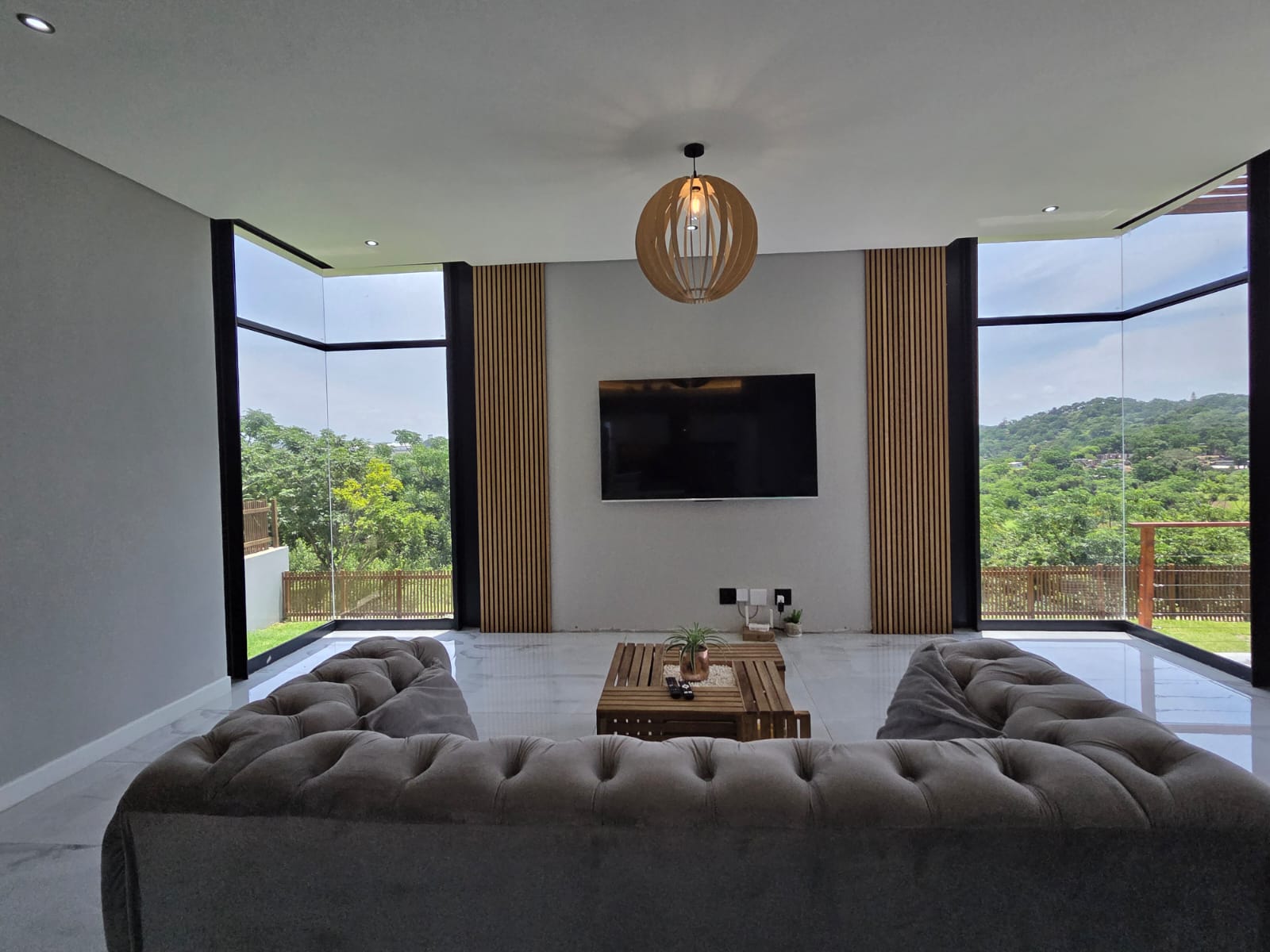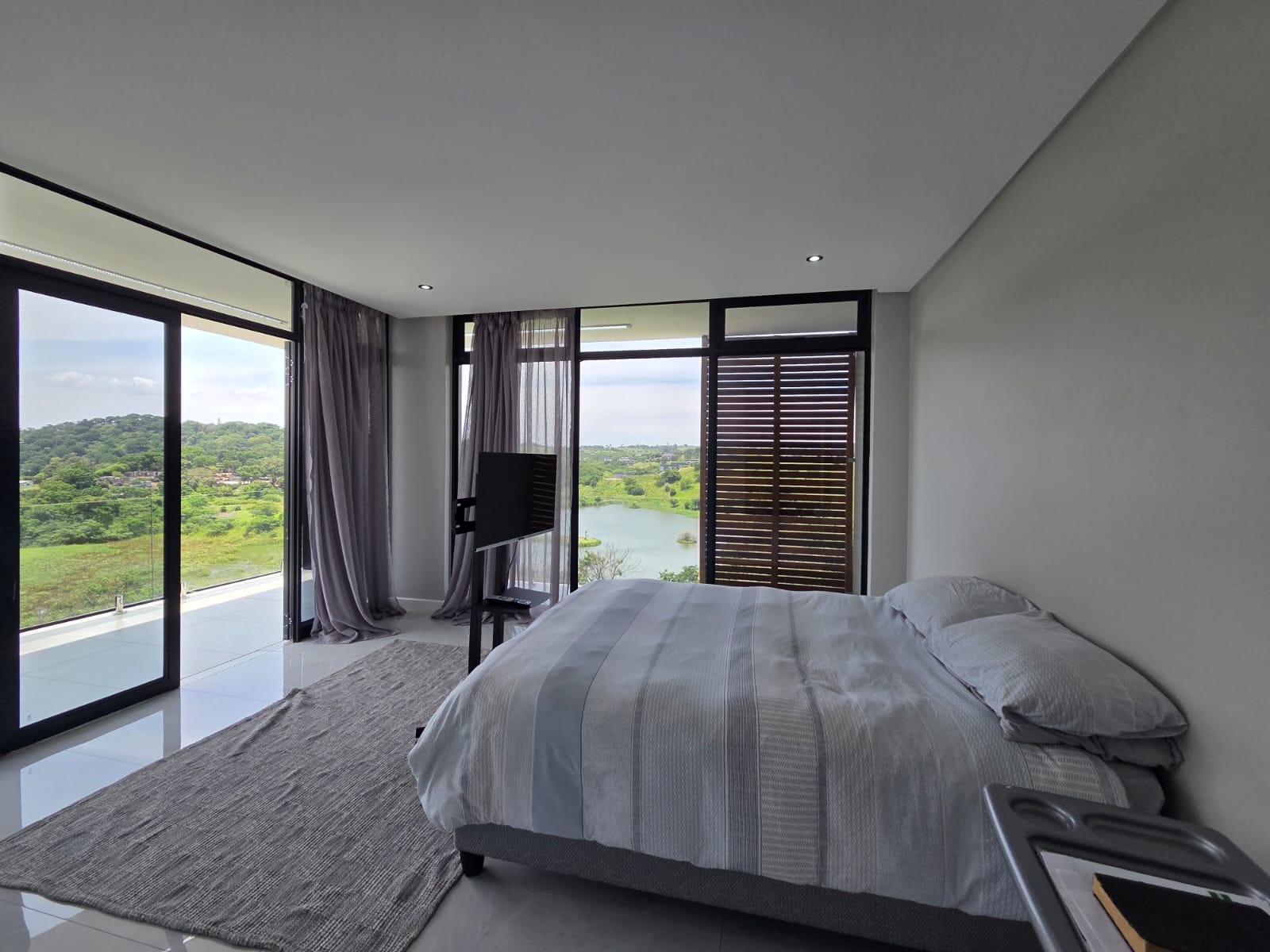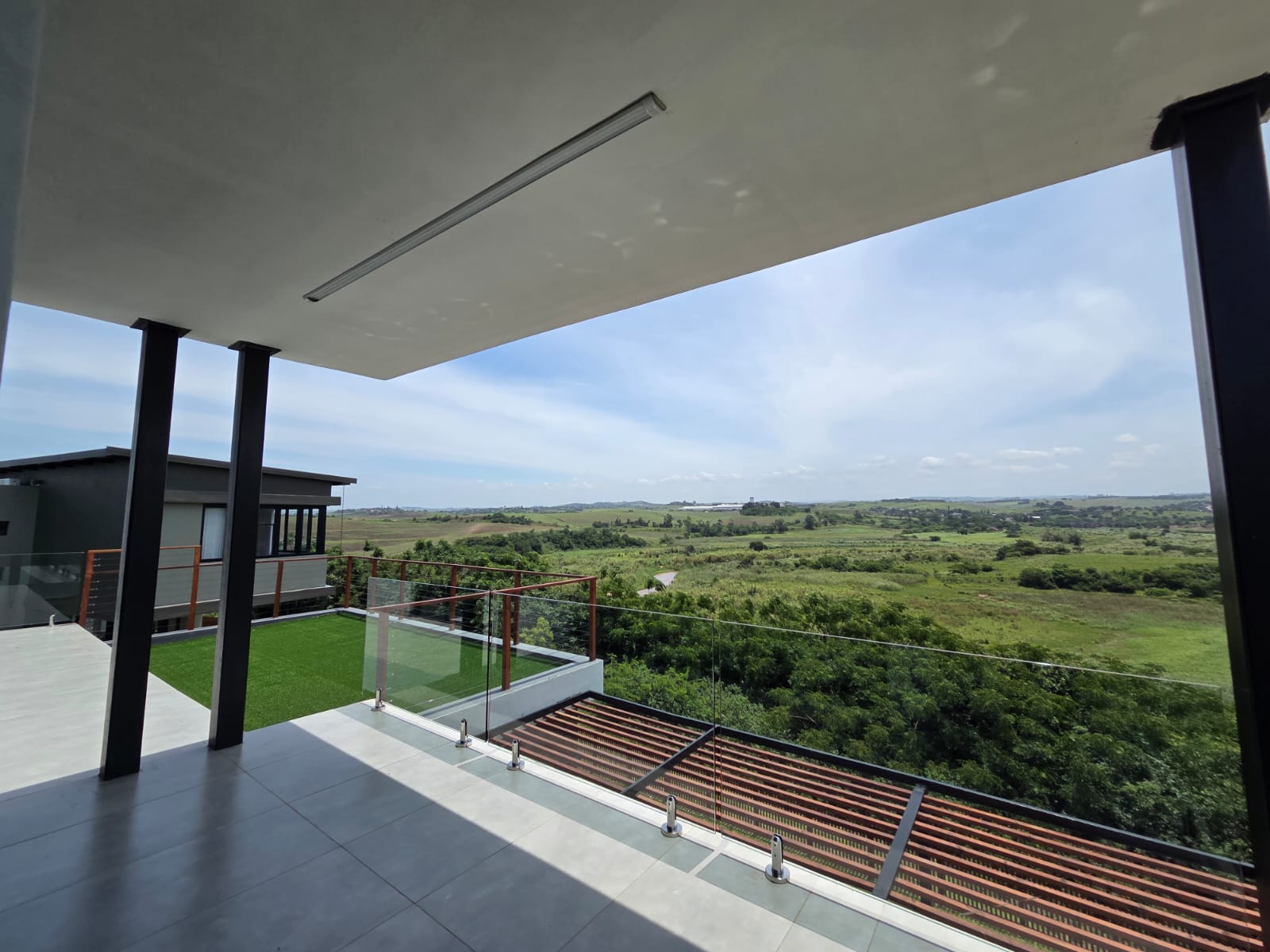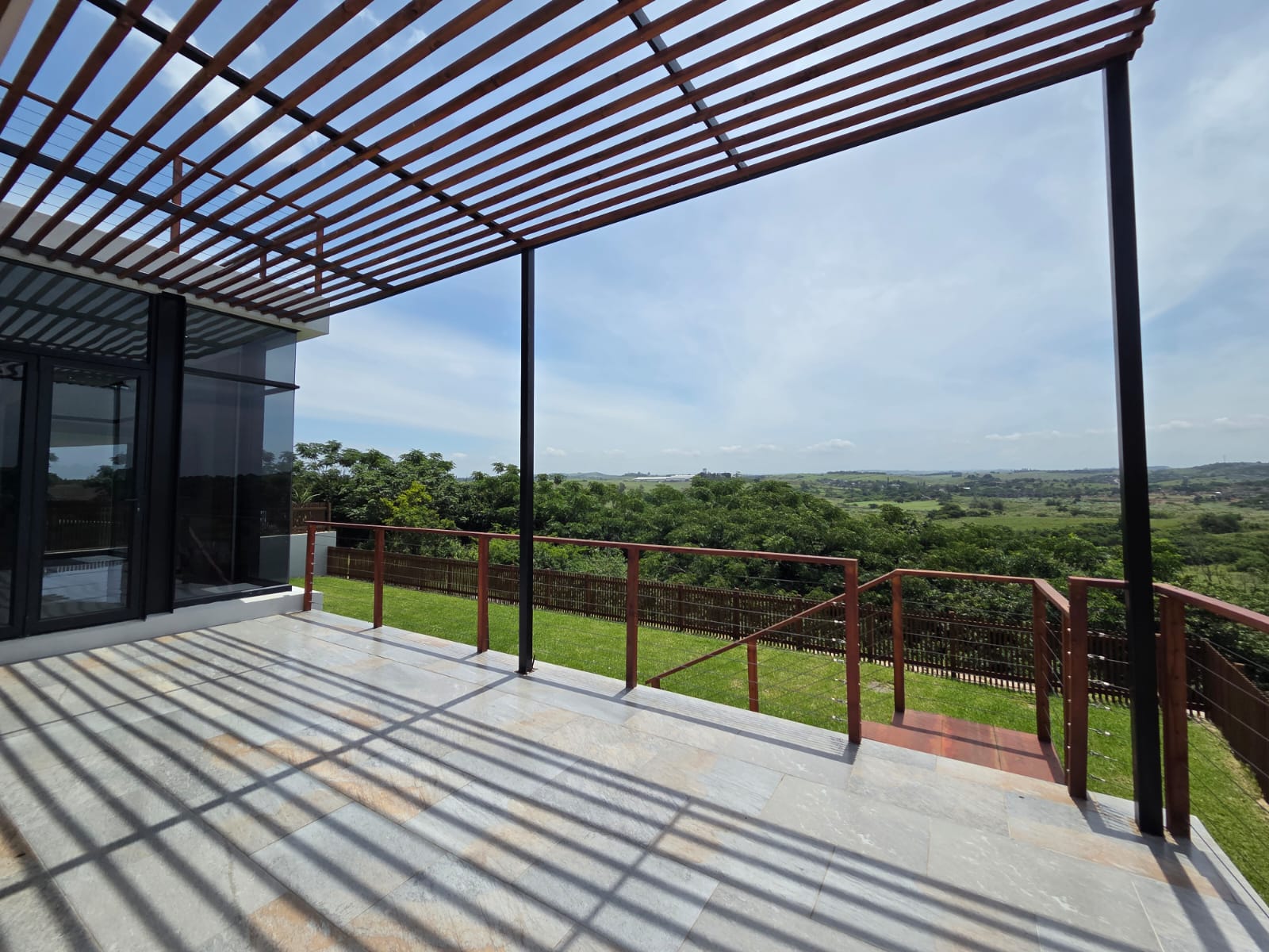 Upstairs, three well-appointed bedrooms offer space and comfort. The main bedroom is particularly generous, with ample cupboard space, a full modern en-suite, and a private balcony—an ideal retreat to unwind and enjoy the fresh air. The two additional bedrooms share a contemporary shower bathroom and a joined balcony overlooking the greenbelt and dam, creating a serene and peaceful outlook. The pet-friendly home also boasts a large garden, providing plenty of room for children and pets to play.
