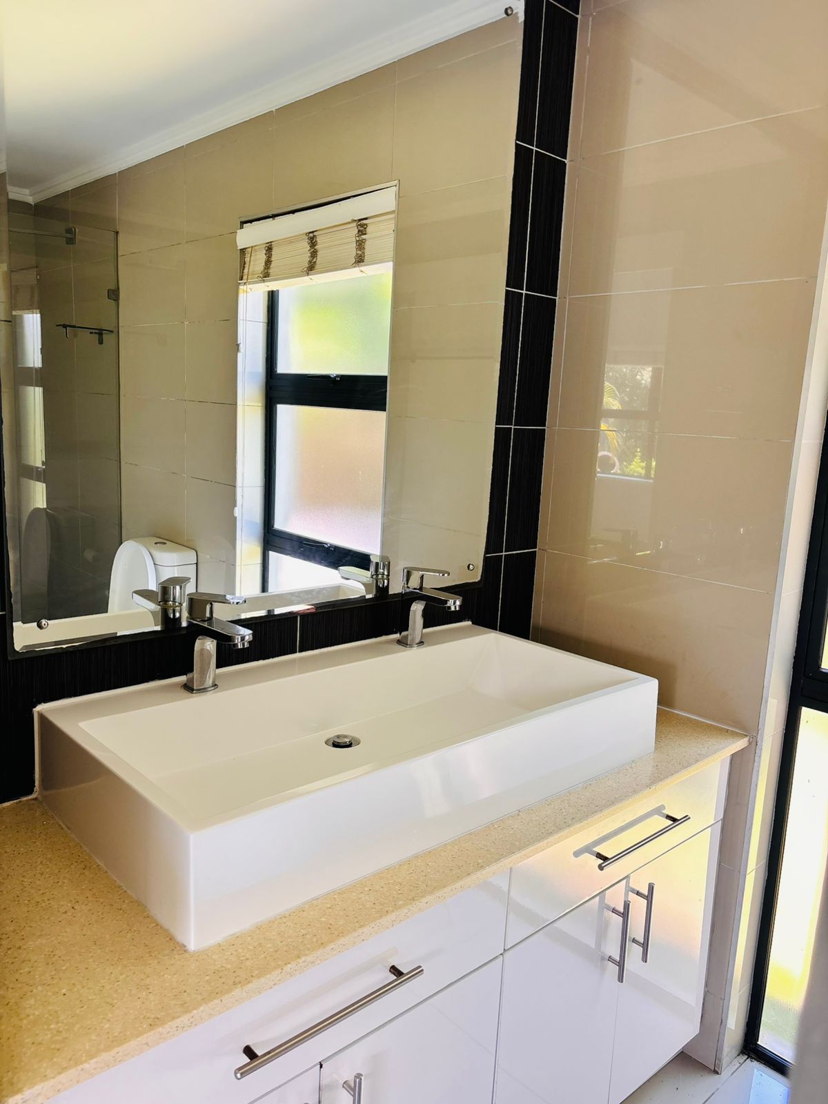 The home offers three generously sized bedrooms. The main bedroom is air-conditioned and includes mirror-finish built-in cupboards and a stylish en-suite bathroom. The remaining two bedrooms share a sleek, modern full bathroom, with one of these bedrooms also air-conditioned. The home also provides direct access to the double automated garage for added convenience.