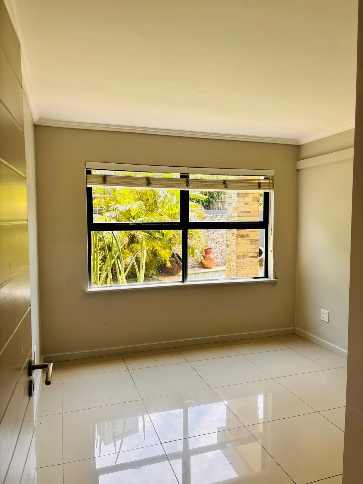The heart of the home is the spacious open-plan living area, where the lounge, dining space, and contemporary kitchen flow effortlessly together. Designed for practical family living, the kitchen features ample counter space, a glass-top hob, double eye-level oven, dedicated fridge space, a separate scullery, and a private dry yard. The air-conditioned living area opens through large sliding doors to the covered entertainment patio, creating a seamless indoor–outdoor connection and an airy, light-filled atmosphere. This space overlooks a private, level garden and sparkling swimming pool—perfect for relaxed family living and entertaining.