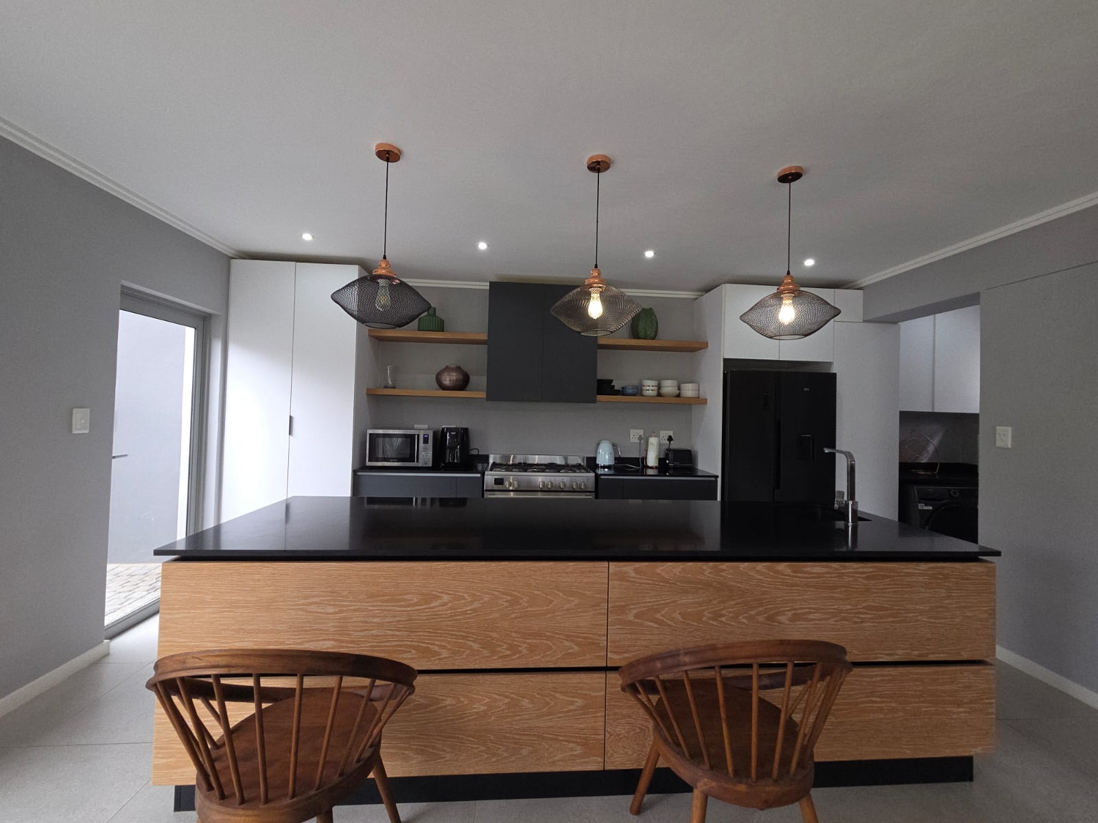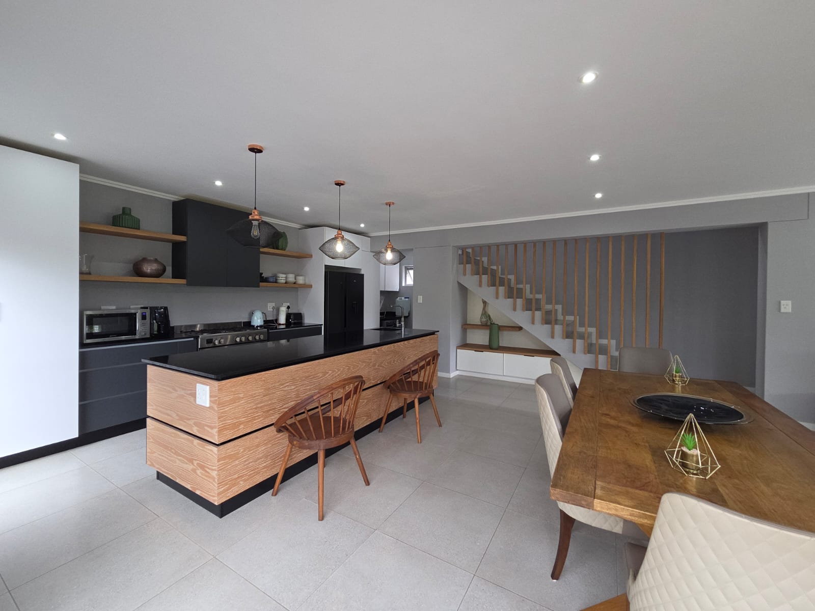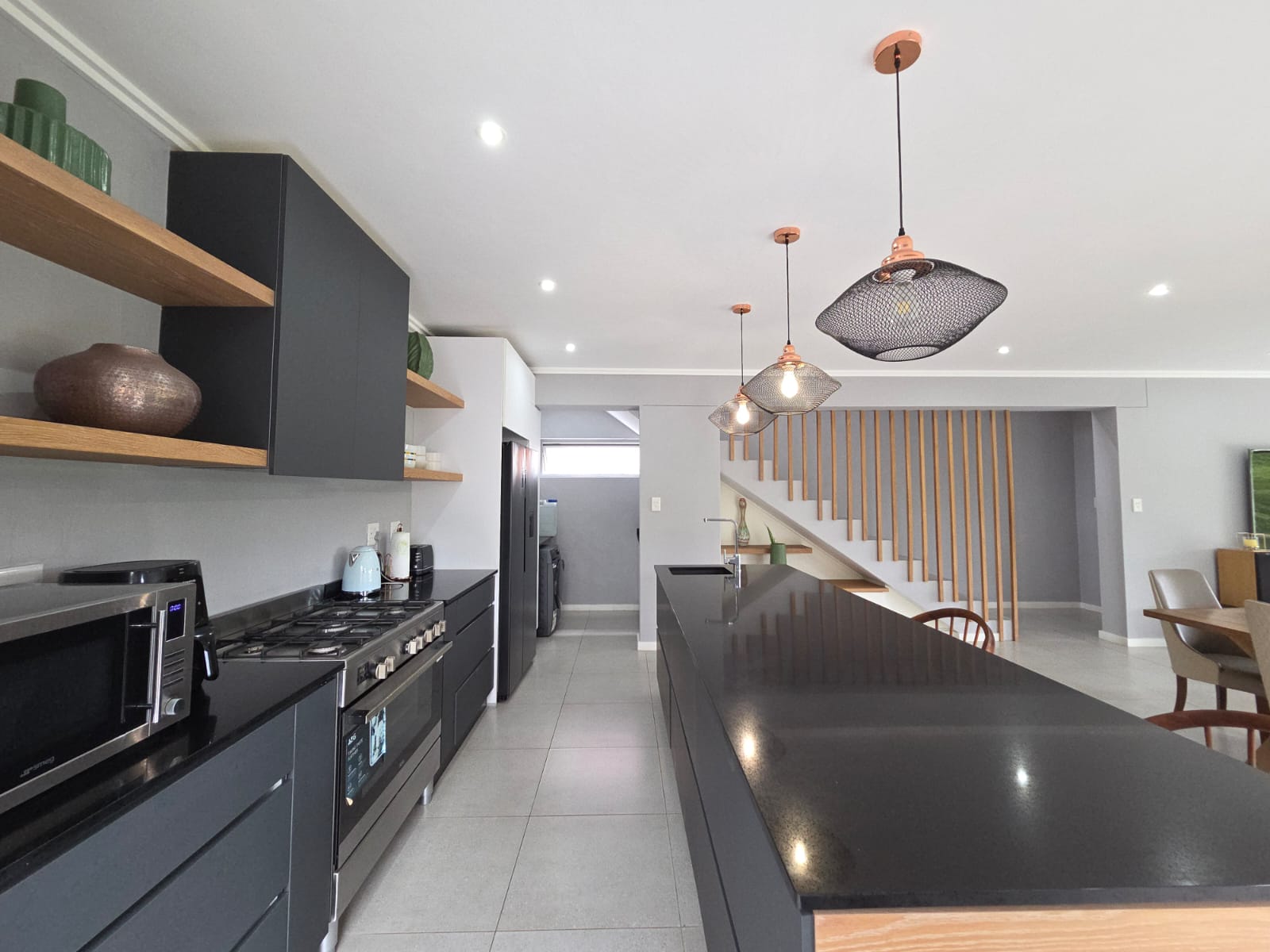 Downstairs, the home welcomes you with an elegant open-plan layout that seamlessly blends style and functionality. The gourmet kitchen is a standout feature, complete with black Caesarstone countertops, oak finishes, and a separate scullery. It flows effortlessly into the dining and living areas, creating an inviting space for relaxed family living and entertaining. Large sliding doors open onto a covered patio and a lush garden, perfect for hosting family and friends or simply enjoying the tranquil outdoor setting. A conveniently located guest bathroom completes this level.