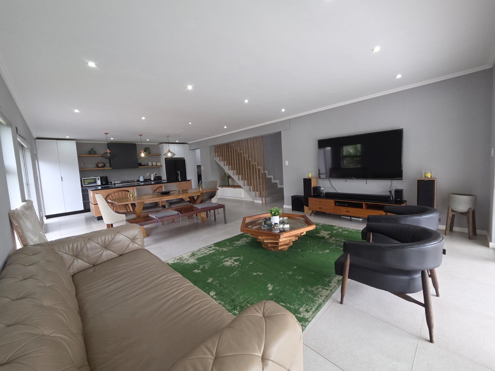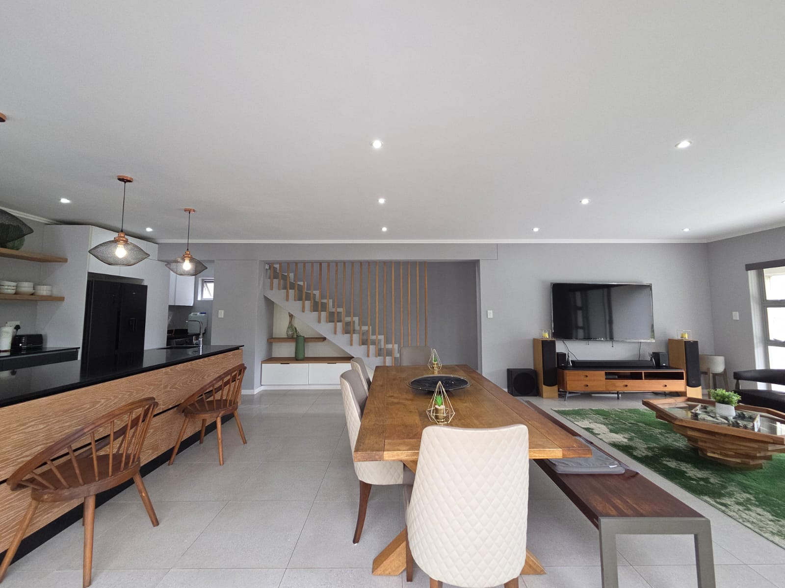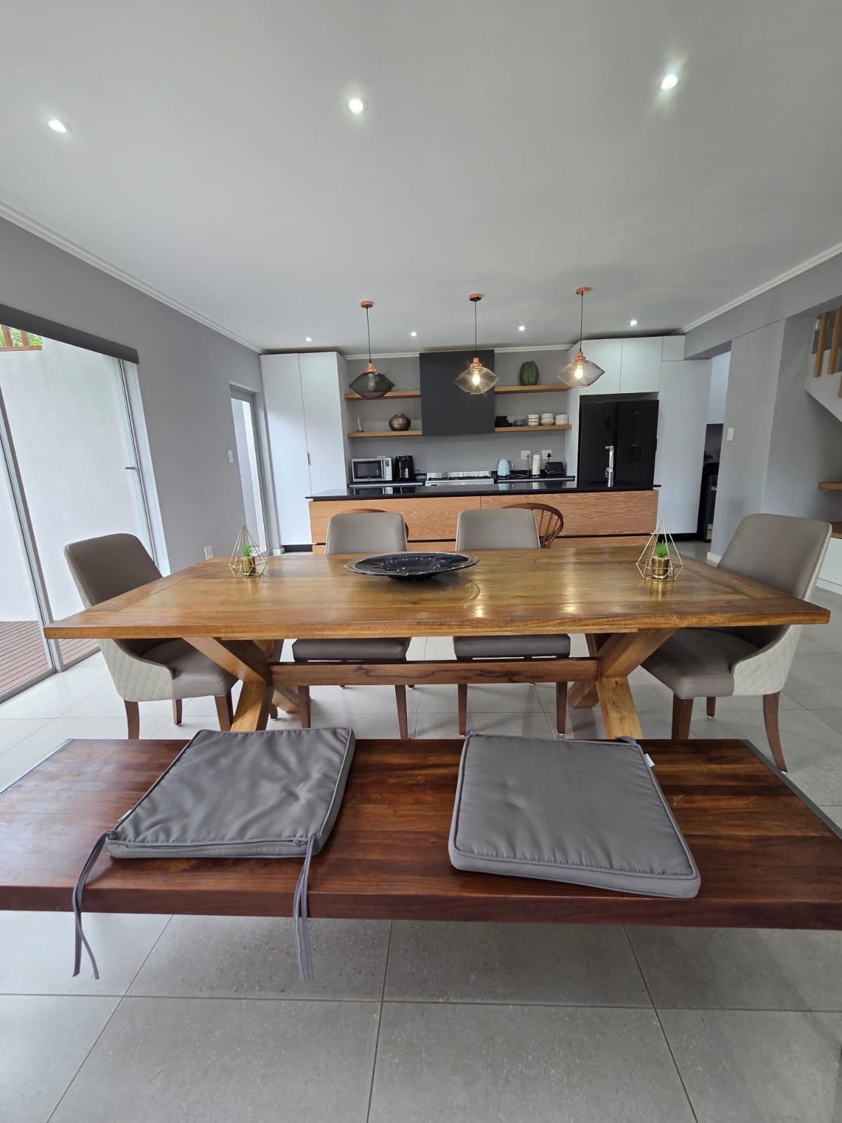 Downstairs, the home welcomes you with an elegant open-plan layout that seamlessly blends style and functionality. The gourmet kitchen is a standout feature, complete with black Caesarstone countertops, oak finishes, and a separate scullery. It flows effortlessly into the dining and living areas, creating an inviting space for relaxed family living and entertaining. Large sliding doors open onto a covered patio and a lush garden, perfect for hosting family and friends or simply enjoying the tranquil outdoor setting. A conveniently located guest bathroom completes this level.