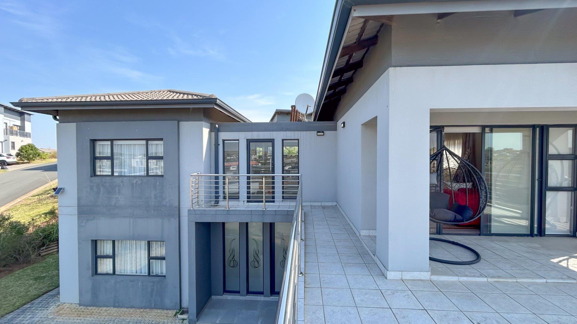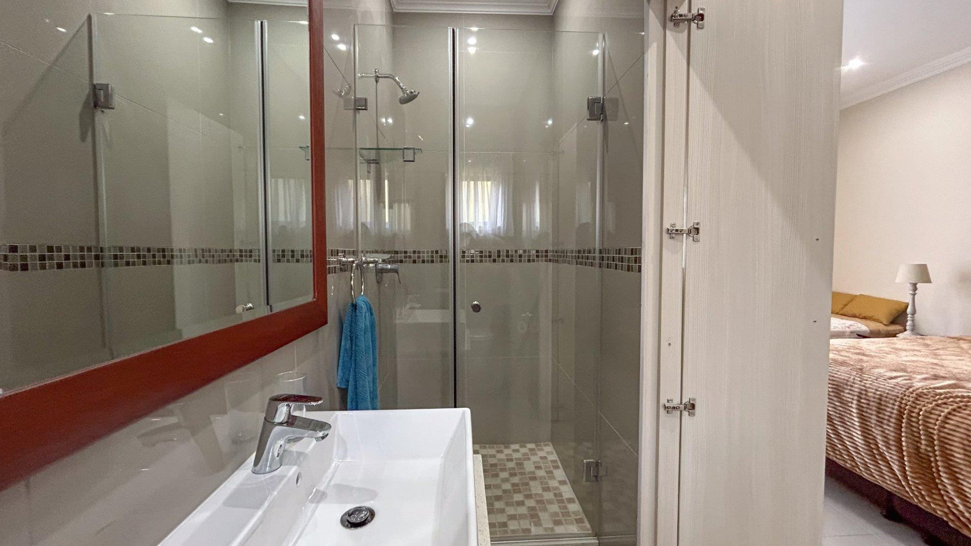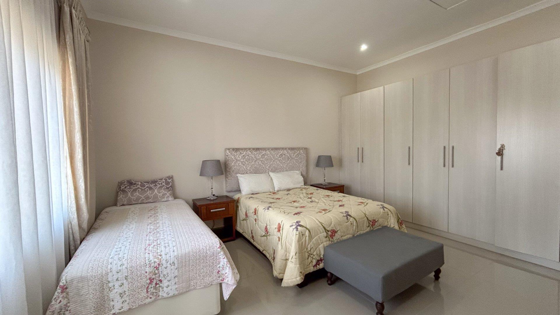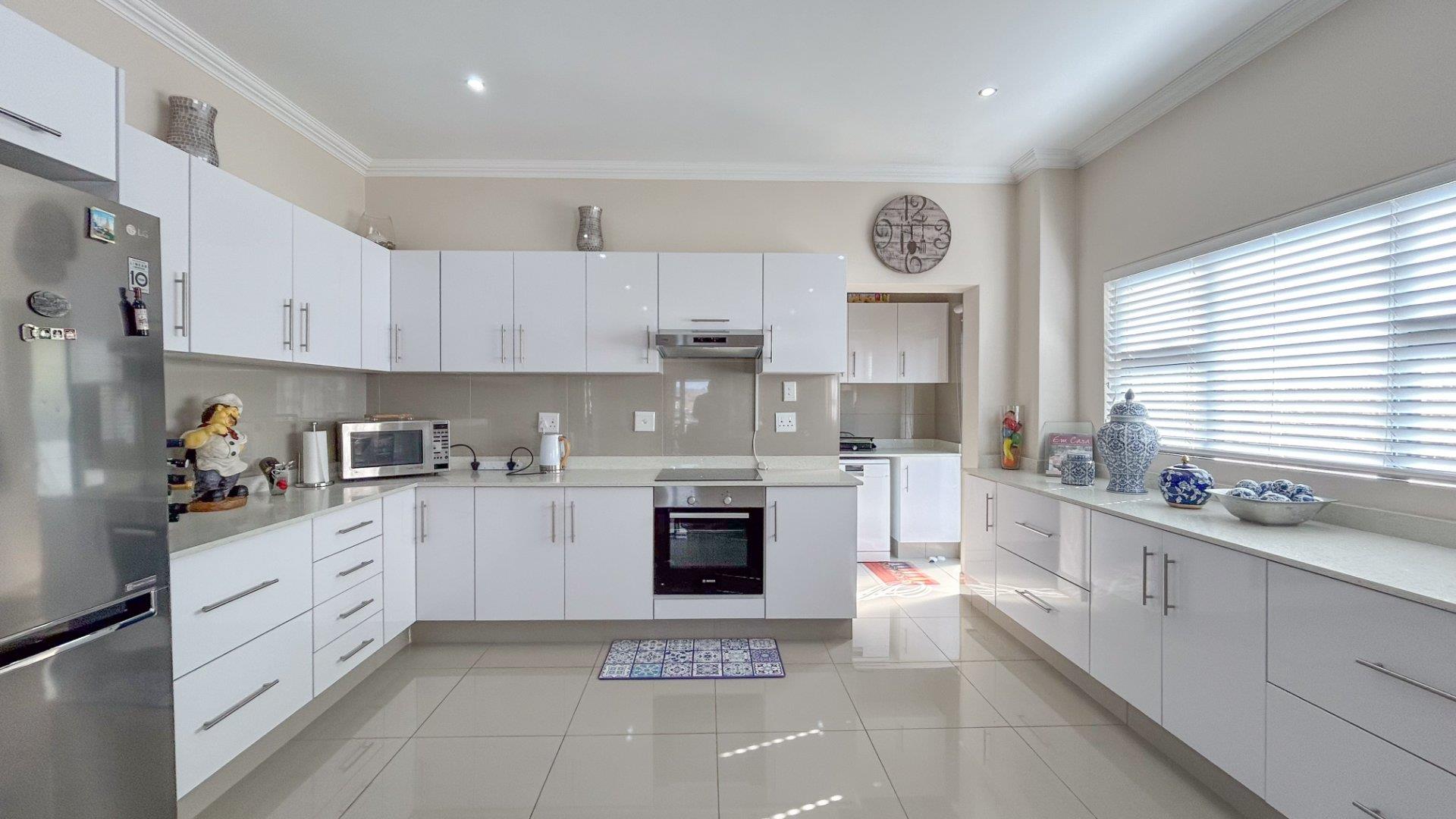 The open-plan living space on the upper floor is ideal for both relaxing and entertaining. The lounge, dining, and kitchen areas are generously sized, providing ample room for a double-door fridge and showcasing sleek quartz countertops and abundant cabinetry. A scullery off the kitchen offers extra storage and easy access to the courtyard. The spacious lounge extends seamlessly to a large, partially covered patio, perfect for enjoying the elevated views of the estate.