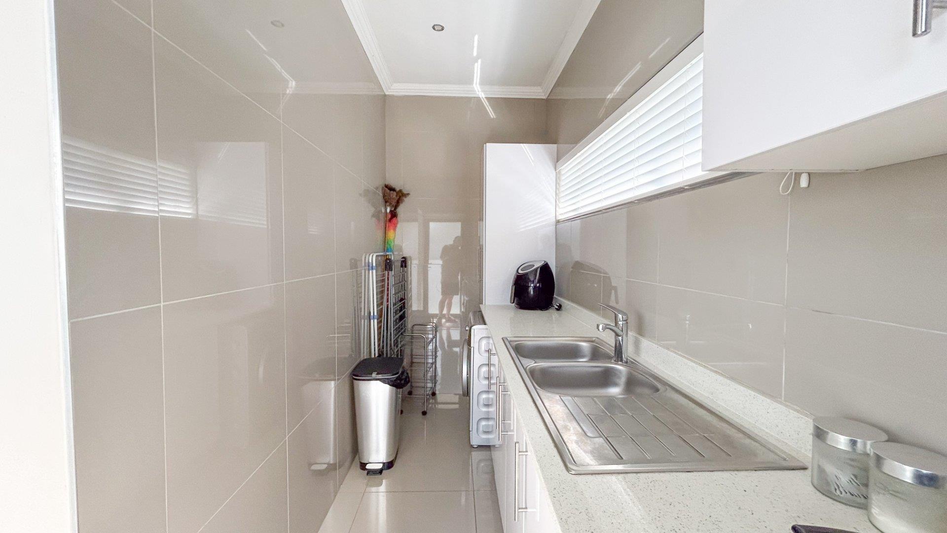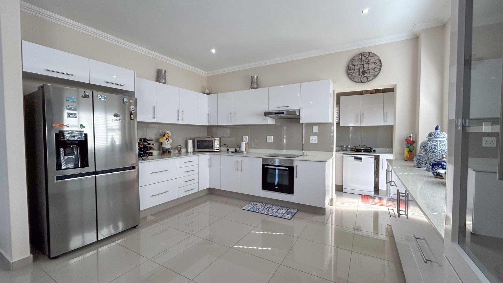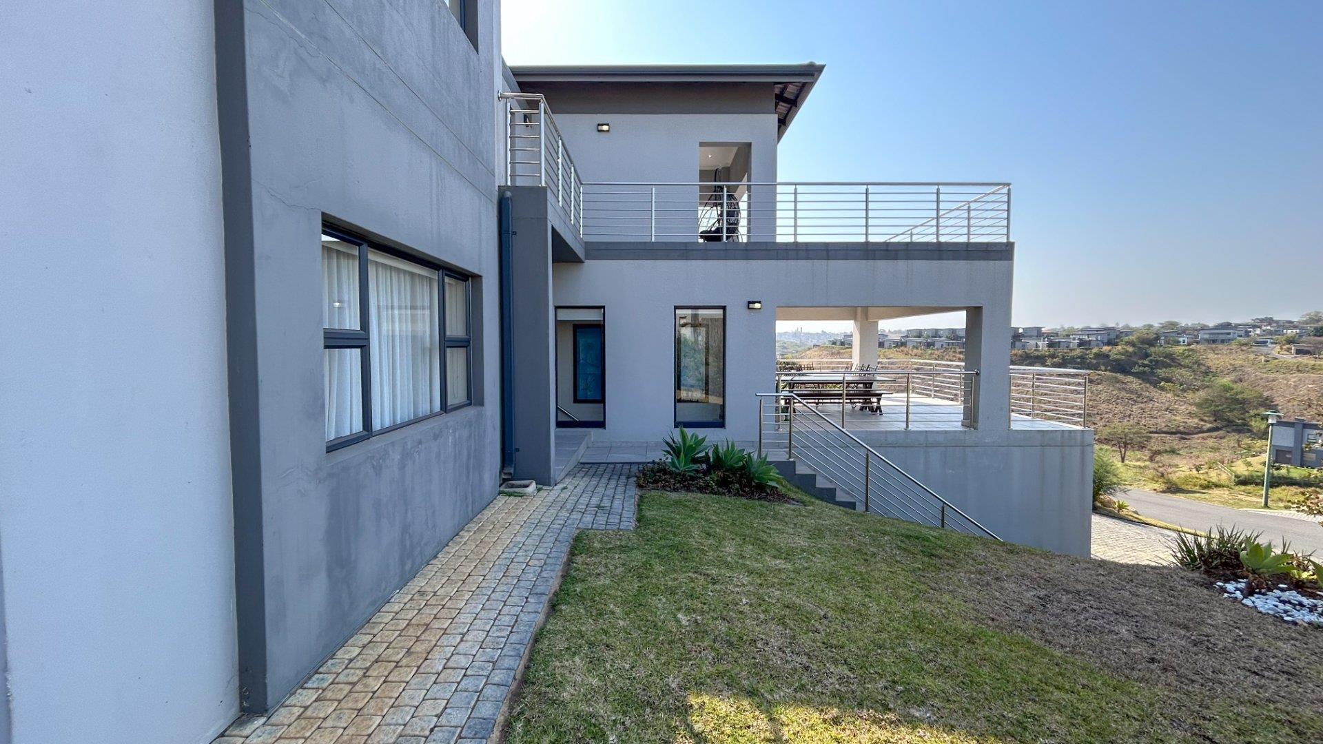The open-plan living space on the upper floor is ideal for both relaxing and entertaining. The lounge, dining, and kitchen areas are generously sized, providing ample room for a double-door fridge and showcasing sleek quartz countertops and abundant cabinetry. A scullery off the kitchen offers extra storage and easy access to the courtyard. The spacious lounge extends seamlessly to a large, partially covered patio, perfect for enjoying the elevated views of the estate.