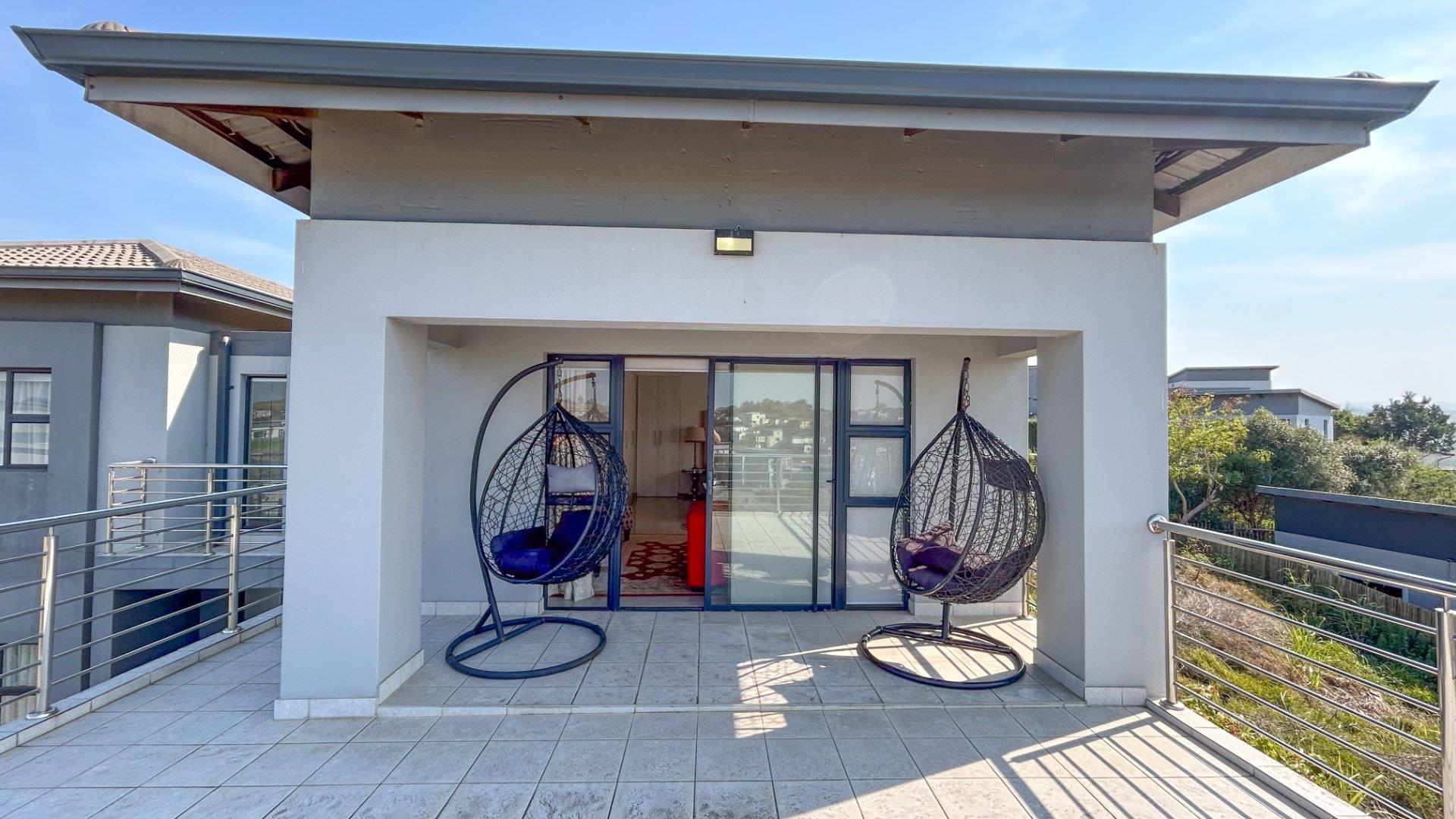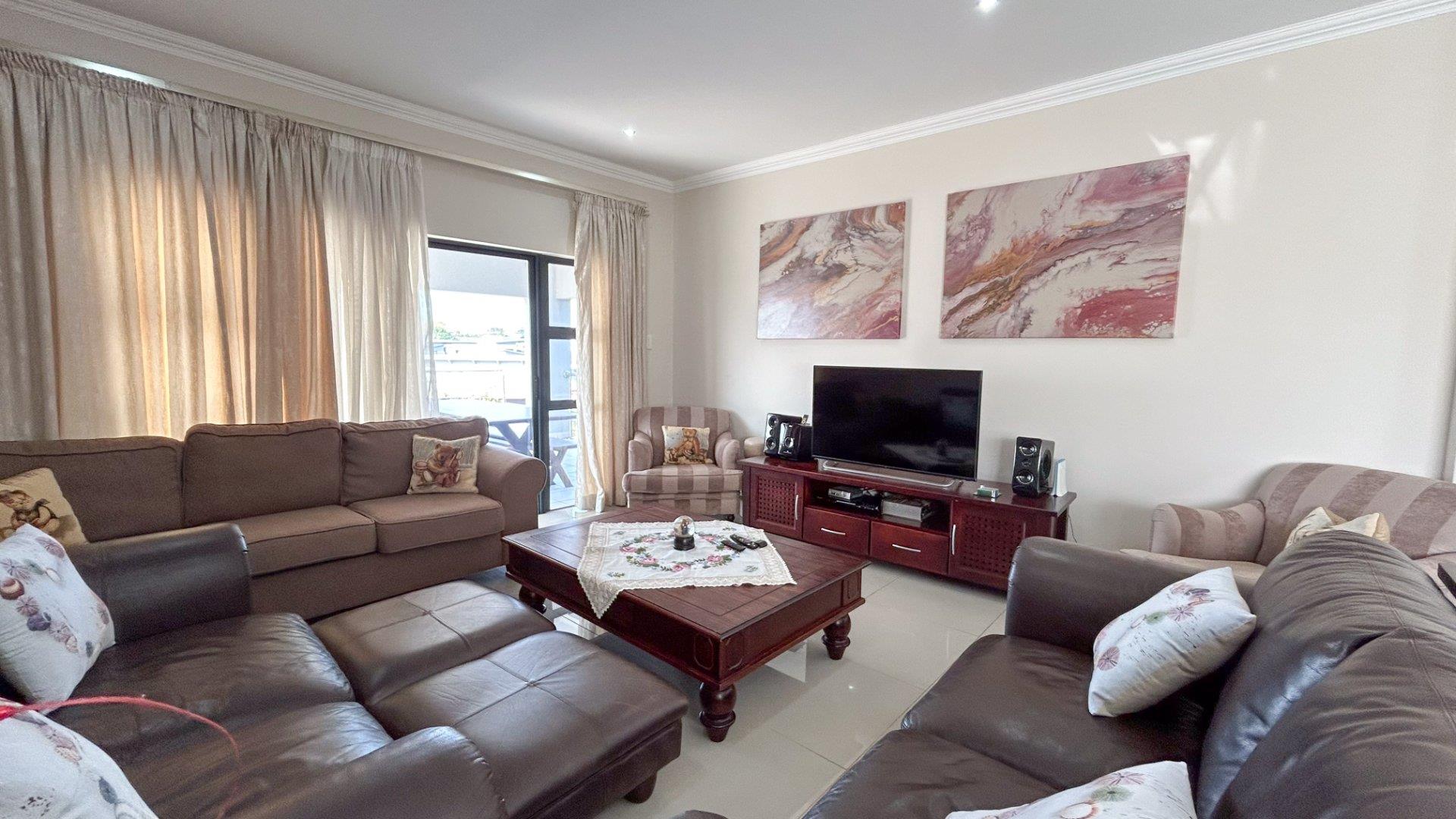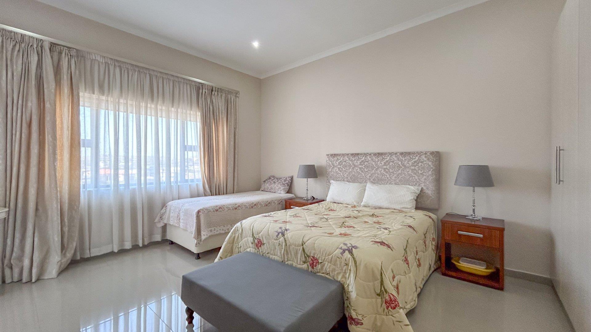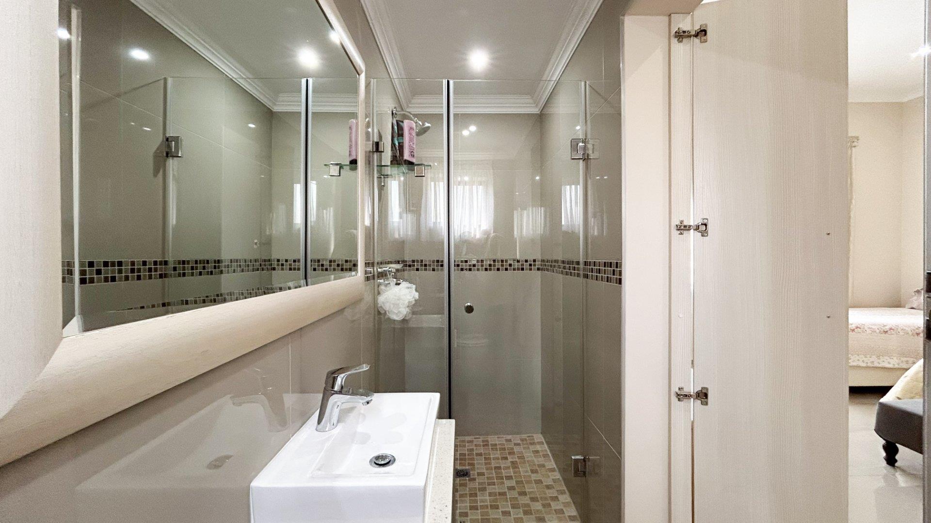The open-plan living space on the upper floor is ideal for both relaxing and entertaining. The lounge, dining, and kitchen areas are generously sized, providing ample room for a double-door fridge and showcasing sleek quartz countertops and abundant cabinetry. A scullery off the kitchen offers extra storage and easy access to the courtyard. The spacious lounge extends seamlessly to a large, partially covered patio, perfect for enjoying the elevated views of the estate.
