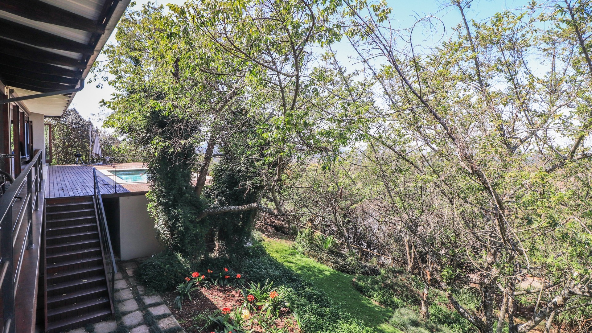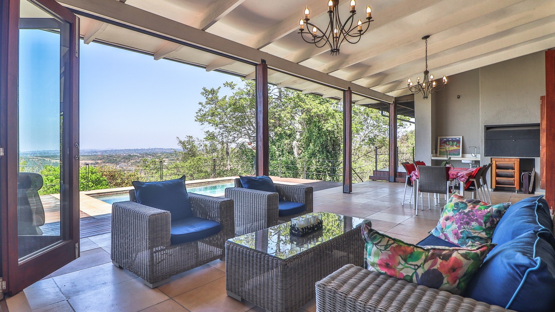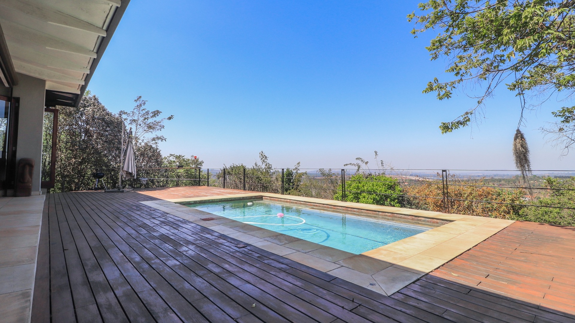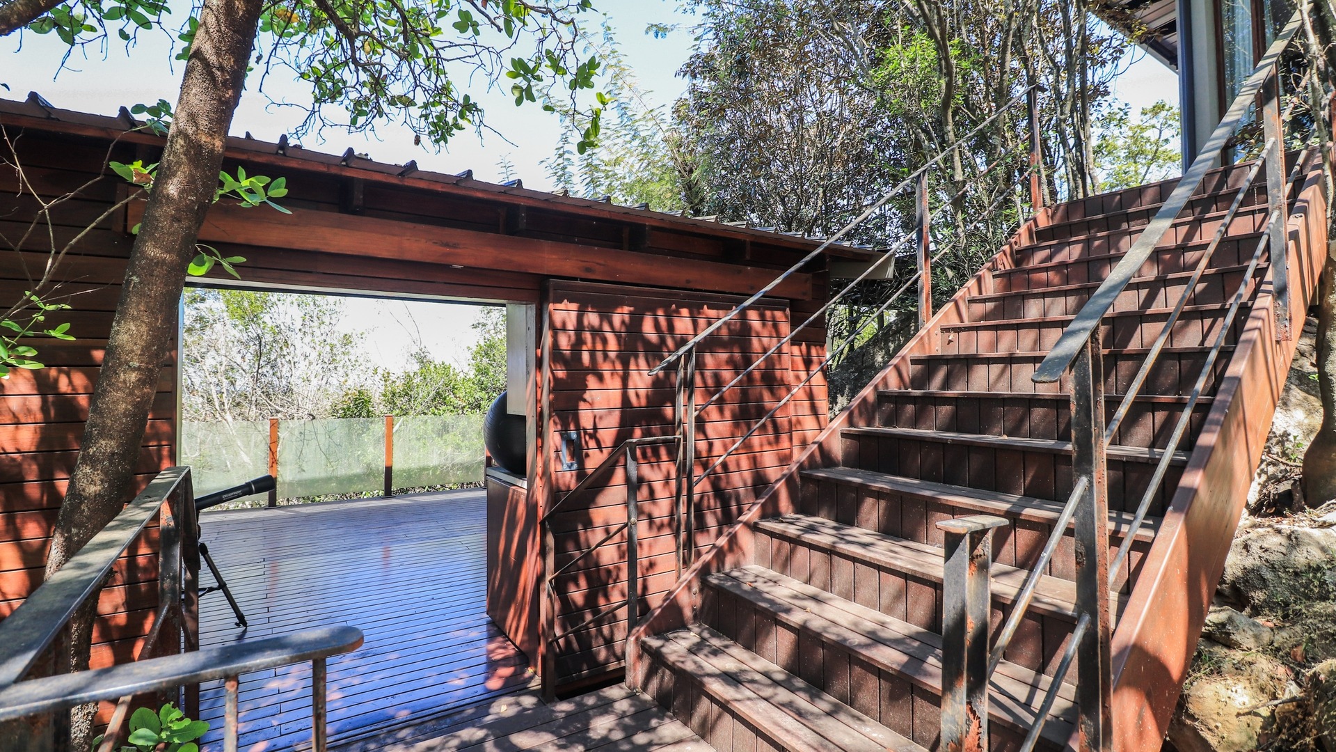 Reiner Forsche design, with vaulted mono pitch ceilings and natural stone features throughout, it stretches itself within the natural shrubbery which abounds. On 1 hectare of land, much of the space is indigenous bush, bird life is abundant, and the birds find this to be their favourite spot. The open plan living areas blends itself into the deck with pool and wrap around verandas which compliment the access to views from every room. The sliding folding doors open fully to optimise the outdoor living which is so prevalent in the lowveld. There is also a viewing deck which is nestled within the natural woodland, perfect for bird watching, an outdoor gym or additional exterior entertainment area.