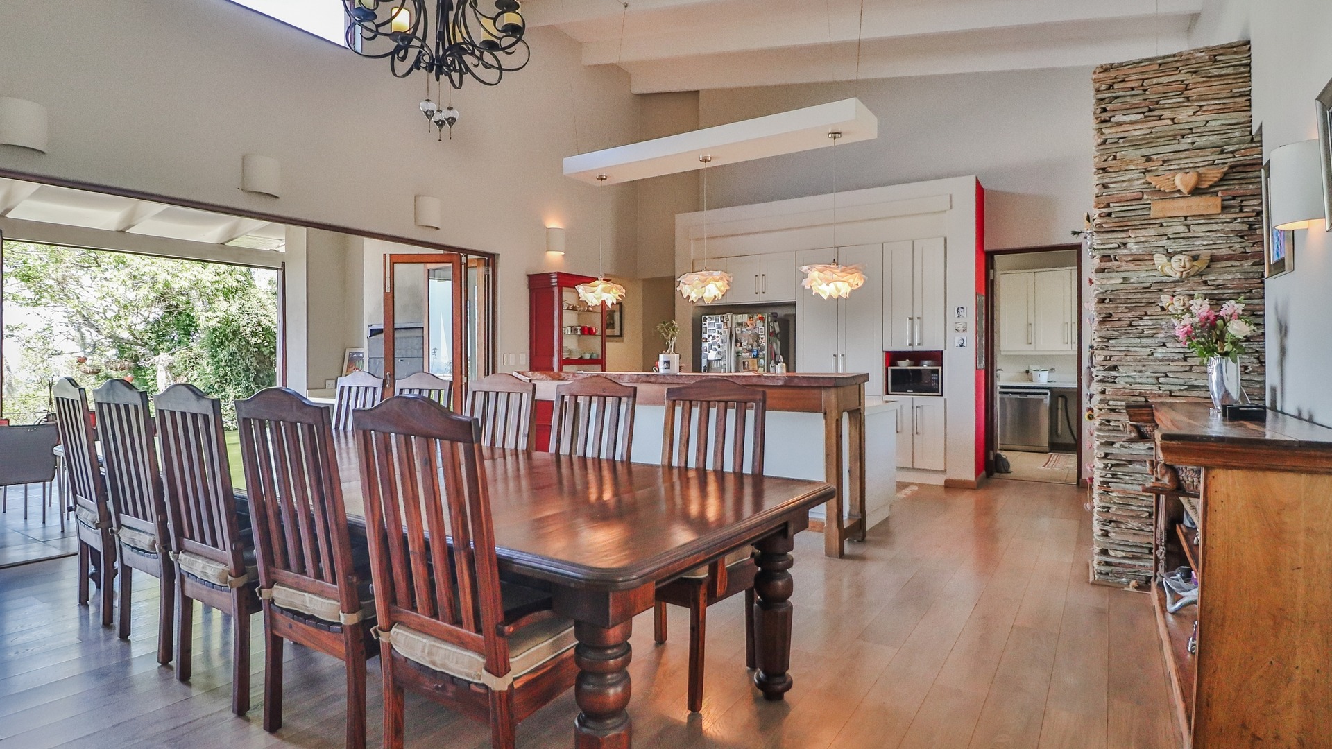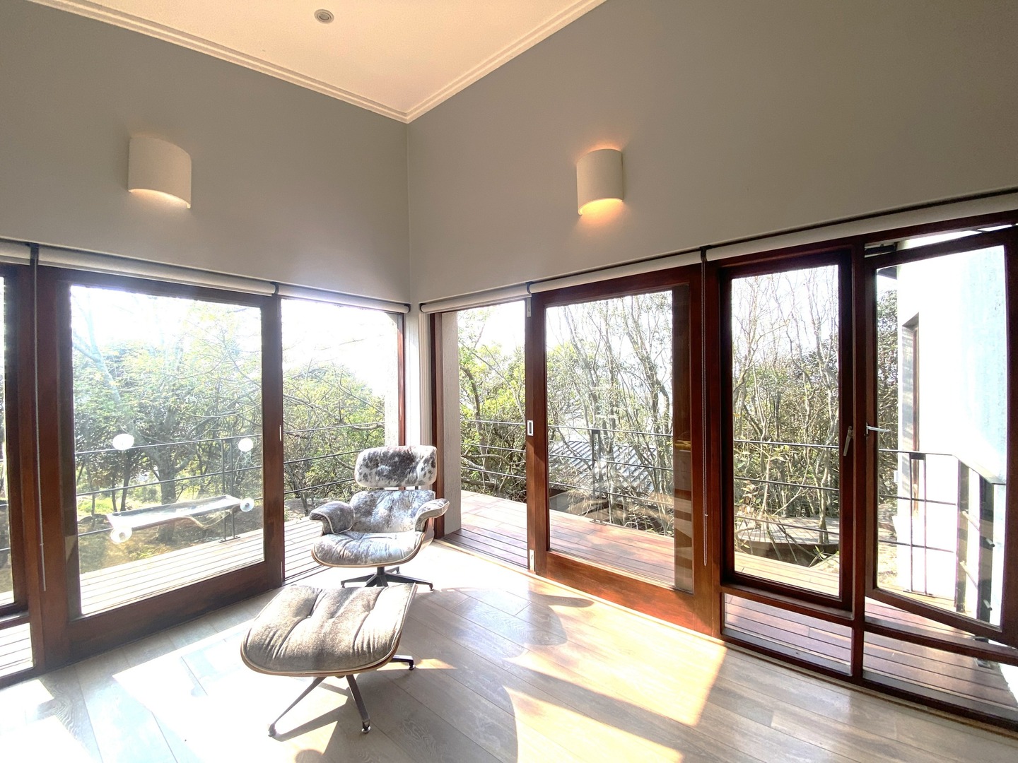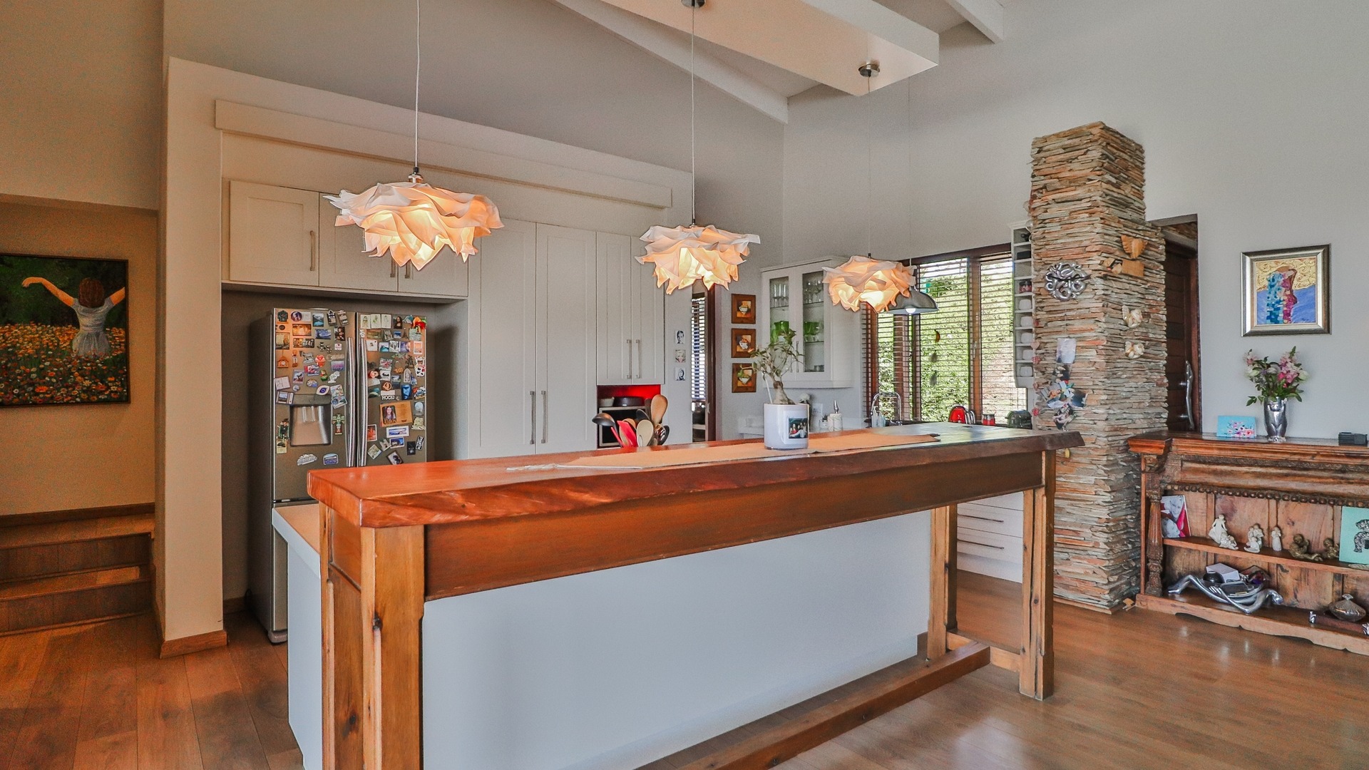 Reiner Forsche design, with vaulted mono pitch ceilings and natural stone features throughout, it stretches itself within the natural shrubbery which abounds. On 1 hectare of land, much of the space is indigenous bush, bird life is abundant, and the birds find this to be their favourite spot. The open plan living areas blends itself into the deck with pool and wrap around verandas which compliment the access to views from every room. The sliding folding doors open fully to optimise the outdoor living which is so prevalent in the lowveld. There is also a viewing deck which is nestled within the natural woodland, perfect for bird watching, an outdoor gym or additional exterior entertainment area.