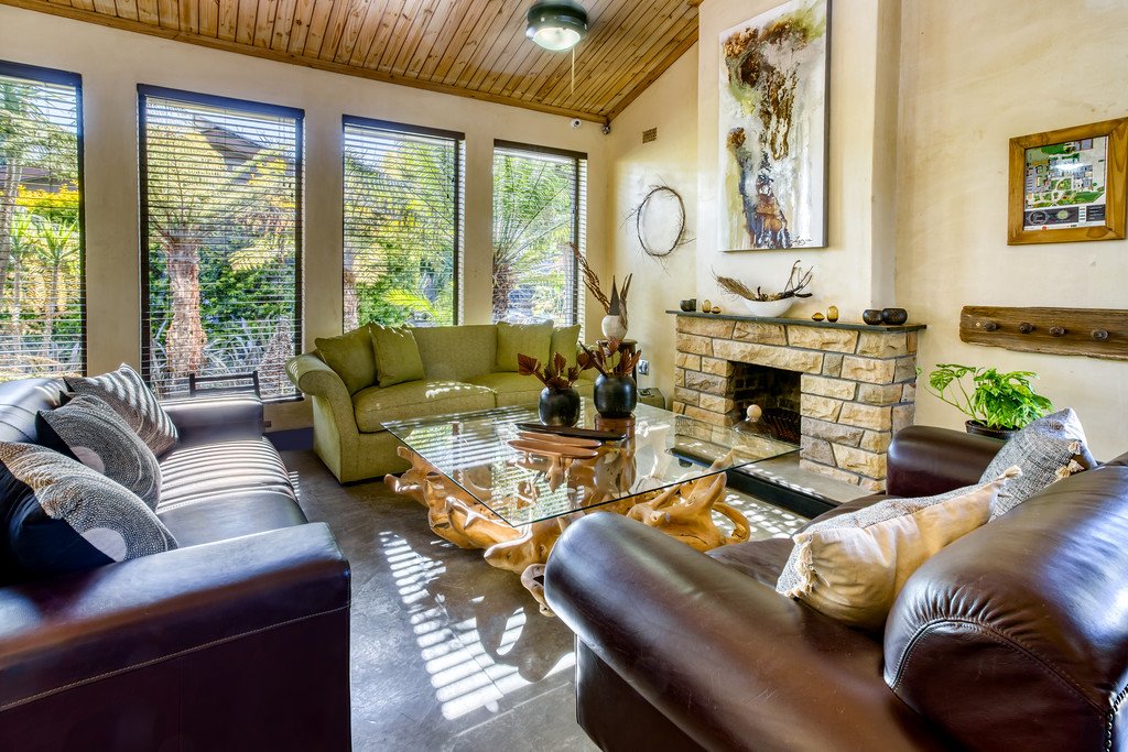 Upon entering, you are greeted by a stunning landscape of lush greenery and graceful palm trees, setting the scene for relaxation. The guest house features two inviting indoor lounges—the Green Lounge and the Blue Lounge—each equipped with comfortable seating and cozy fireplaces, perfect for unwinding on chilly evenings. Natural light fills these spaces, creating a warm and welcoming environment, even during winter.