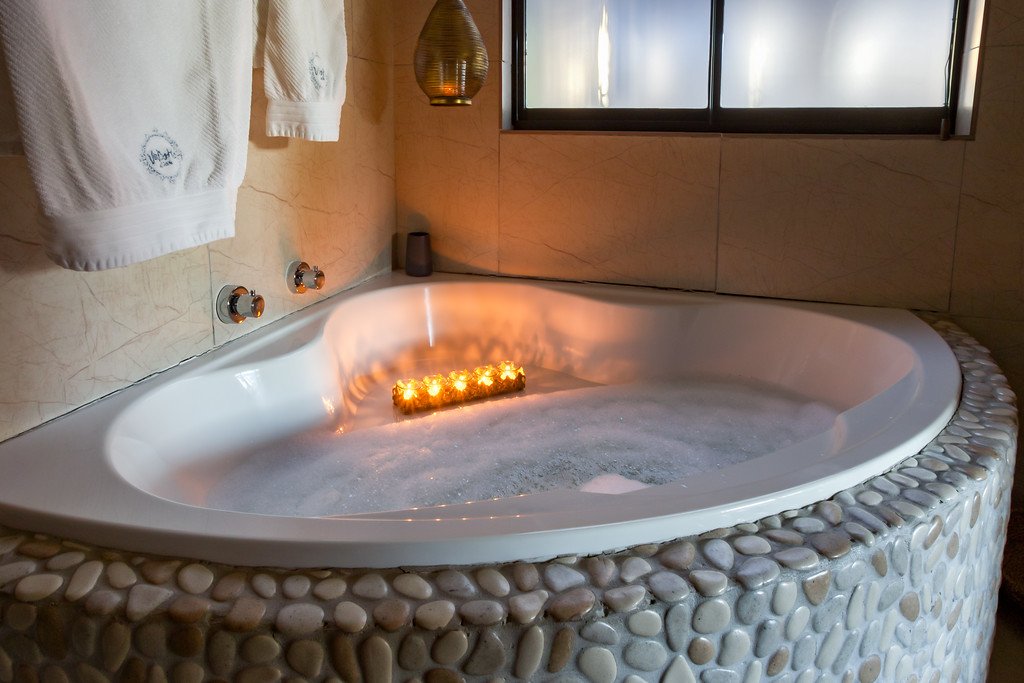Outside, you’ll find two studio apartments, each featuring a small kitchen, TV lounge, queen-size bed, and en-suite bathroom. One of the studios stands out with its own braai facilities, private garden, separate entrance, and a luxurious jacuzzi next to the fireplace—ideal for a romantic getaway or a peaceful retreat.