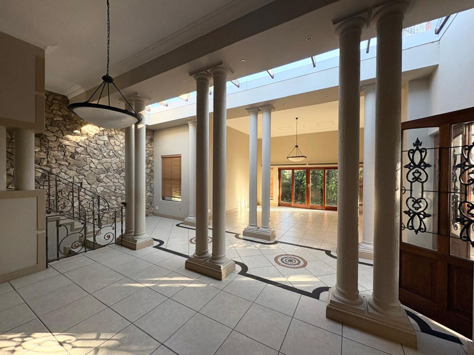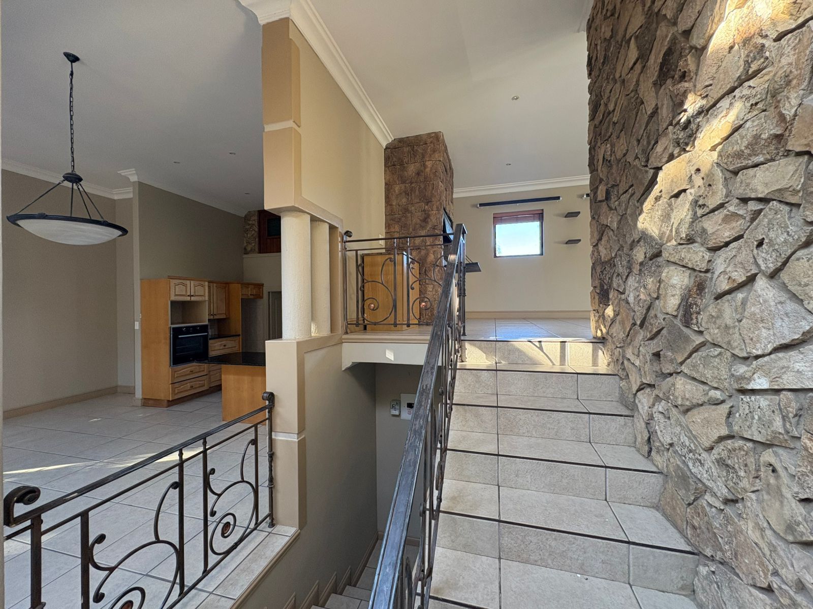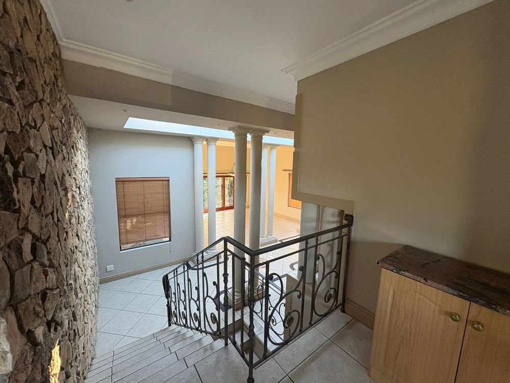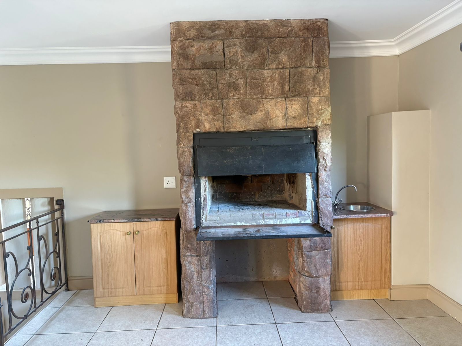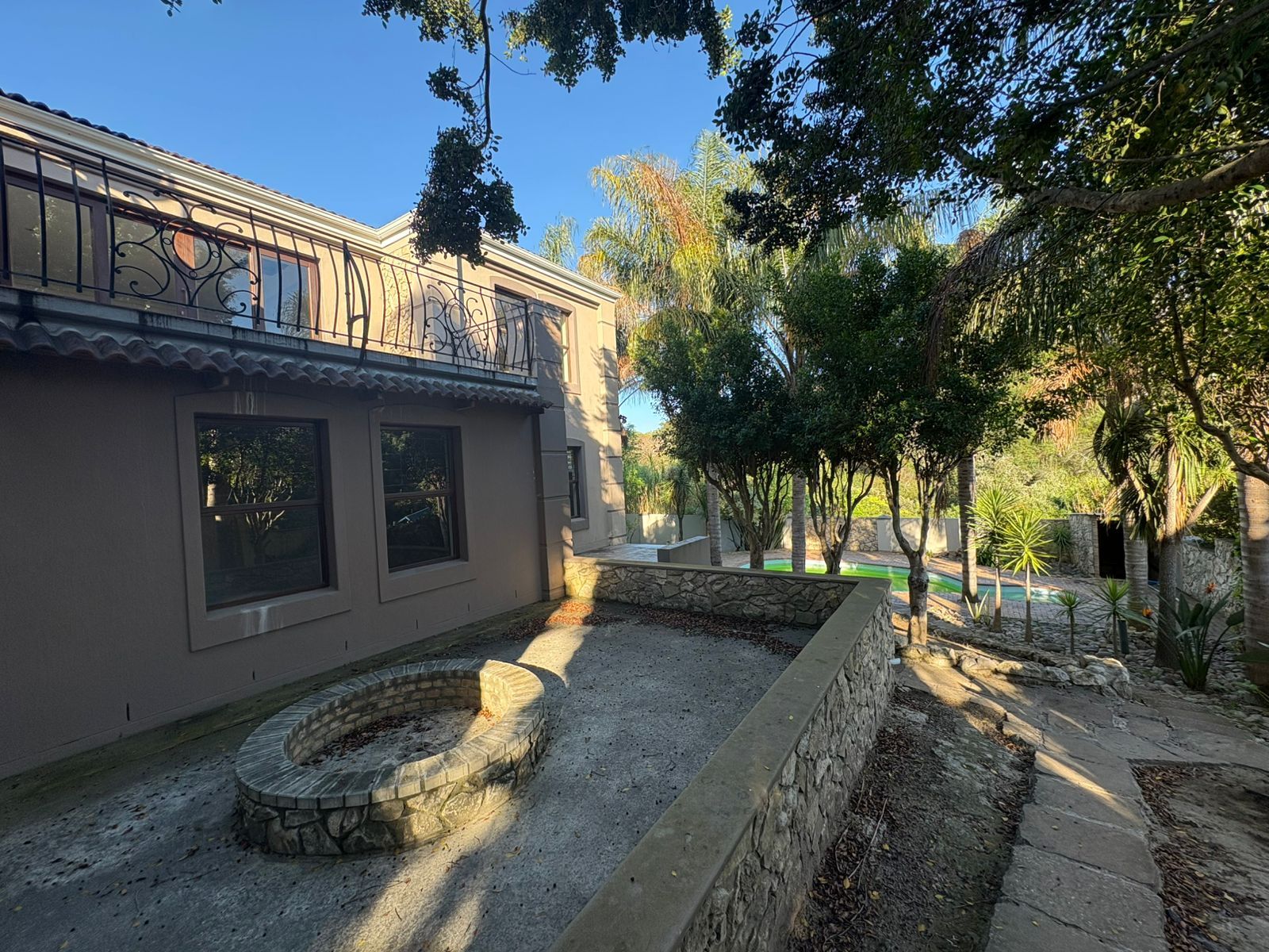 Indoor braai room with large balcony and an outdoor fire pit below which overlooks your swimming pool. Tall palm trees grace the boundary and entrance where a water feature flows. The custom stonework and ironwork adds to the beautiful villa aesthetics.