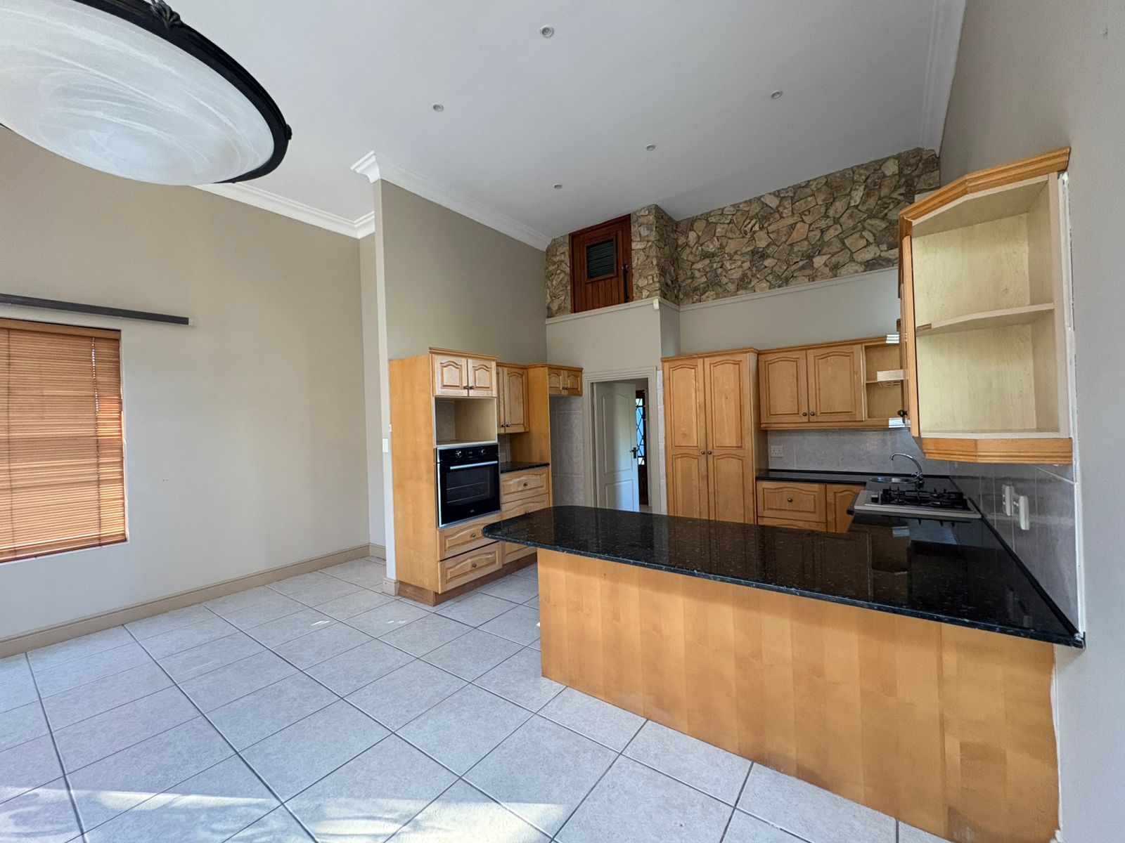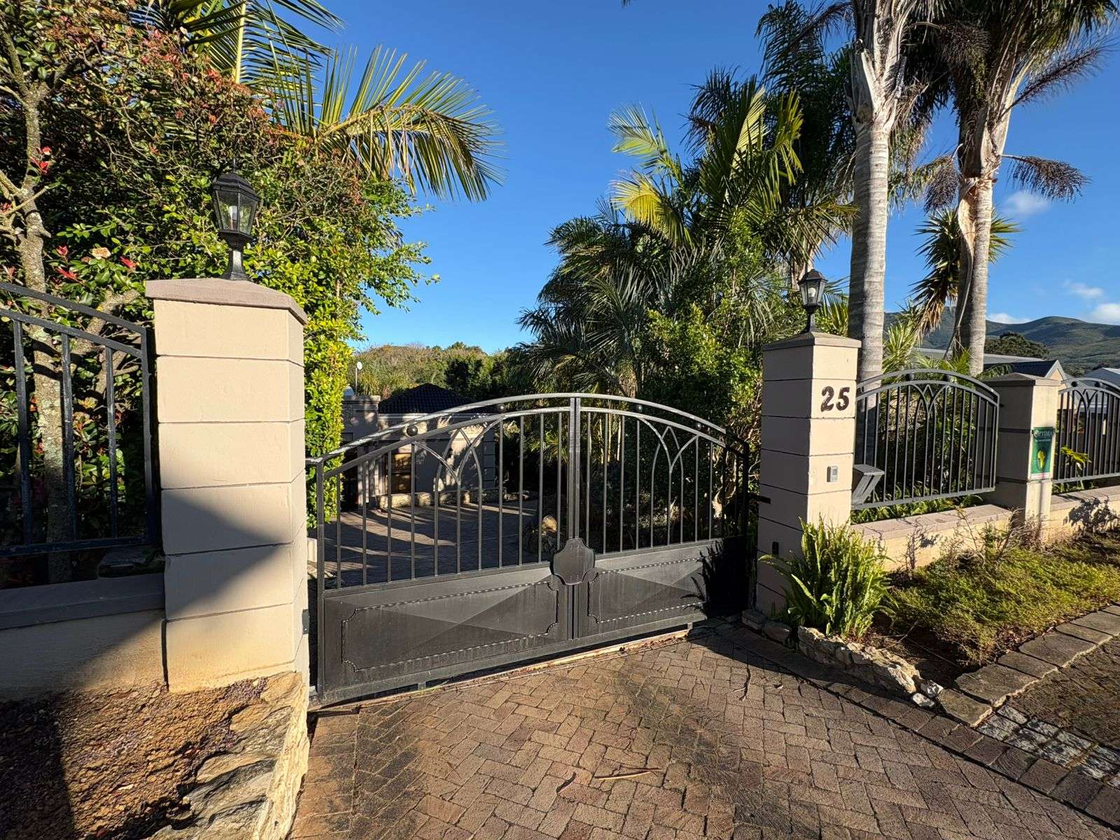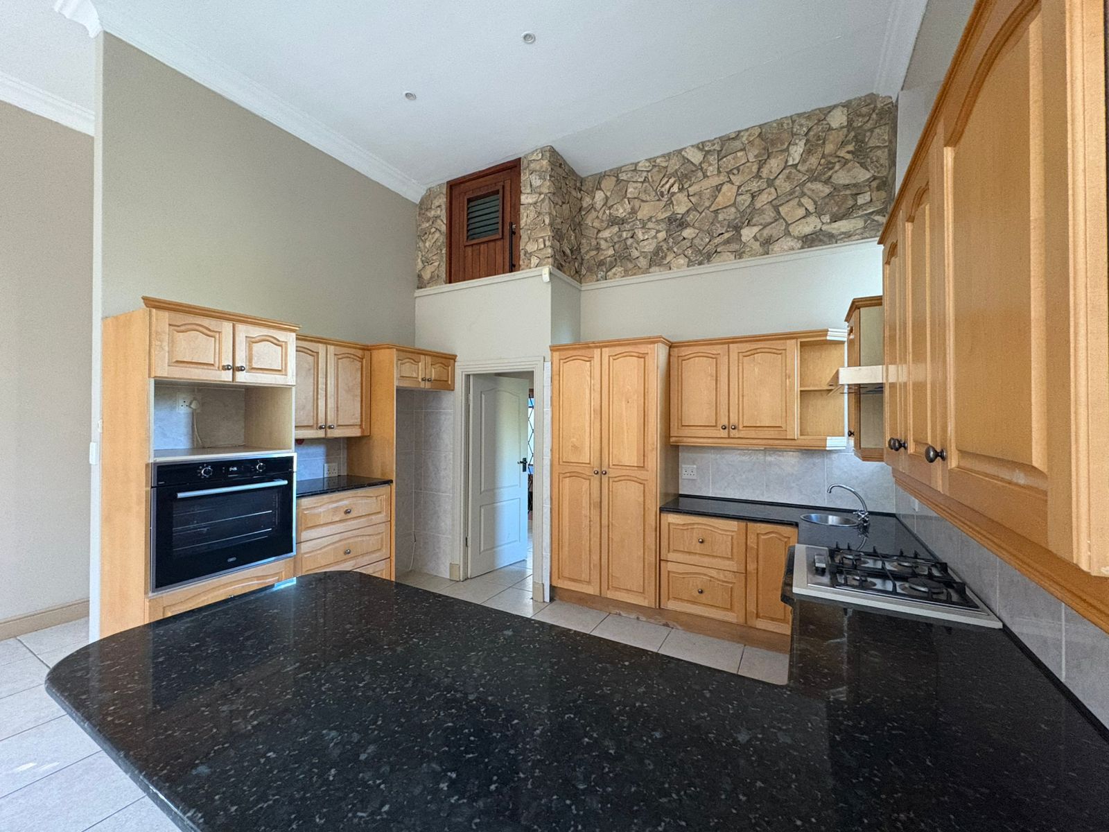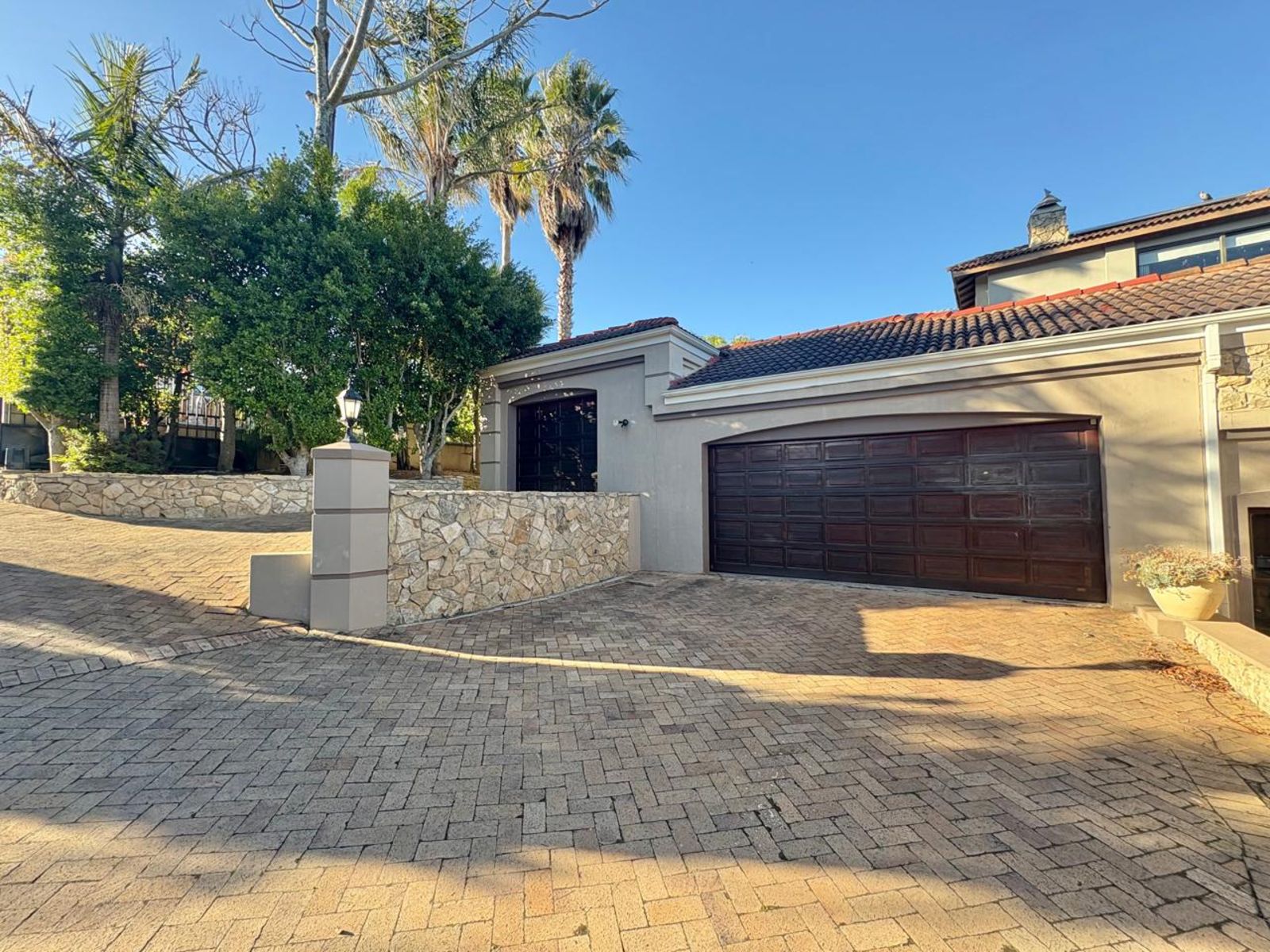 Indoor braai room with large balcony and an outdoor fire pit below which overlooks your swimming pool. Tall palm trees grace the boundary and entrance where a water feature flows. The custom stonework and ironwork adds to the beautiful villa aesthetics.