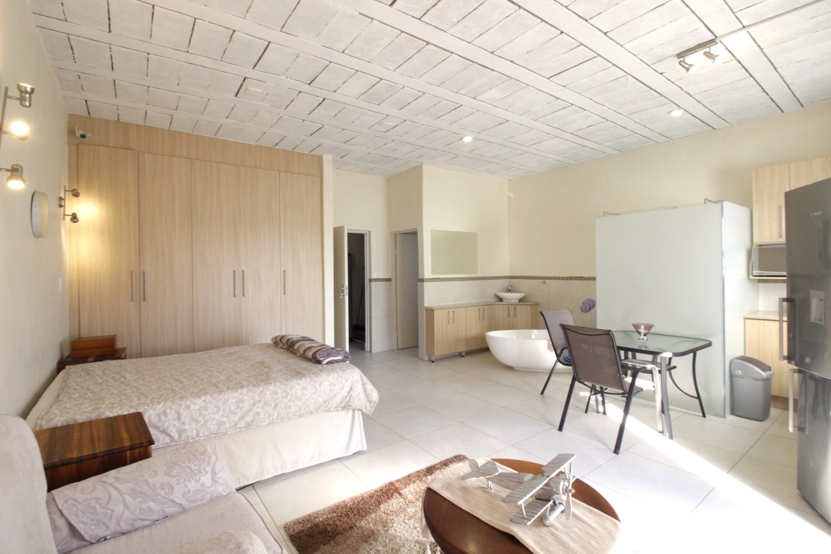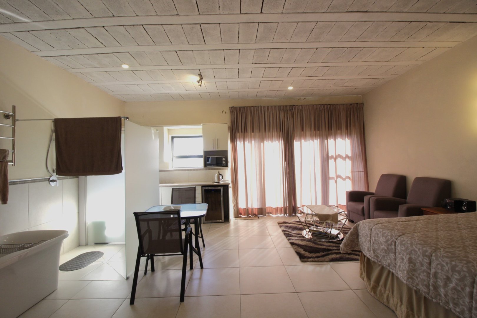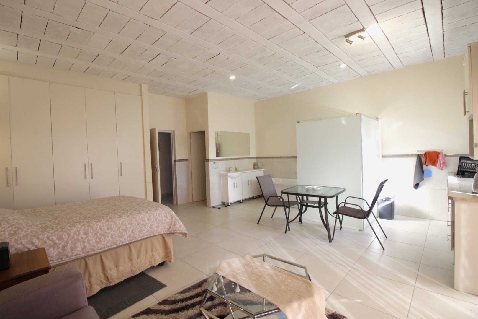 The ground level offers two very spacious open-concept rooms that are perfect for your guests. Each room has an en-suite bathroom, lounge area, and kitchenette. Plenty of cupboards complete this picture.